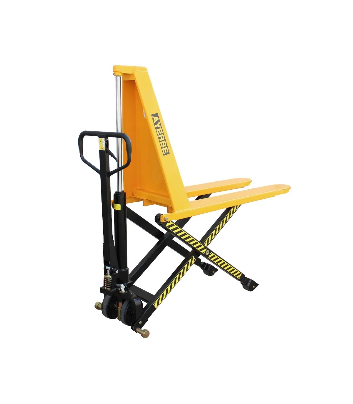La transpaleta elevadora manual garantiza un trabajo en altura seguro ya que, sus ruedas están equipadas con estabilizadores que fijan automáticamente la transpaleta cuando esta alcanza su altura máxima de elevación. La elevación se produce gracias al cilindro hidráulico de la transpaleta, no requiere mucho esfuerzo y permite mantener las cargas en una posición ergonómica. Gracias a este sistema, se aumenta la productividad y se agiliza la organización de mercancías.