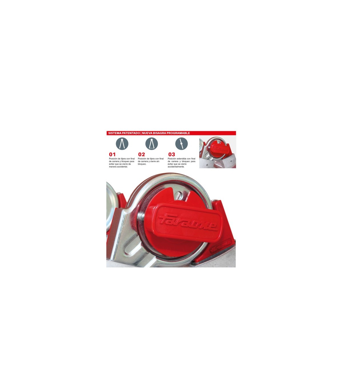 Tiene un sistema de bisagras patentado que puede programarse para las dos posiciones que dispone el producto; con sistema de bloqueo para evitar el cierre de manera inesperada.