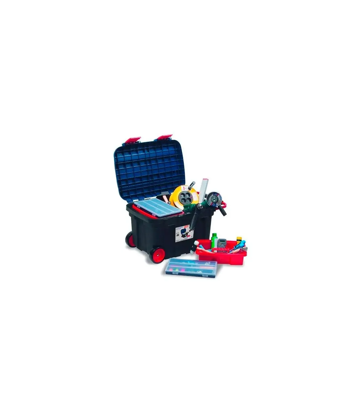 Cofre de herramientas con ruedas Tayg Nº51 de polipropileno en color negro con dos bandejas y dos estuches en color rojo.