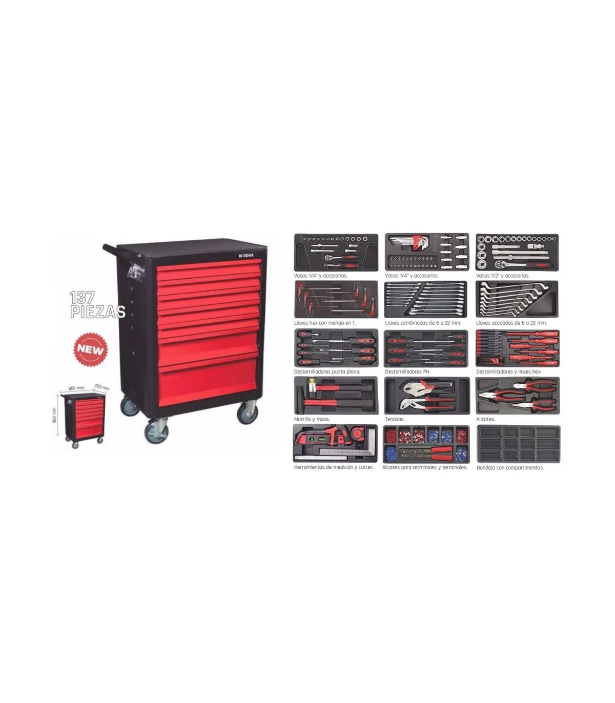 Carro equipado con 206 herramientas y 6 cajones IRIMO, llave de seguridad y ruedas grandes