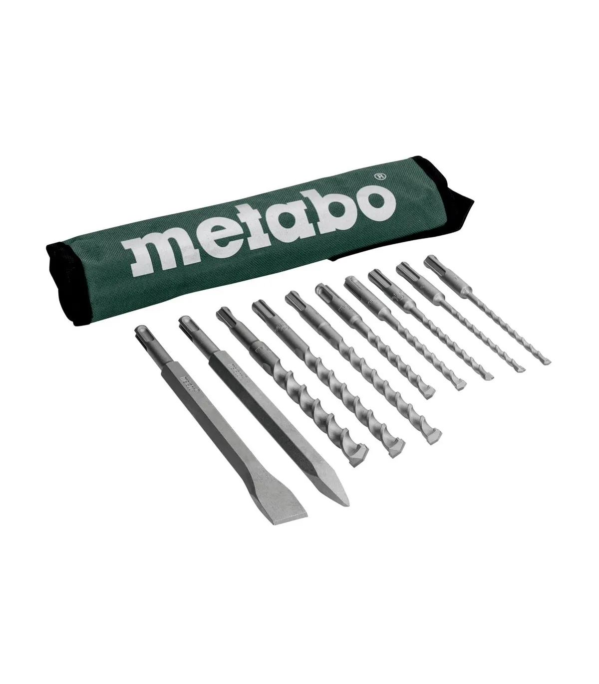 Práctico juego con 8 brocas y 2 cinceles Metabo SDS-Plus en bolsa textil enrollable.