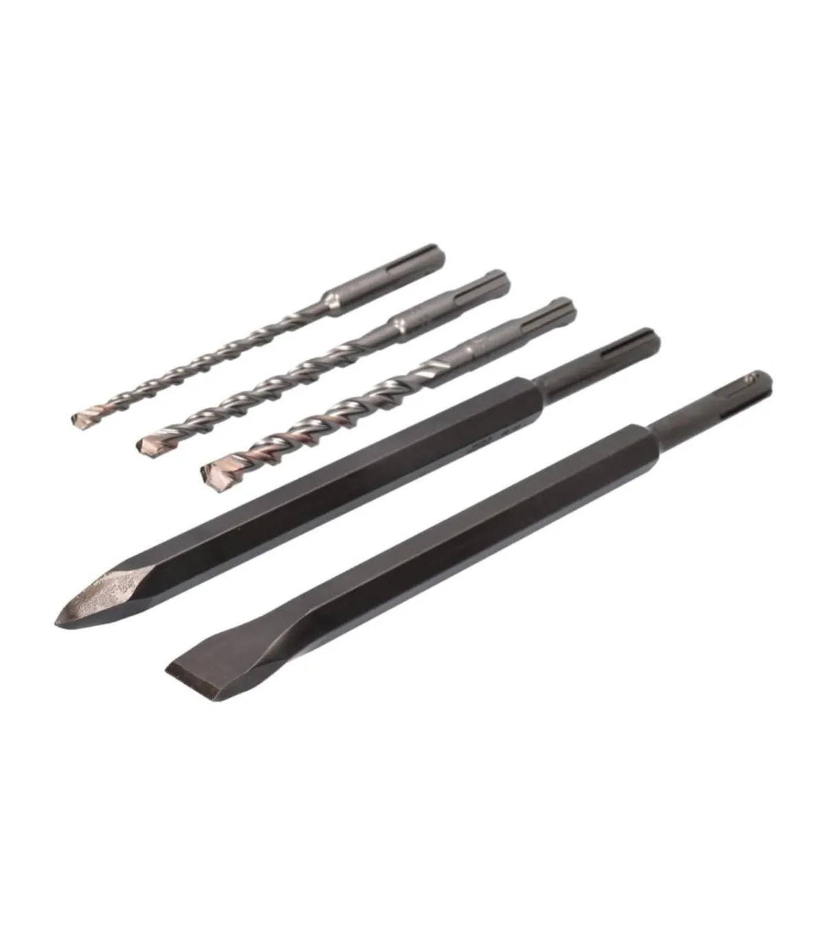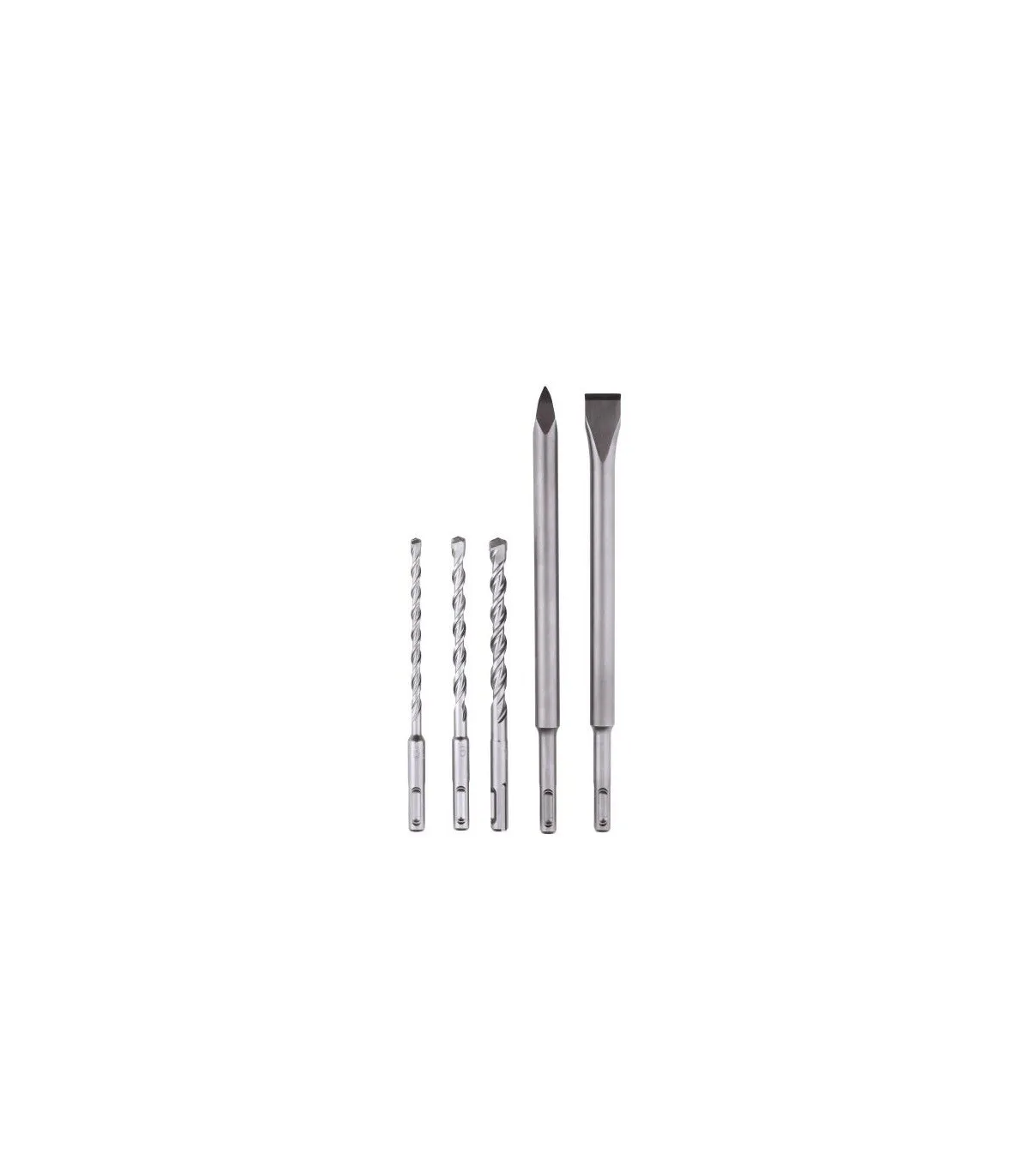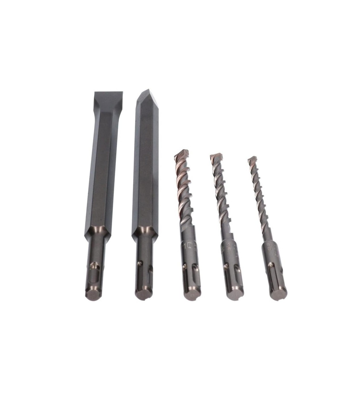 Compuesto de respectivamente 1 broca para martillo ø 6x160 mm, 8x160 mm, 10x160 mm, 1 cincel puntiagudo 250 mm y 1 cincel plano 250x 20 mm.