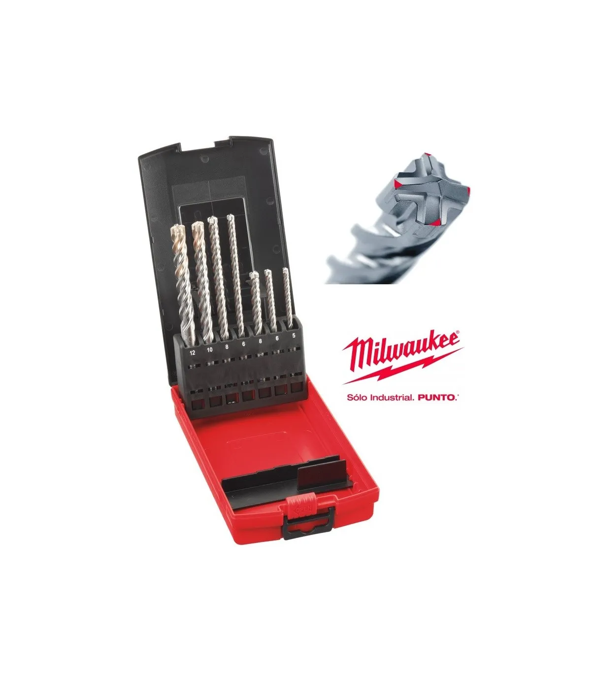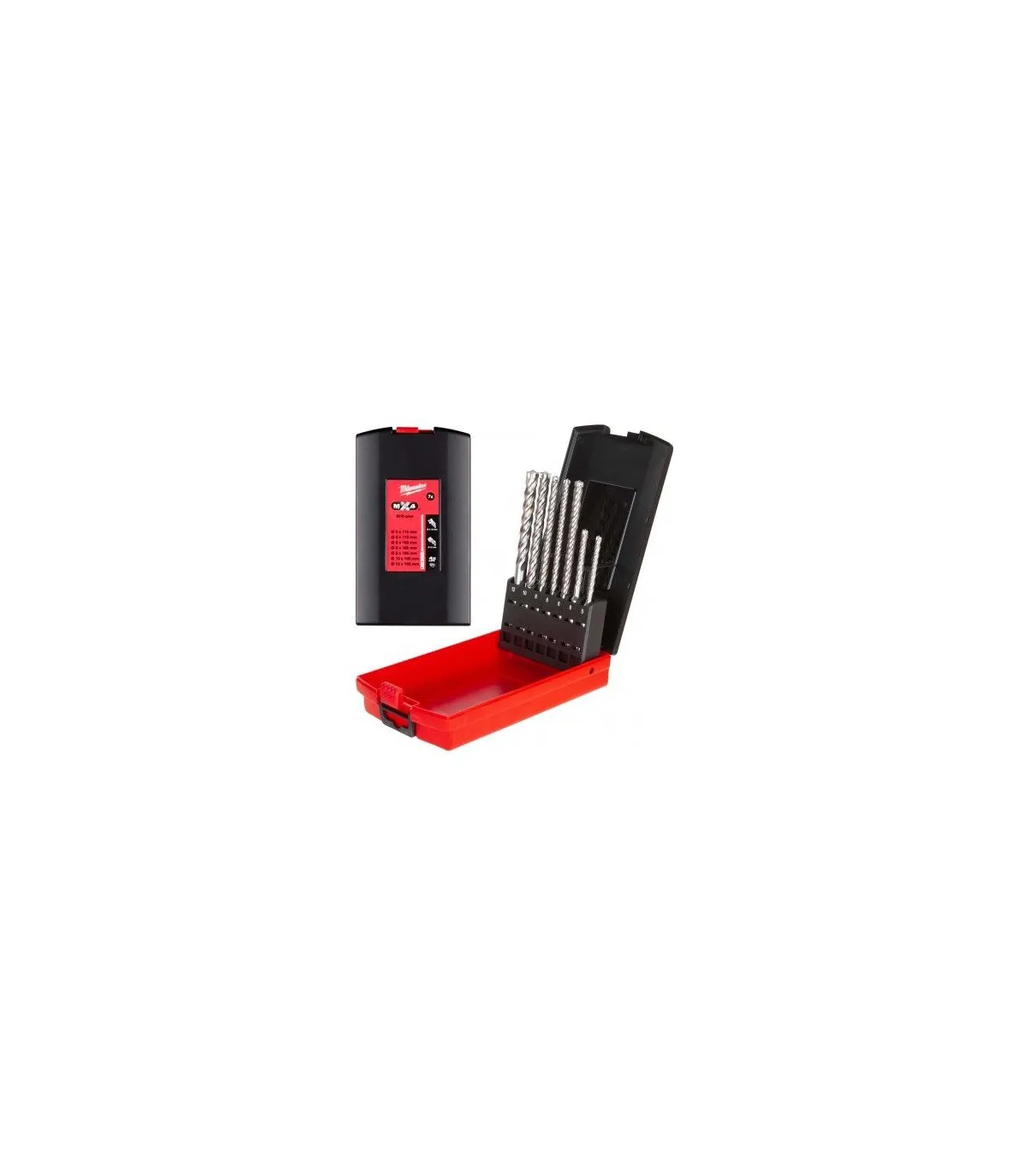 Robusto estuche con 7 brocas amarre SDS-Plus de 4 cortes, especial hormigón armado y alto rendimiento.