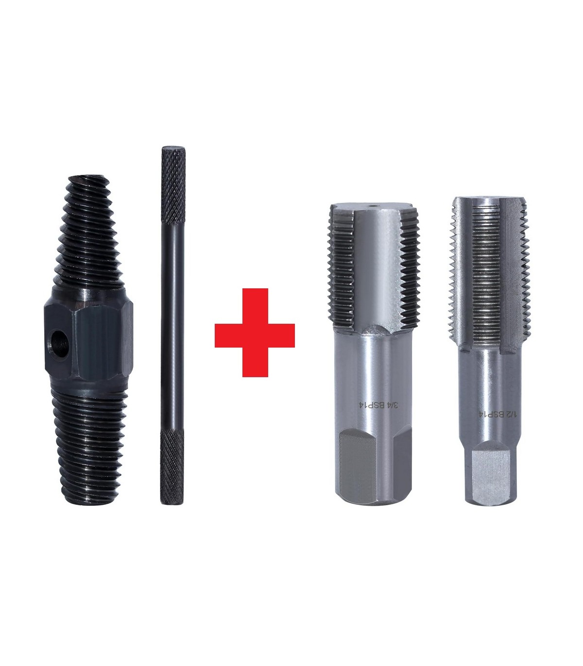 Este kit lleva 2 machos para repasar, limpiar y reparar las roscas hembra tras la extracción de la pieza obstruida (rácor o grifo rotos). Estos machos no tienen calidad suficiente para aprovecharlos para mecanizado o fabricación de roscas nuevas. Lubricar siempre con su uso.