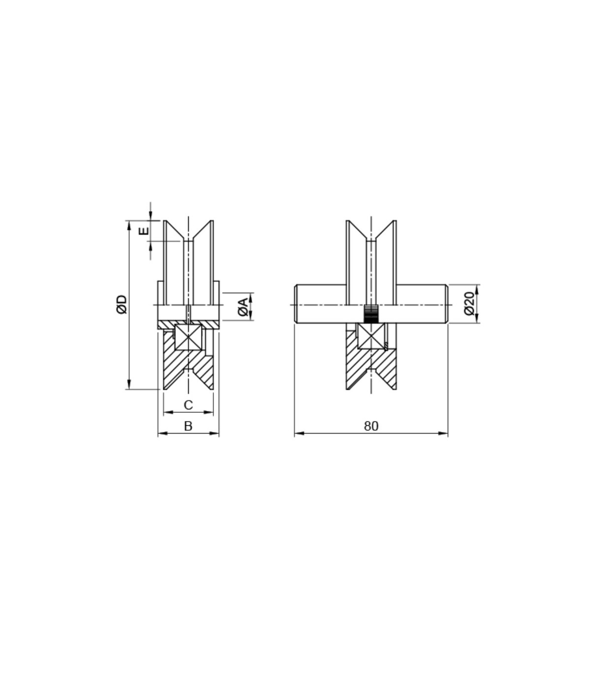 POLEA RUEDA GUIA PUERTA C/ROD 100X26 E-16 Canal Angular "V"