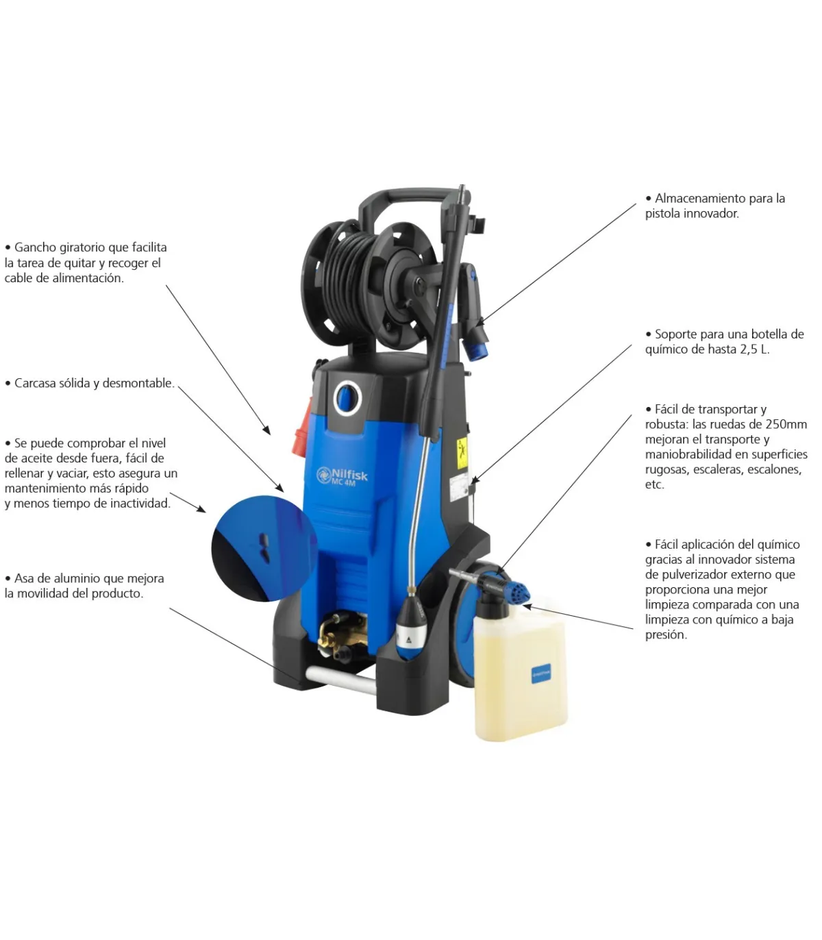 •     La bomba del depósito de aceite lleva un visor de nivel de aceite y una función de llenado y vaciado.