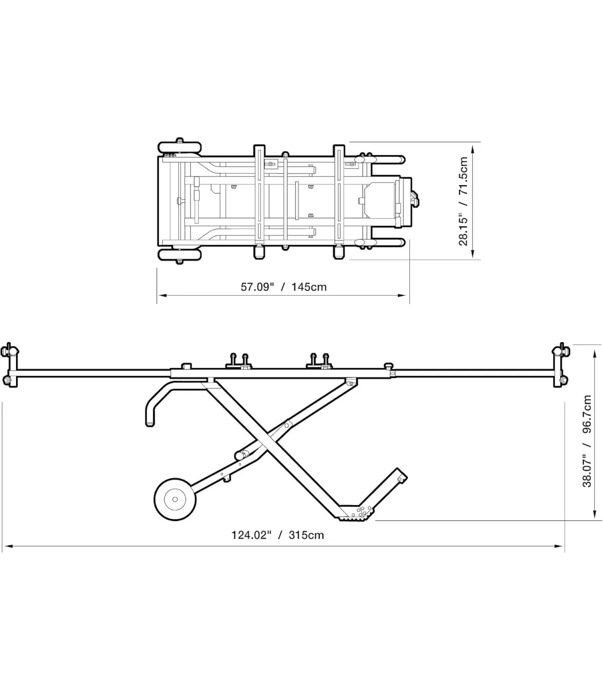 Abierto (extendido): 124,02” x 28,15” x 38,07”.