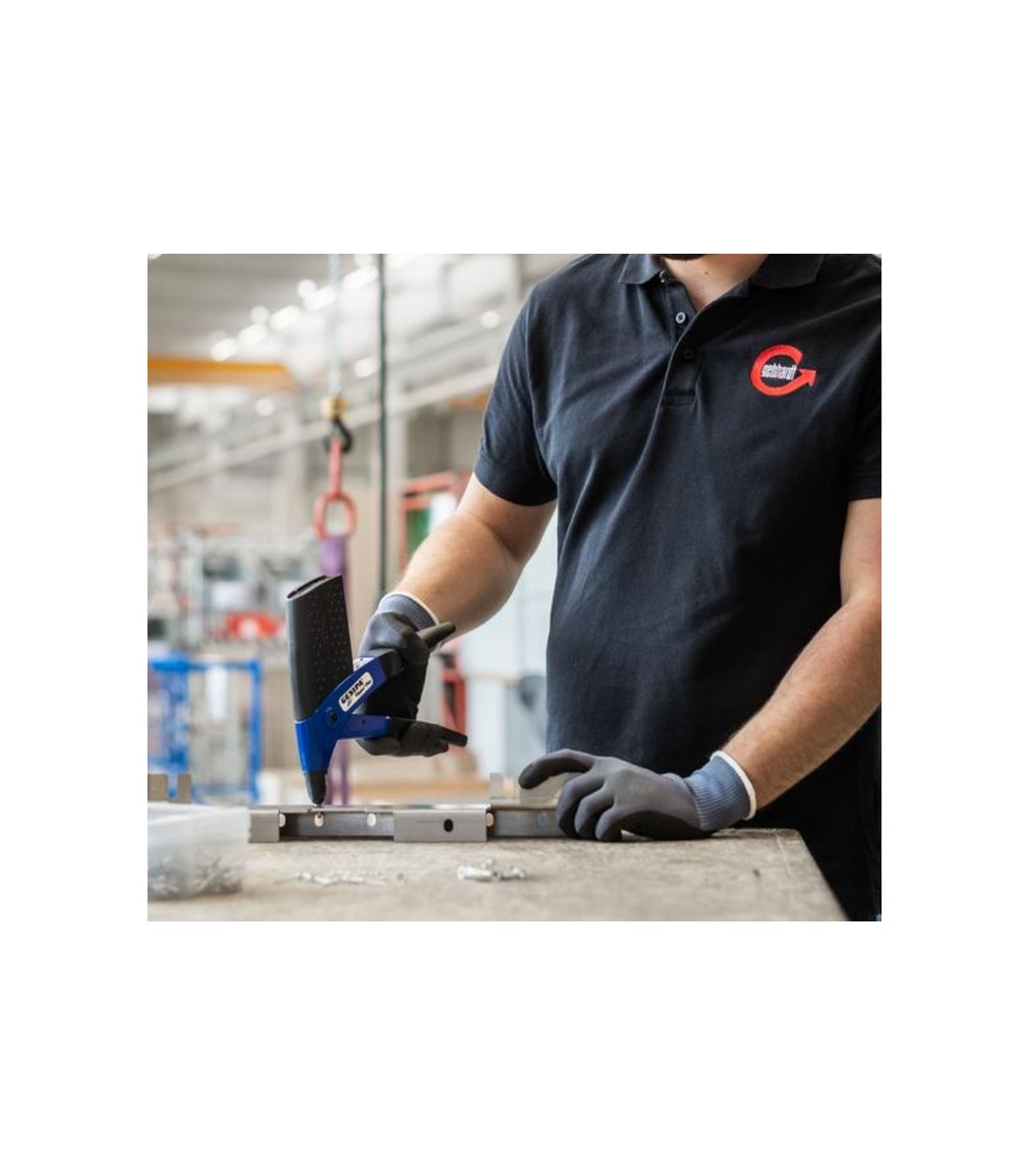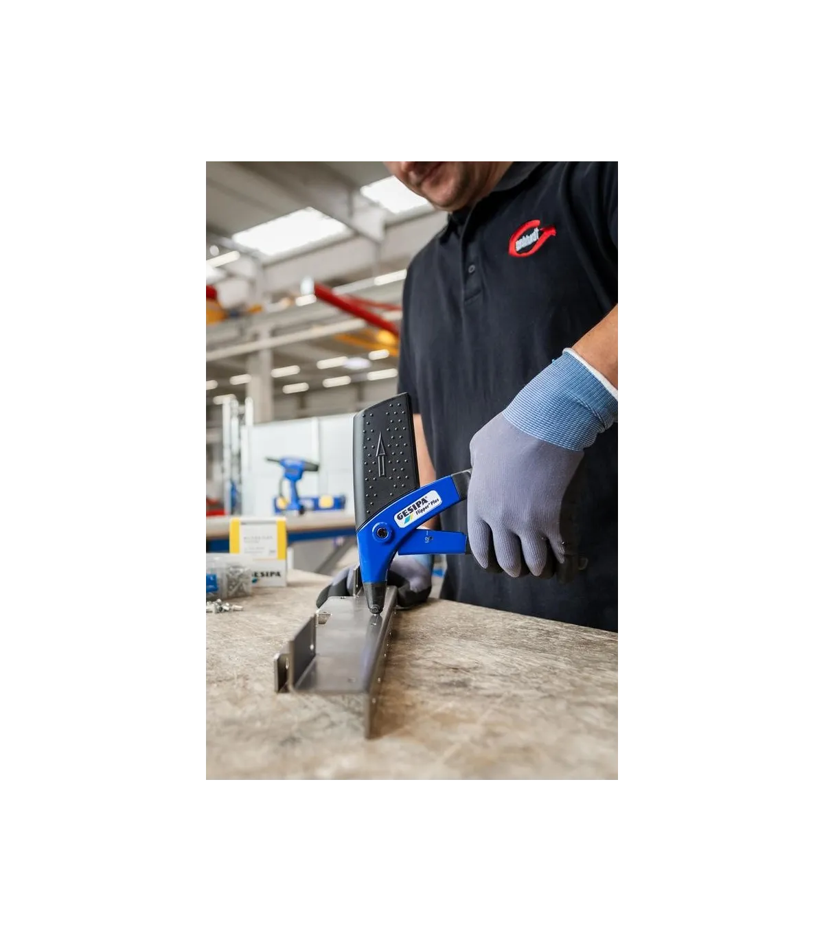 Remachadora de diseño ergonómico, cuyo esfuerzo manual requerido se reduce aproximadamente en un 40% gracias a su mecanismo inteligente.