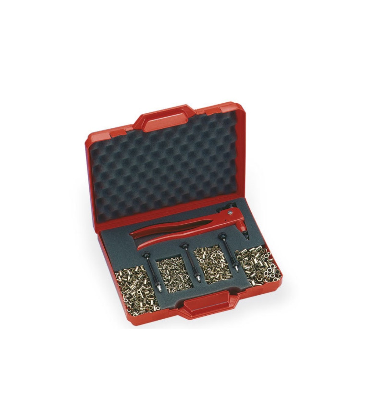 Viene con surtido de remaches en acero, práctico maletín y manual de instrucciones multilingüe.