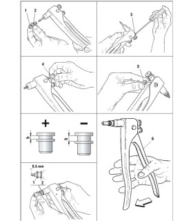 Tenaza para tuercas remachables GMB 5. Fácil ajuste de la carrera. Rápido cambio de los mandriles sin necesidad de herramientas. Cuerpo de la tenaza: fundición de aluminio de alta calidad. Brazos de la tenaza: acero, forjado. Tuercas remachables de M4 a M6 en aluminio y hasta M5 en acero y acero inox.