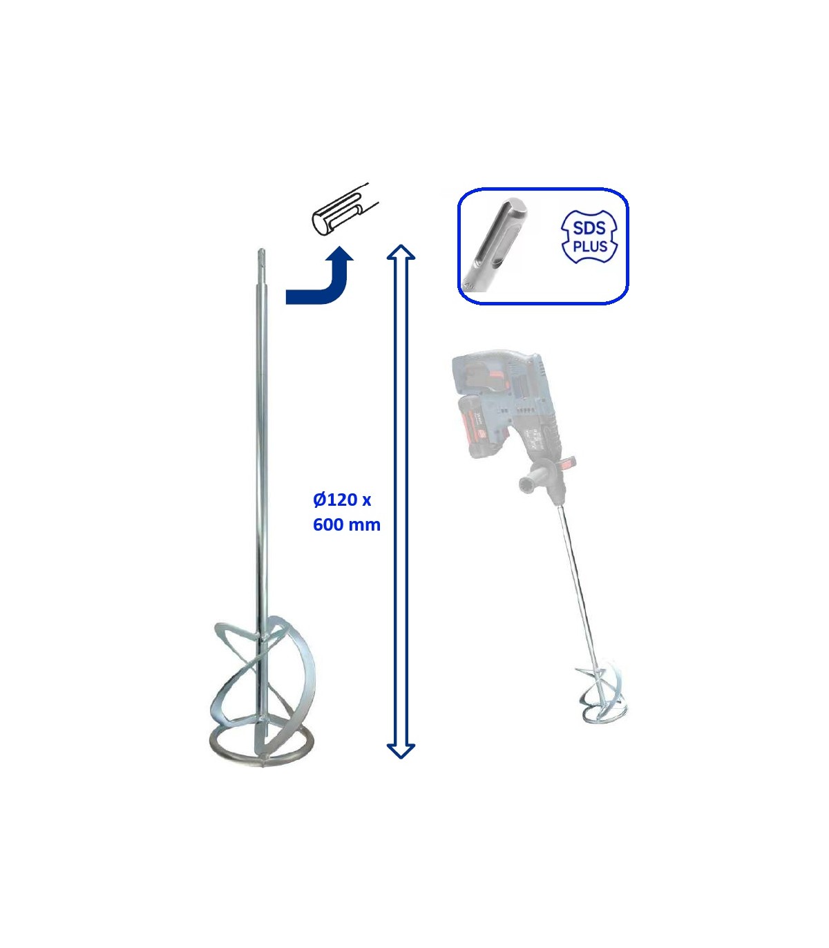 Varilla mezcladora de Ø120mm, una longitud de hasta 600 mm y con enganche SDS+ PLUS para martillos construcción