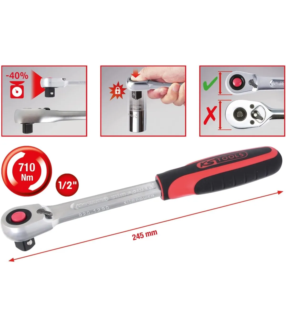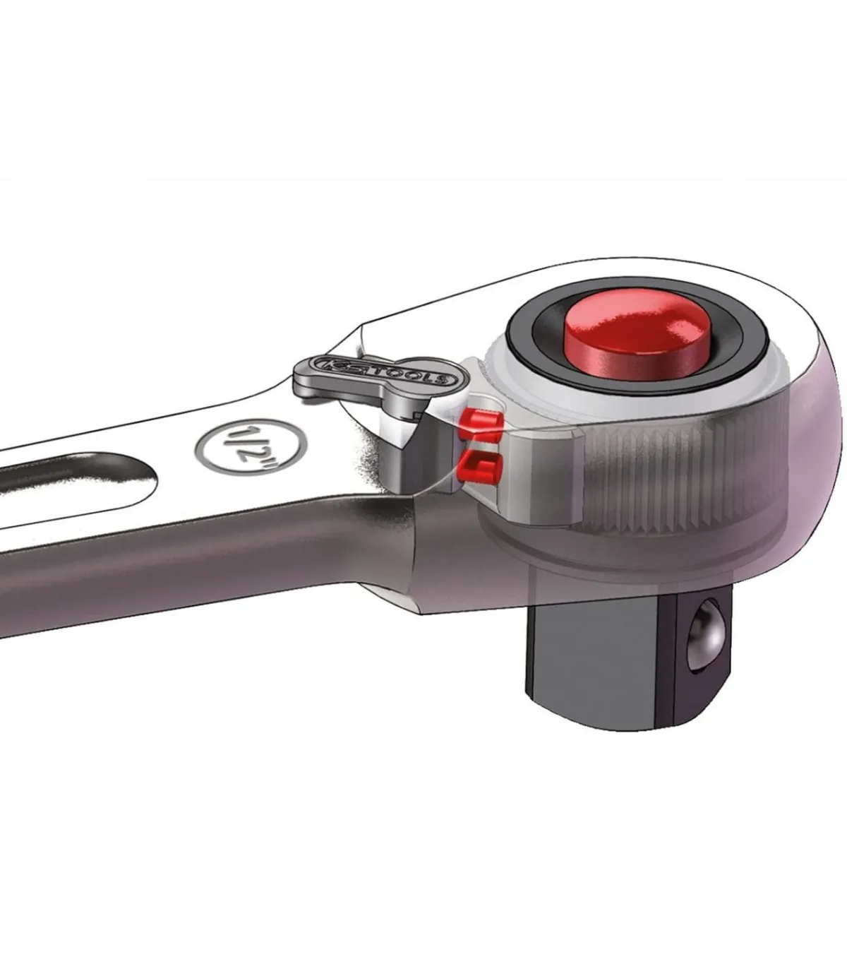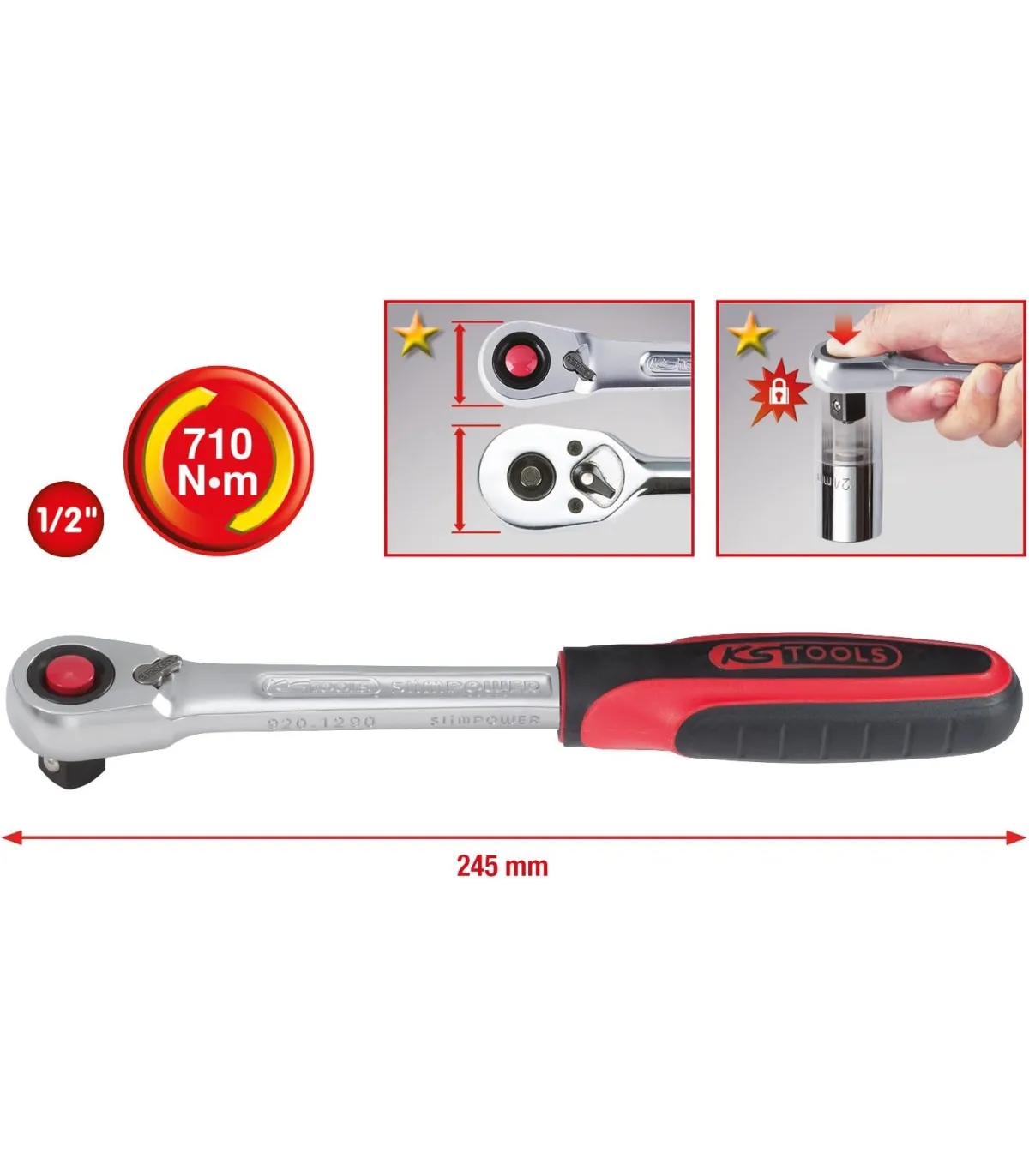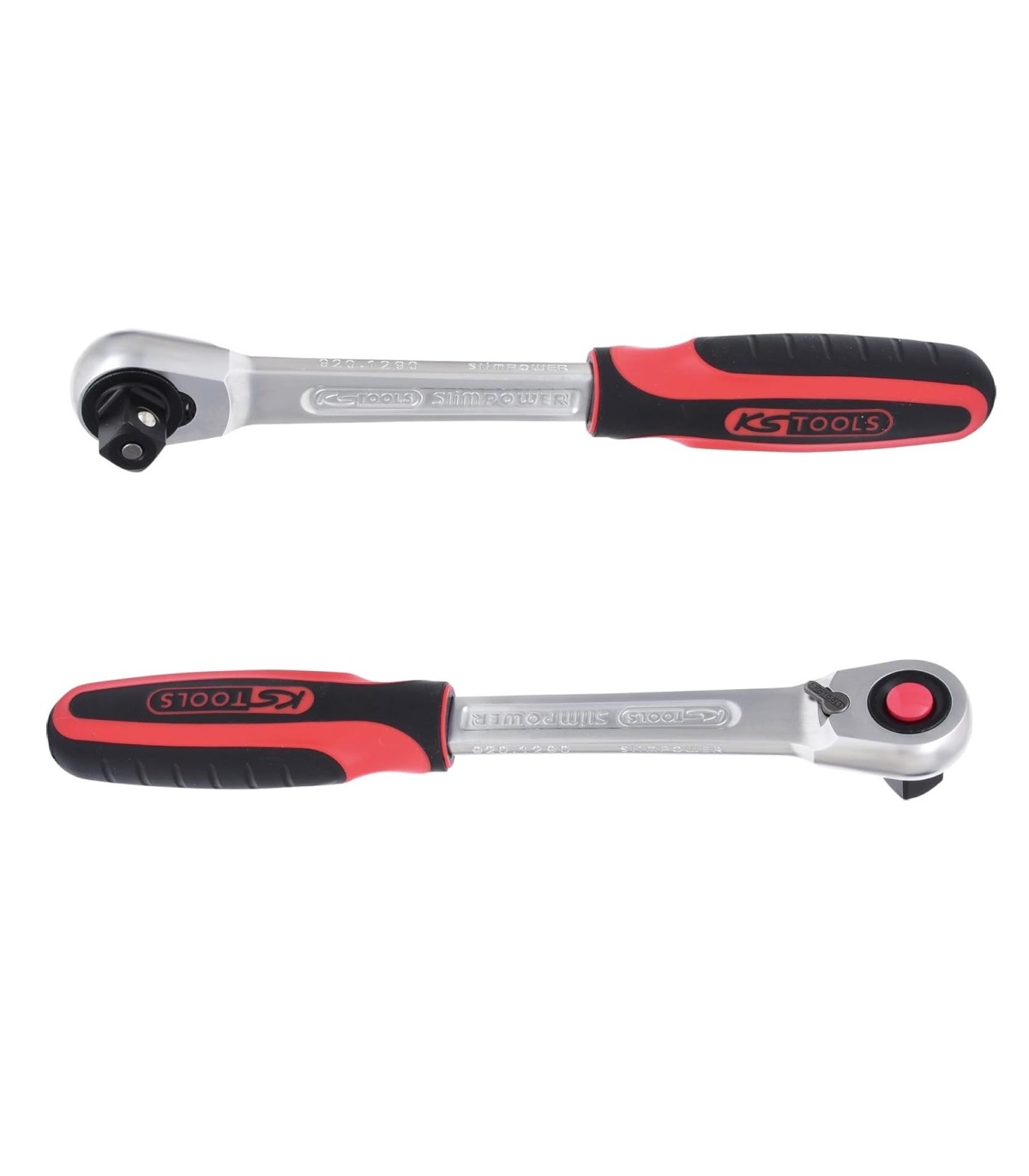 Carraca compacta de cabeza estrecha con 72 dientes y botón expulsor. Mango en  bimaterial. Primera marca KS TOOLS.