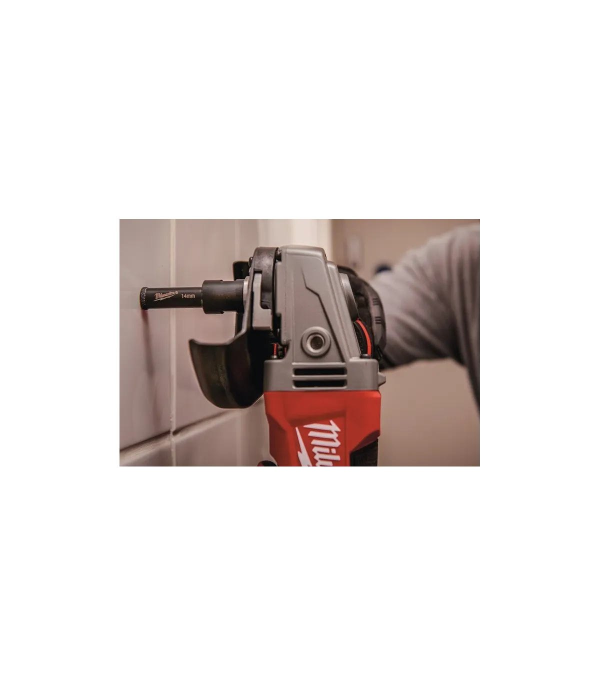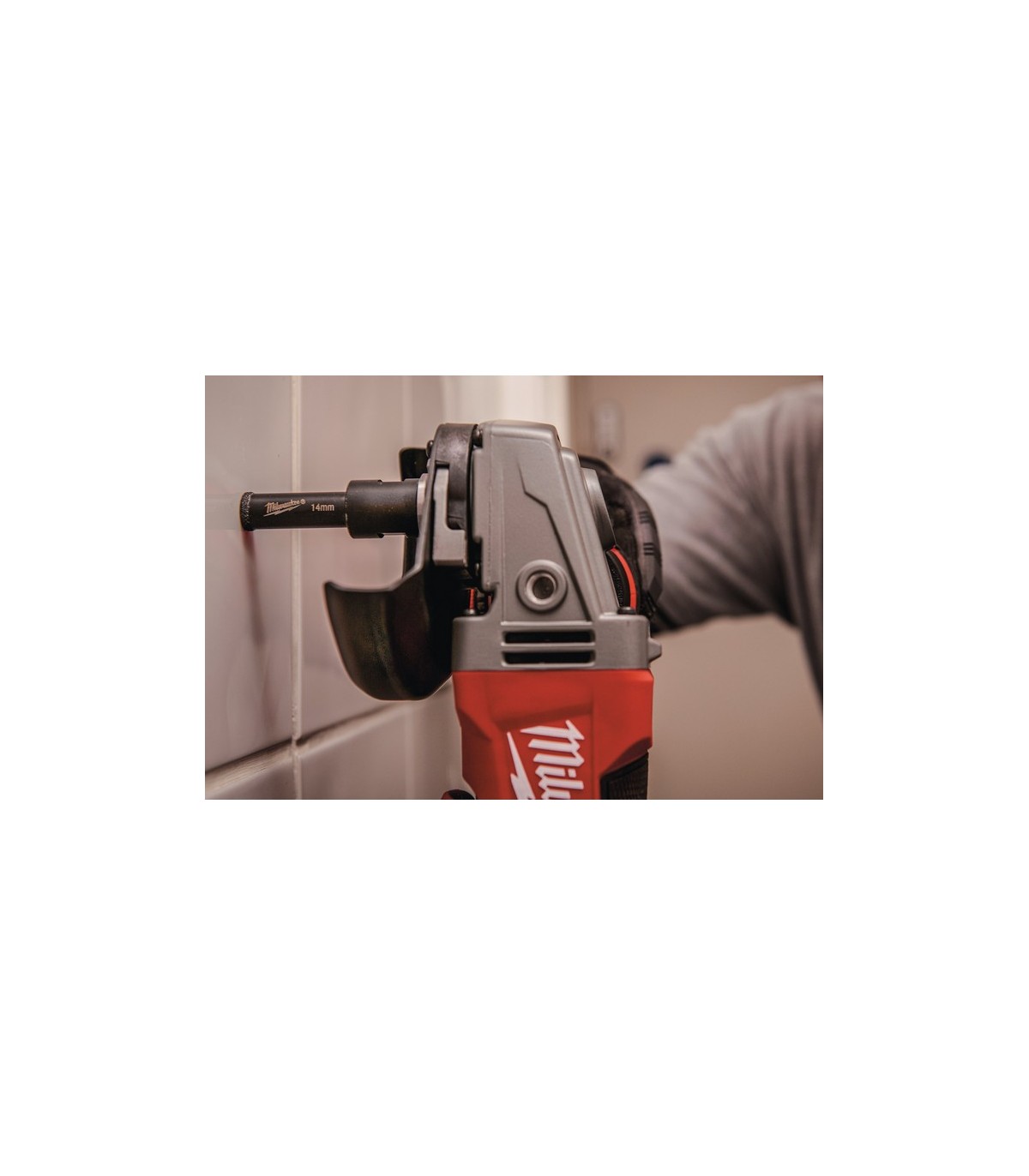 1. Retirar de la miniamoladora la tuerca y el soporte de esta. Bloquear el eje de la miniamoladora y anclar directamente la broca en el eje M14, asegurándola con la ayuda de una llave. Si por el contrario vamos a utilizar la pulidora M12™ de MILWAUKEE®, primero coloque el adaptador 4932472090 y ancle la broca en este, asegurándola también con una llave