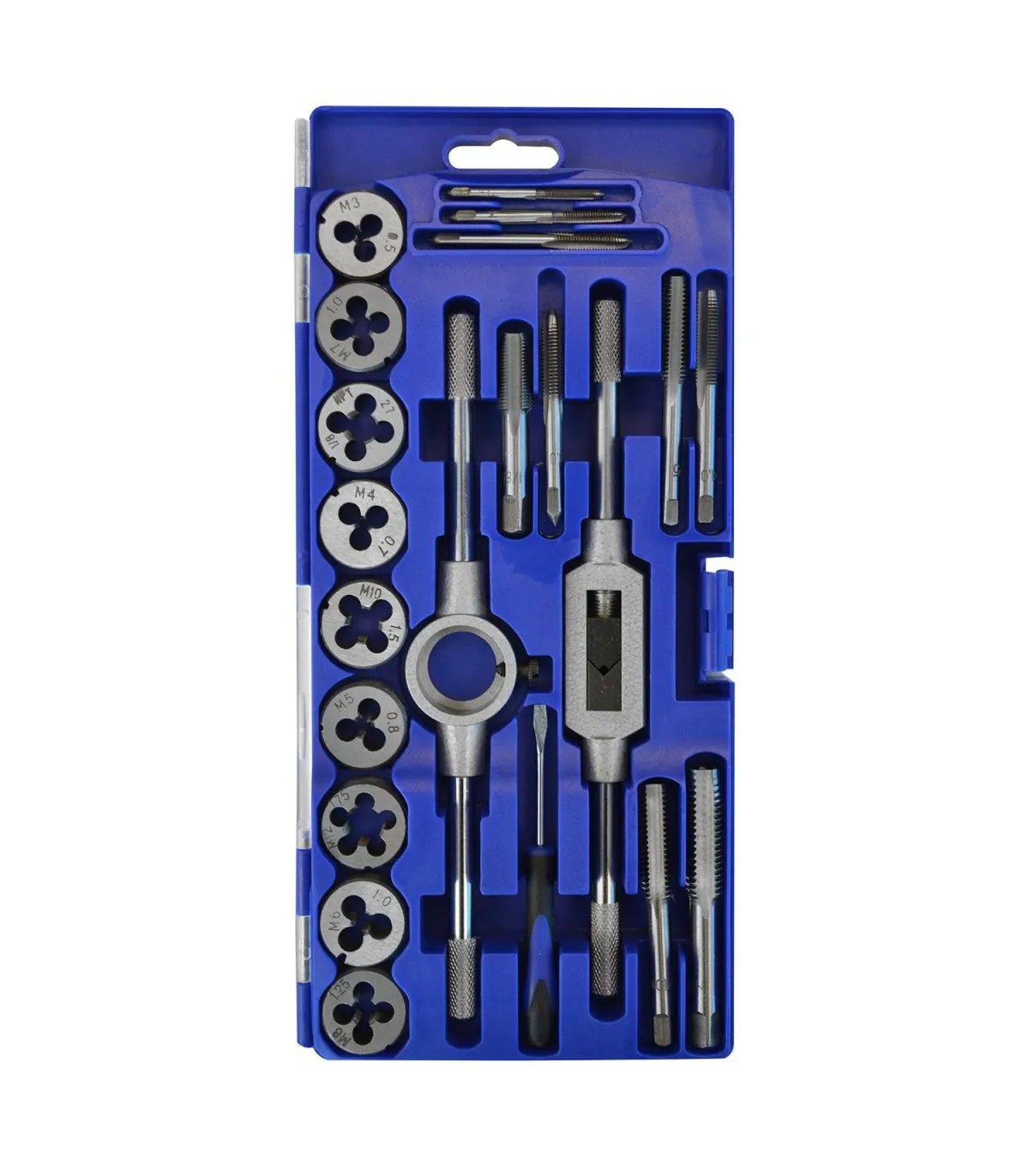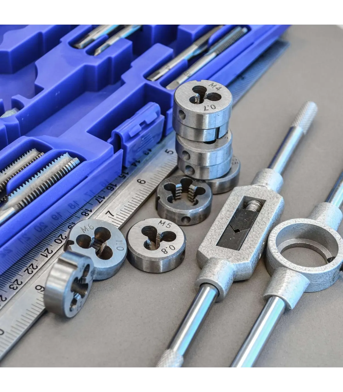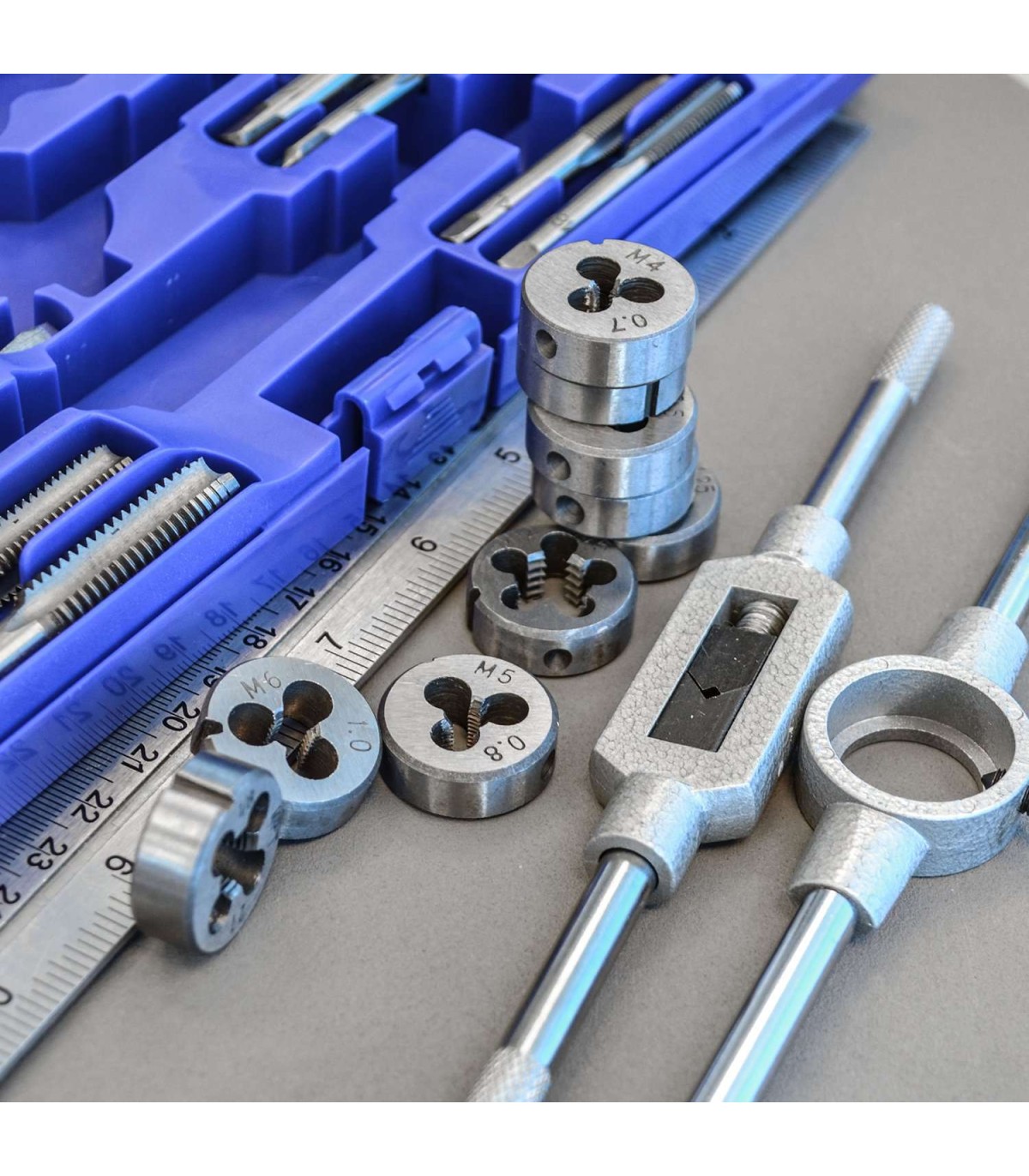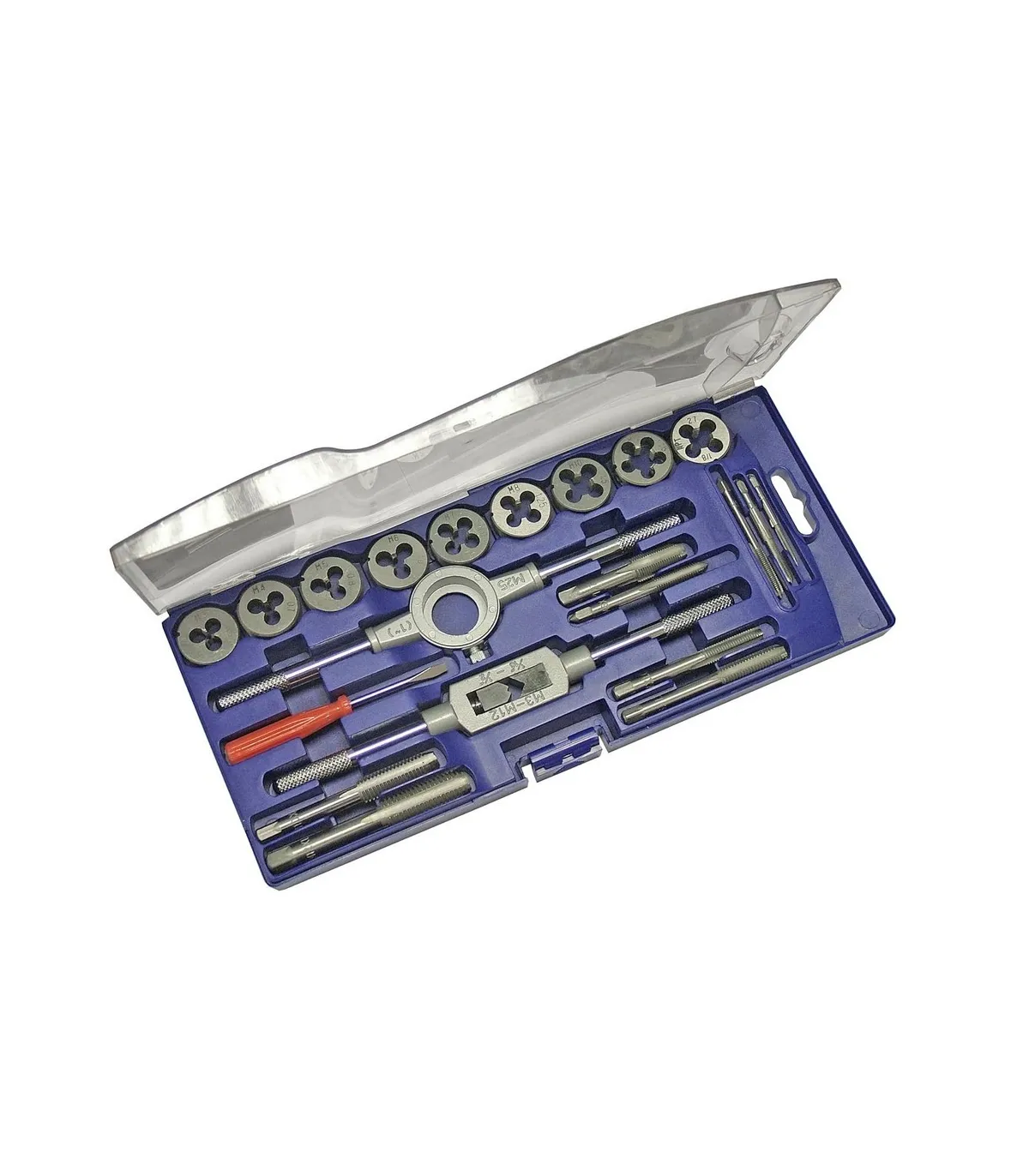 Es un estuche con machos y terrajas de roscar desde M3 a M12 para uso y servicio puntual no industrial.