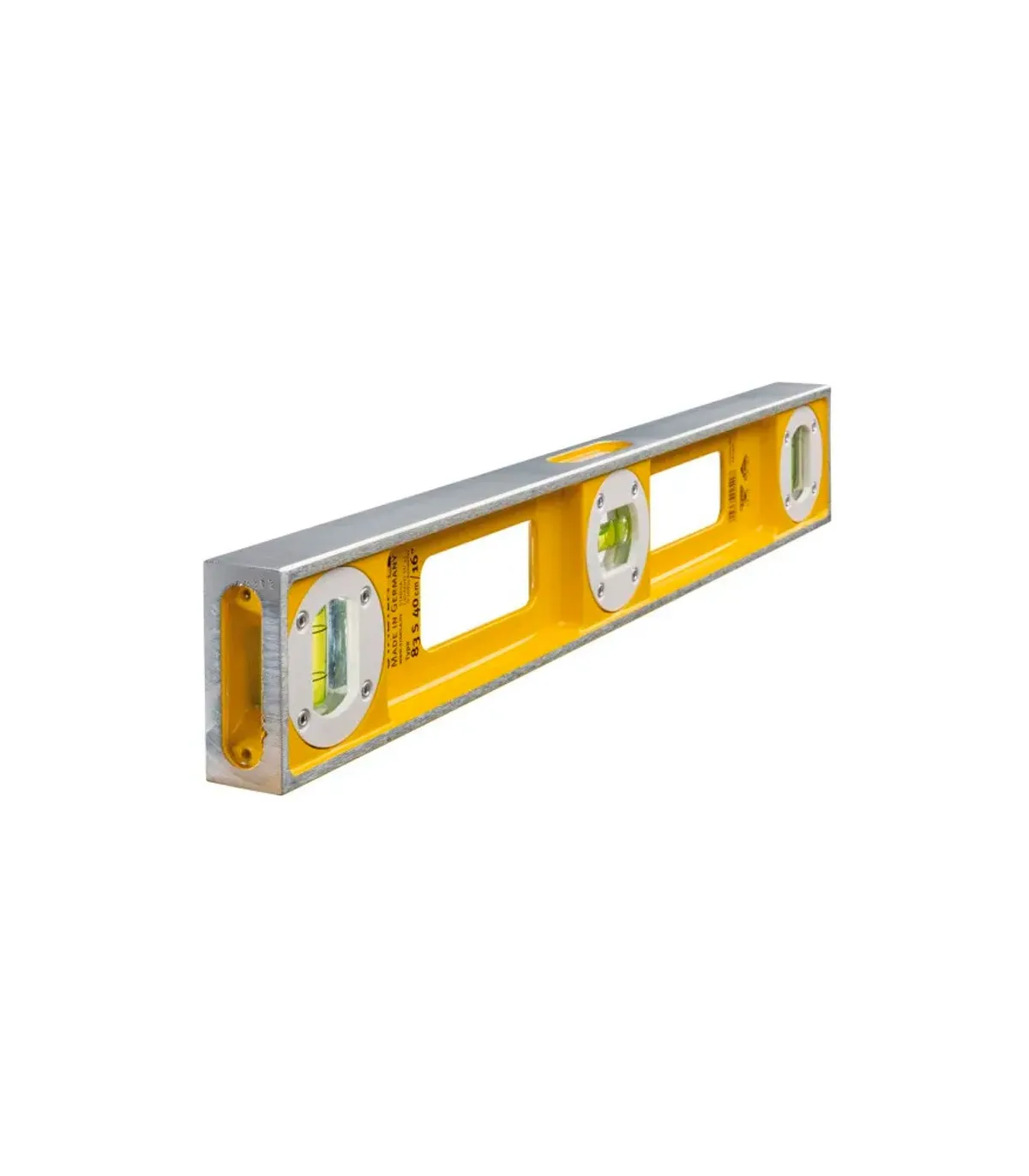 El nivel modelo 83 S ha sido desarrollado específicamente para resistir las duras condiciones de trabajo en la construcción. Presenta una larga vida útil gracias a su perfil extremadamente robusto de aluminio de fundición. La lectura de las burbujas desde todos los ángulos resulta sumamente práctica a la hora de alinear y ajustar elementos de construcción. Durante el proceso de fabricación las tres burbujas y las dos superficies de medición de precisión se alinean entre sí con exactitud para garantizar la máxima precisión en la medición durante muchos años. Es lógico que los profesionales estén encantados con este nivel de burbuja.