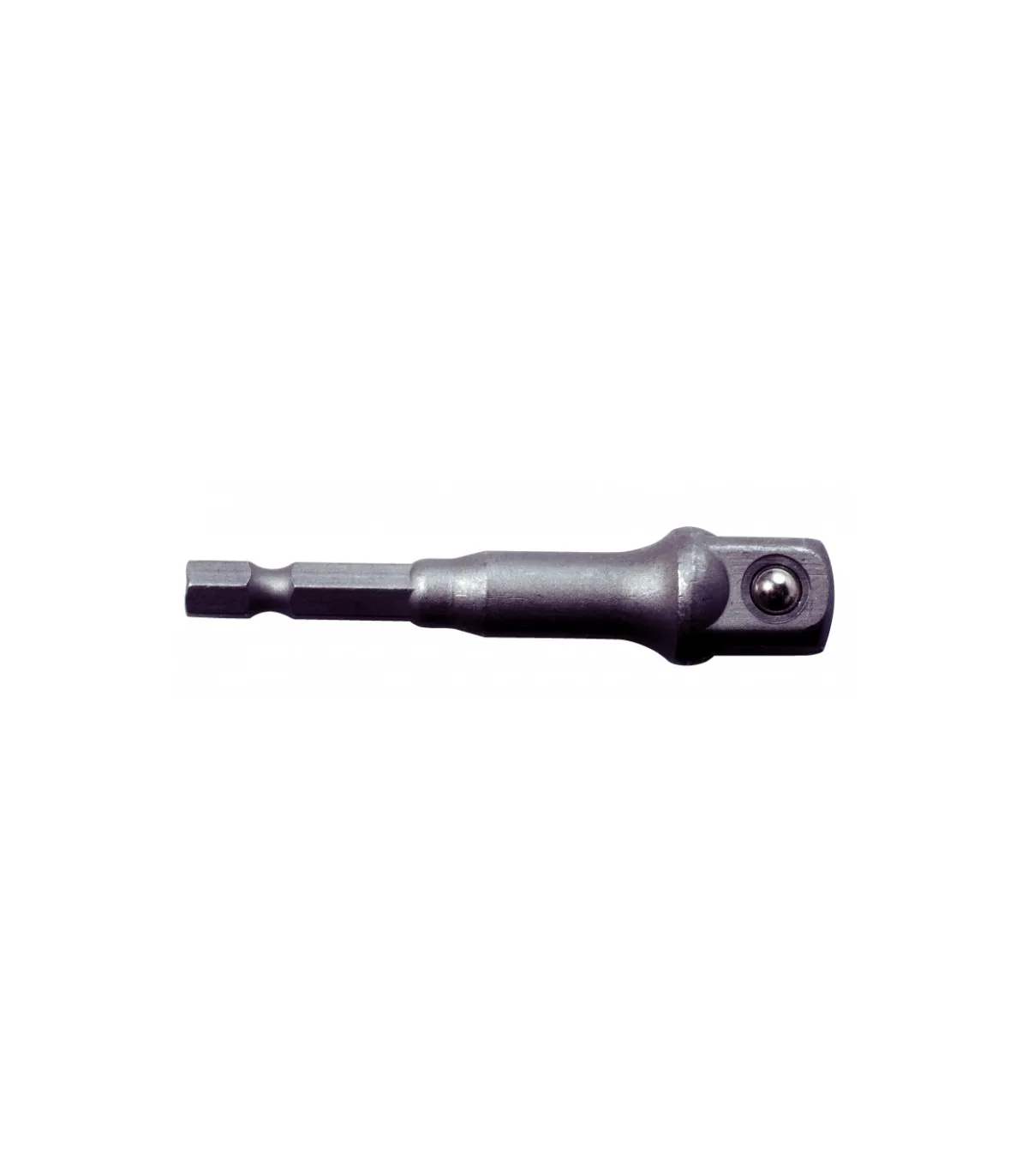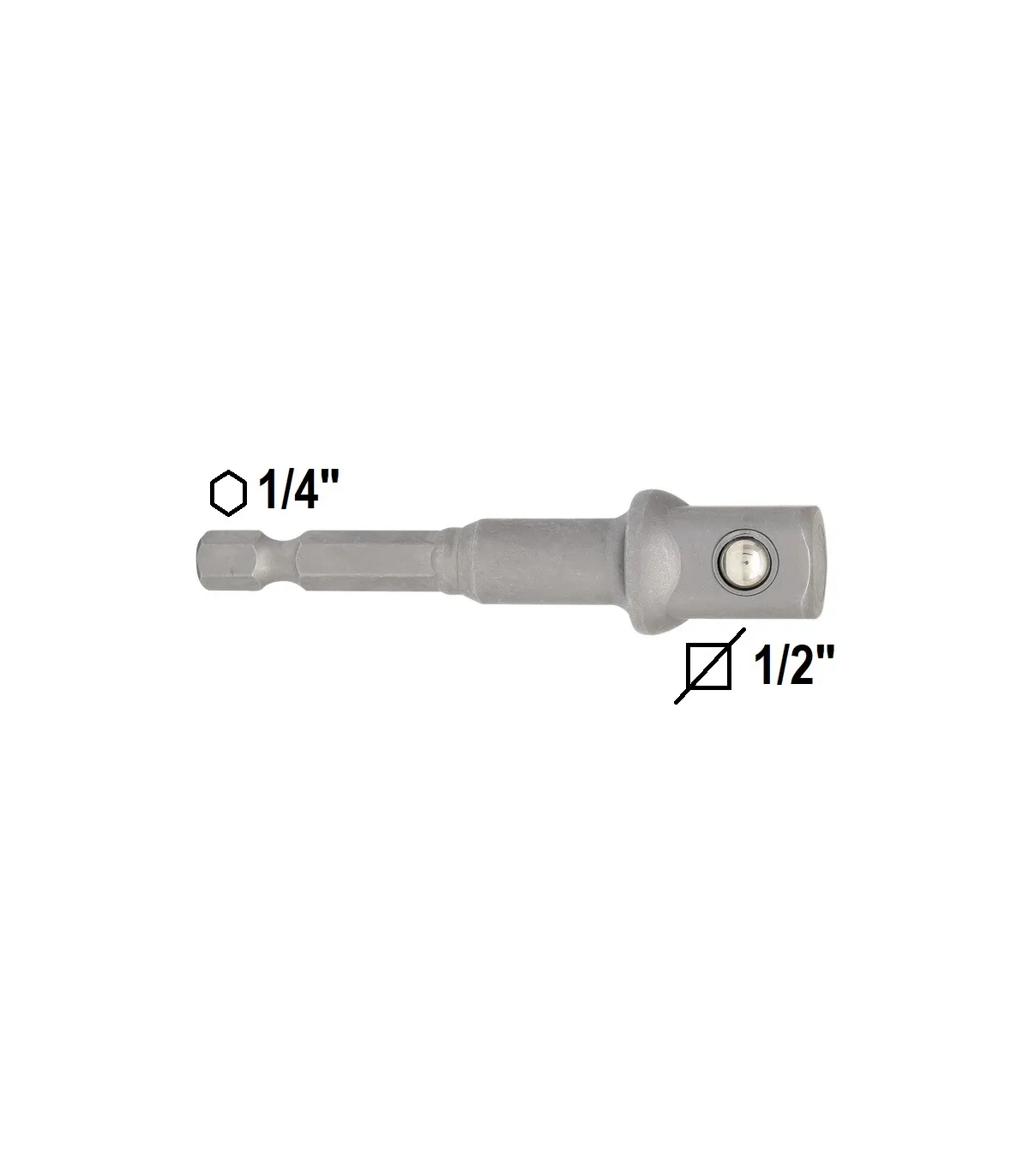 Adaptador con inserción hexagonal 1/4" para atornilladores manuales o máquina con salida para vasos cuadradillo 1/2" -equivale a cuadrado de vaso de unos 12,5-13mm-.