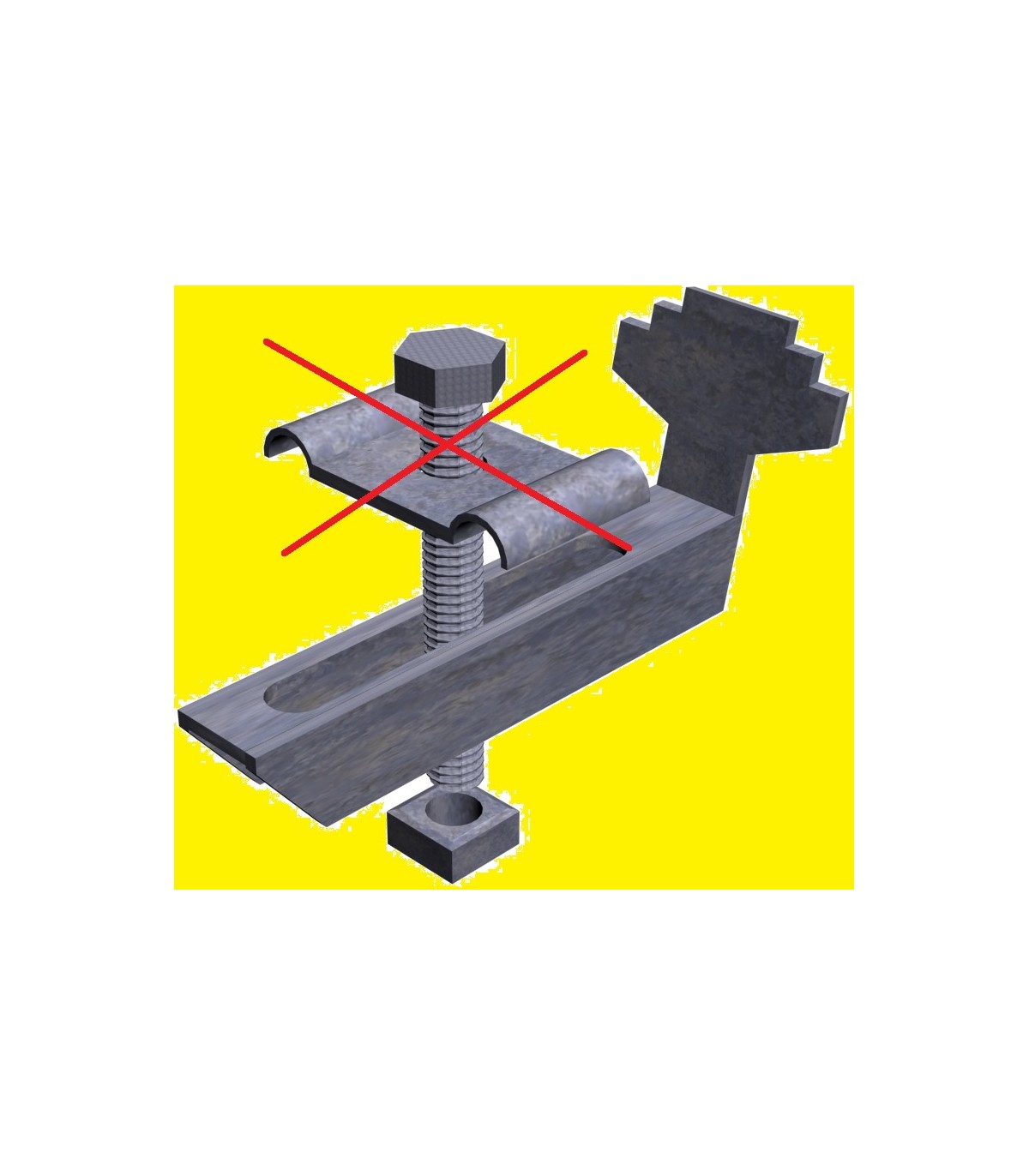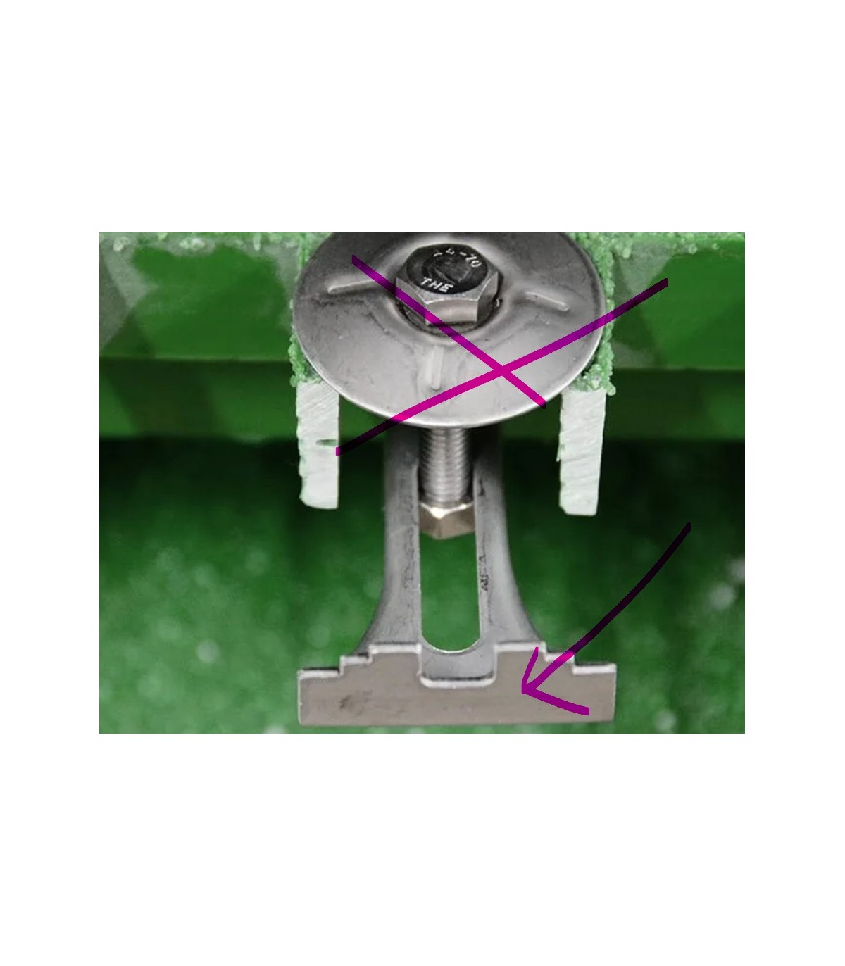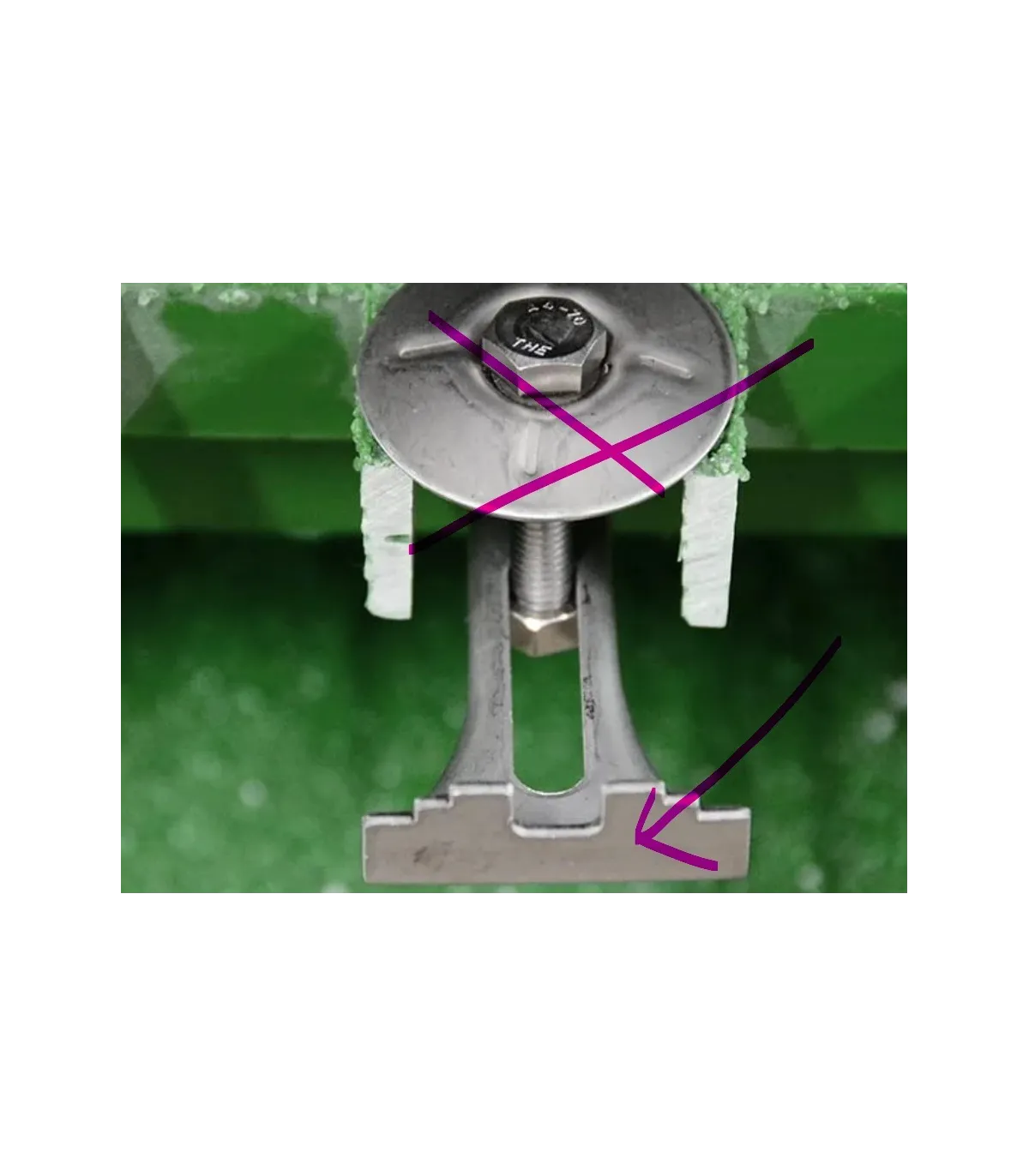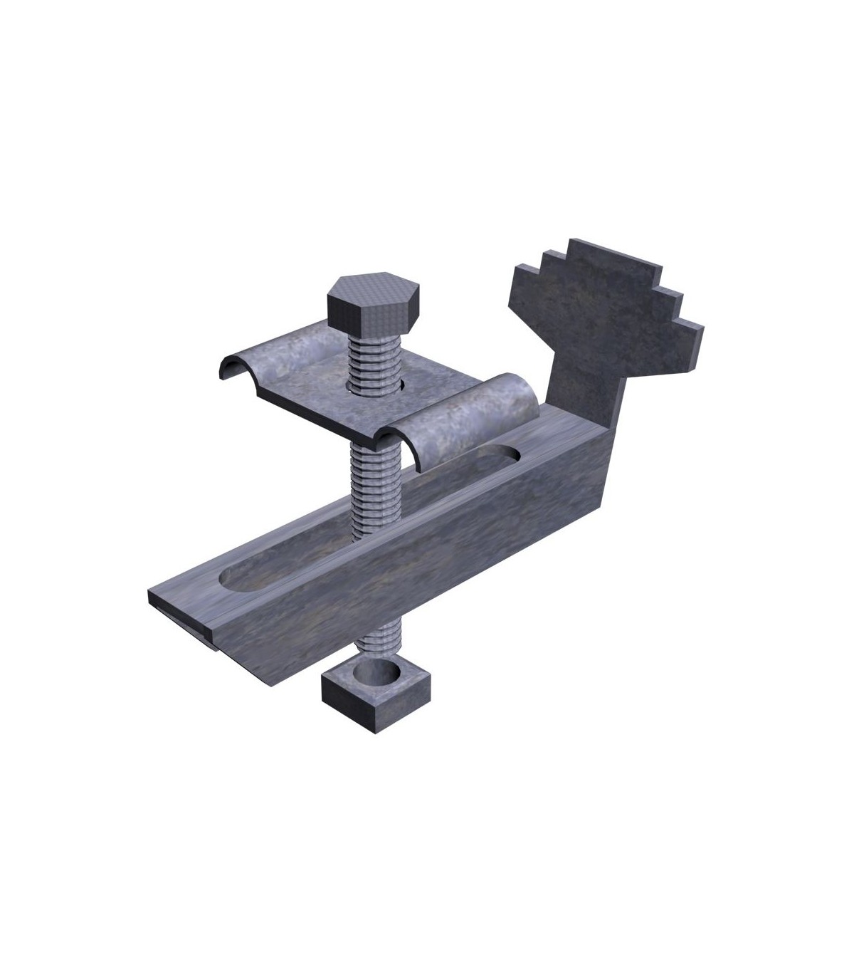 Grapa tipo brazo en acero inoxidable para sujección inferior a estructura en entramados tipo tramex. No incluye tornillo ni pieza superior de apoyo sobre emparrillado.