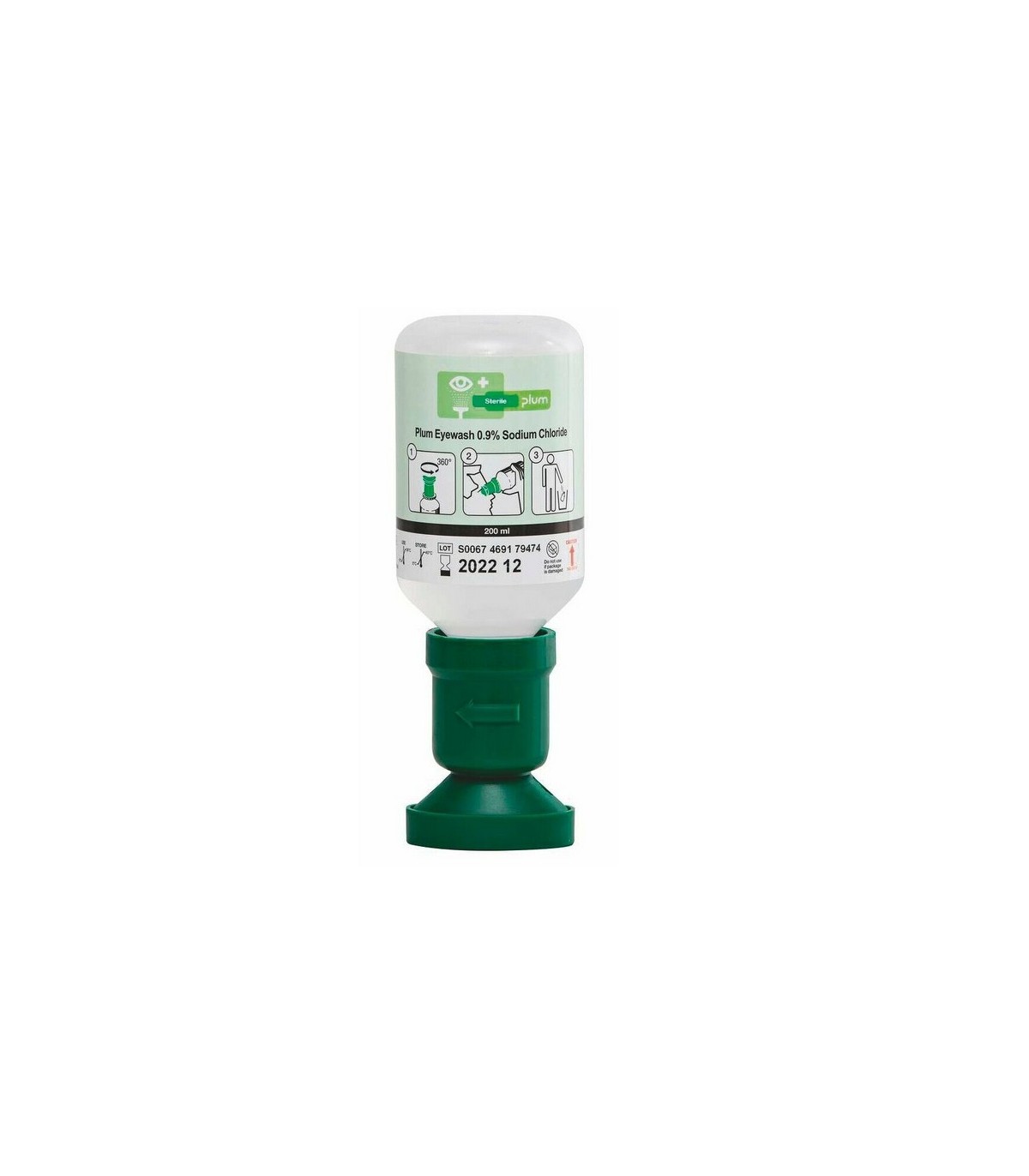 Botella lavaojos con solución salina al 0.9% de 200 ml de capacidad.