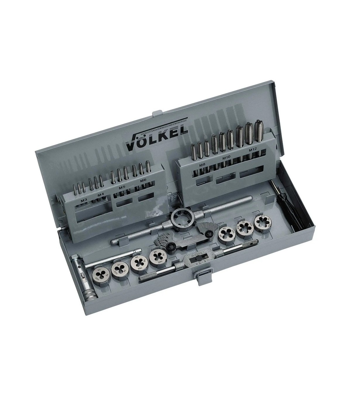 Juego COMPACTO de roscado de M-3 hasta M-12 compuesto por: 7 juegos (de 3 piezas) de machos, 7 cojinetes "tamaño REDUCIDO", 1 giramacho, 1 portacojinetes, galgas oara medición de roscas.