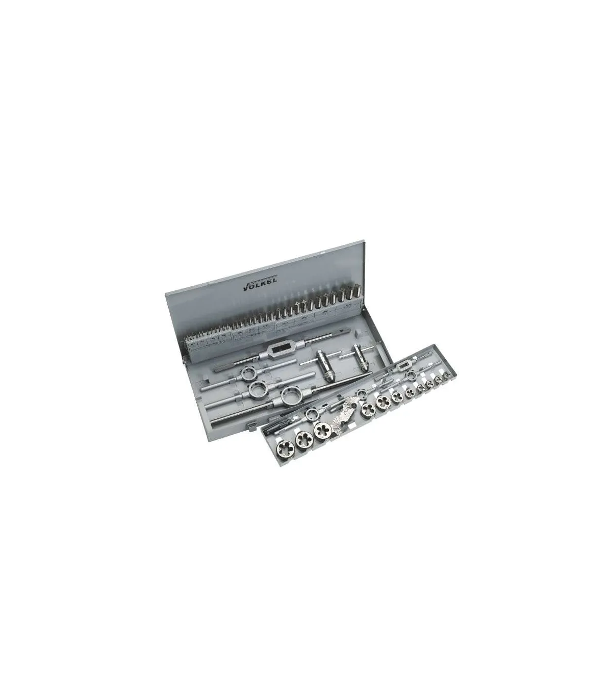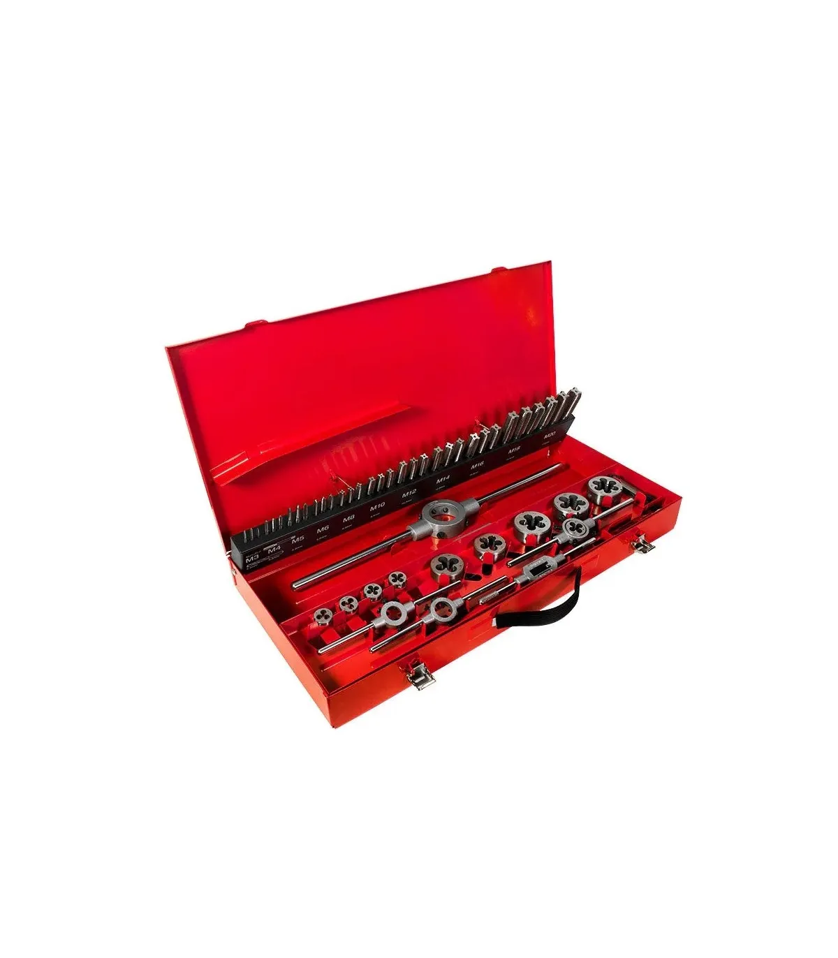 Completo juego de roscado de M-3 hasta M-20 compuesto por: 11 juegos (de 3 piezas) de machos, 11 cojinetes "tamaños industriales o habituales", giramachos, portacojinetes, galgas roscas.
