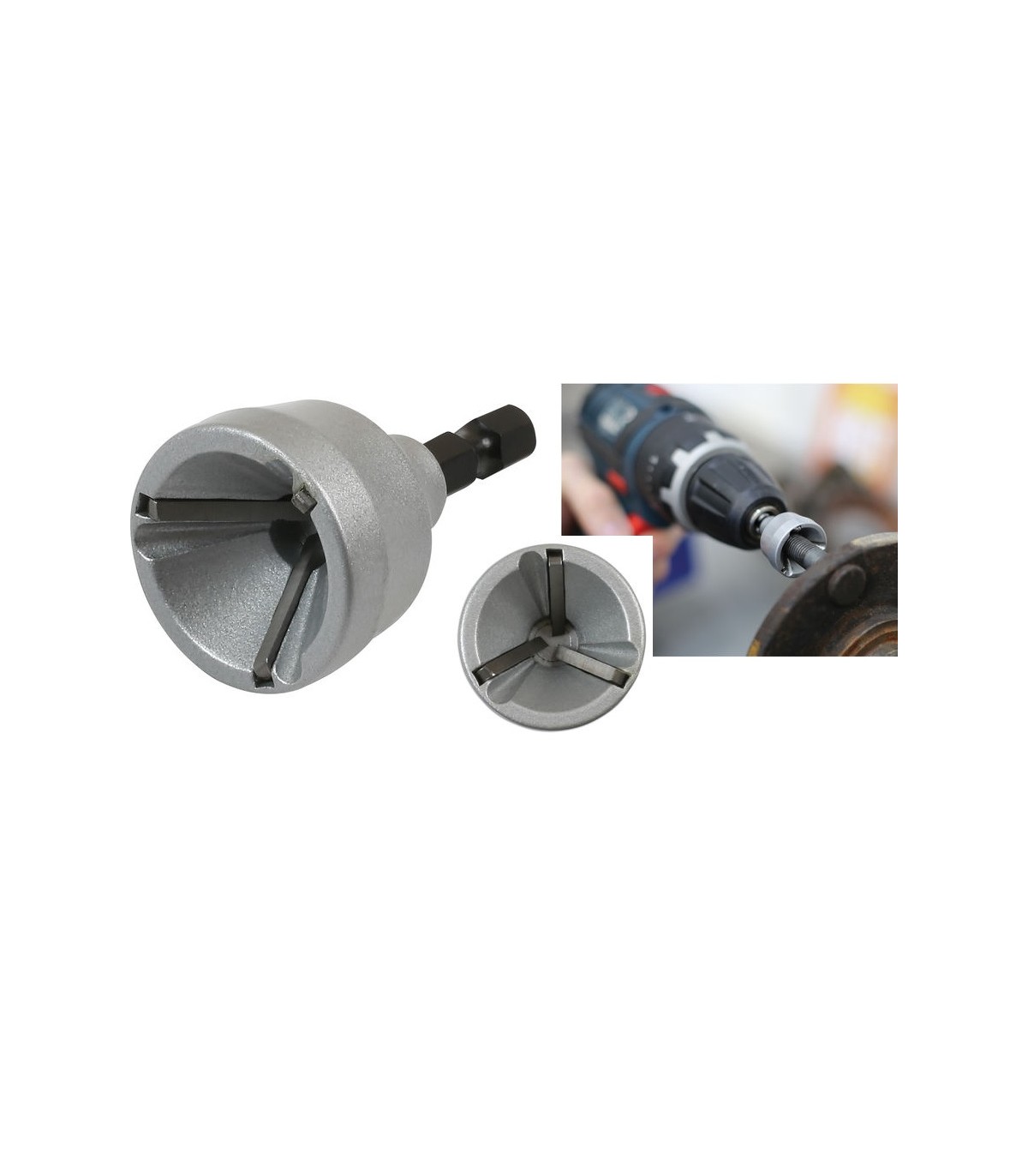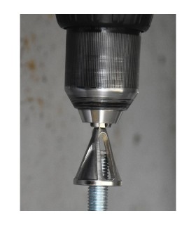 Desbarbadora, biseladora para taladro atornillador para rematar o reparar roscas en tornillos, varillas roscada ó tubos.