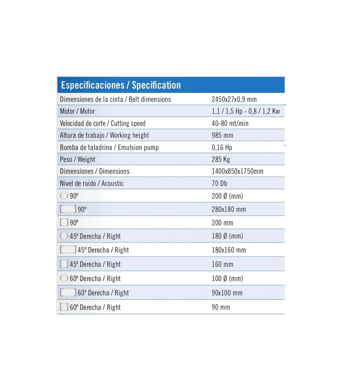 TRONZADORA SIERRA CINTA MG Mod. K280/M/BH. Manual, Capacidad 200 y 280x180. Giro 45/60.