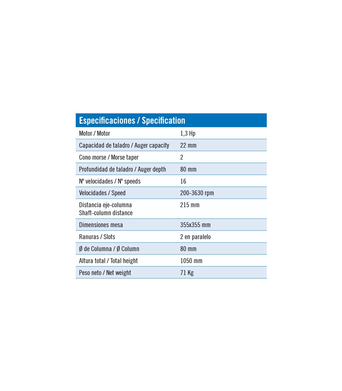 TALADRO SOBREMESA MG - HU-22-NH, motor 1.3 Hp, Profundidad 80 mm