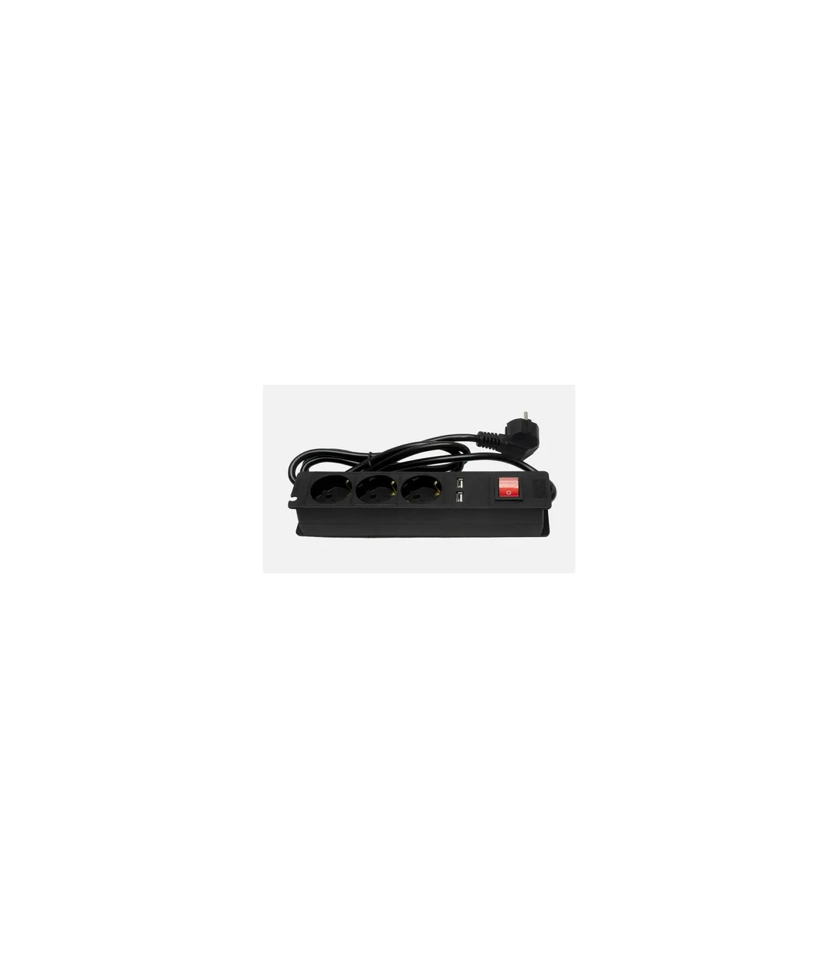 Base múltiple con 3 enchufes y 2 PUERTOS USB, con interruptor de corte con luz, en color NEGRO, con 3 metros de cable flexible de 3 hilos de cobre x 1,5 mm y protección infantil. Con 3500w de potencia máxima con 16 A.