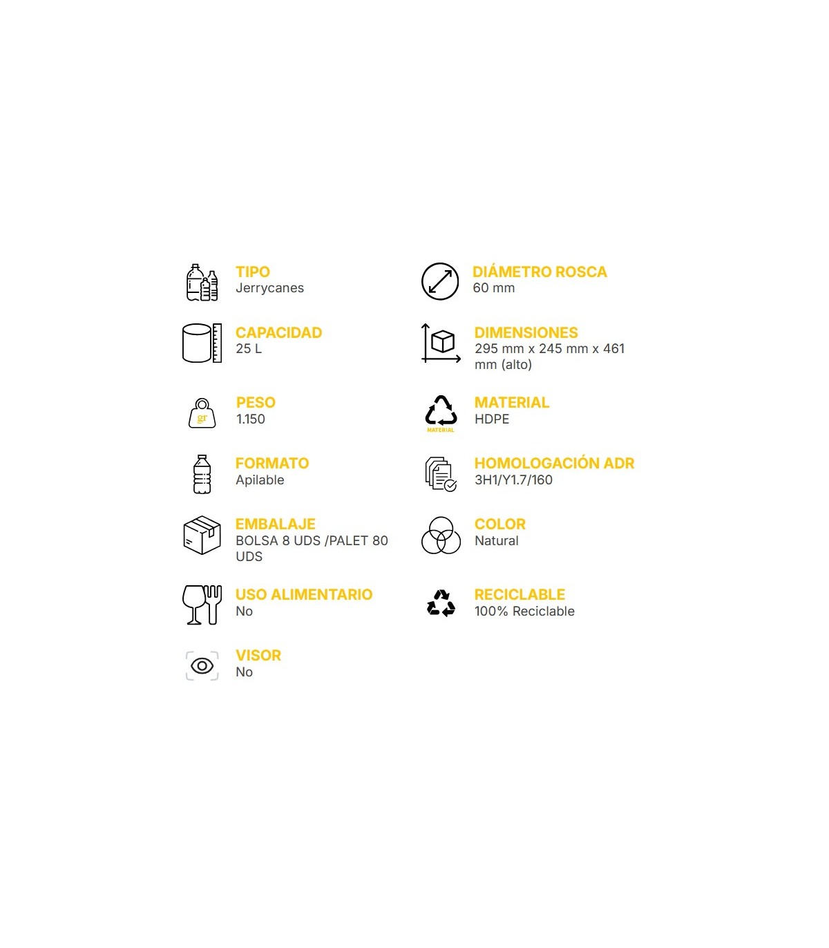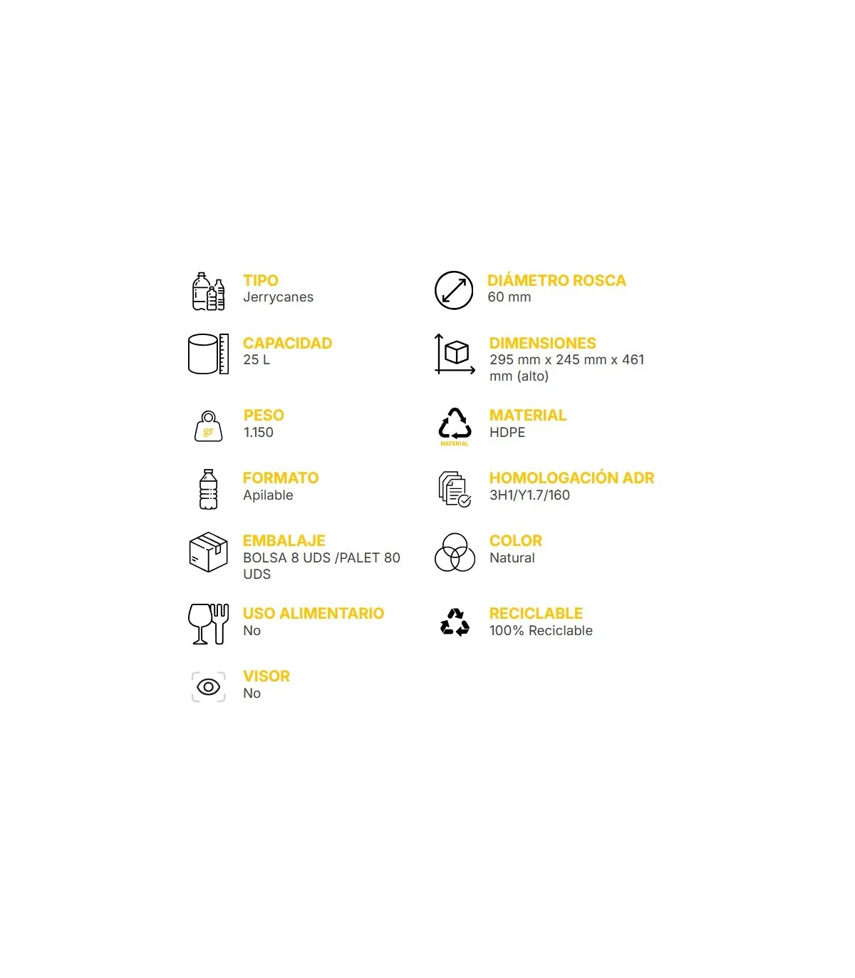 Jerrican-bidón apilable rectangular de  25 litros de capacidad, homologado ADR R60 3H1/Y1.9/150/*/E/**/02-J-537-11.