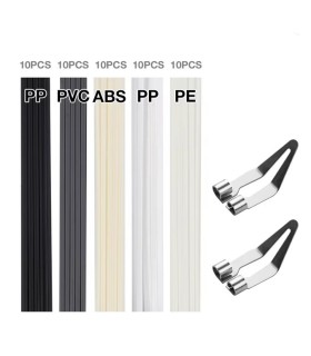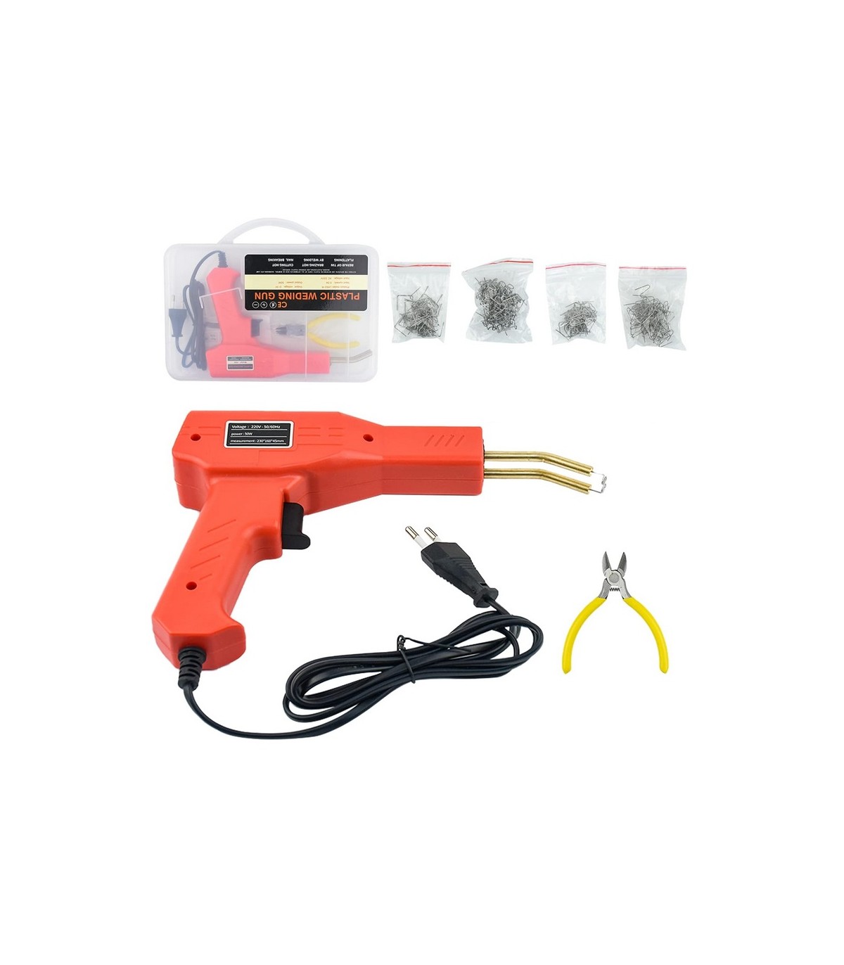 Pistola eléctrica para reparación de carracerías, contenedores y piezas plásticas mediante embutición de grapa caliente permitiendo la unión de 2 partes plásticas, cortando posteriormente patillas sobrantes.