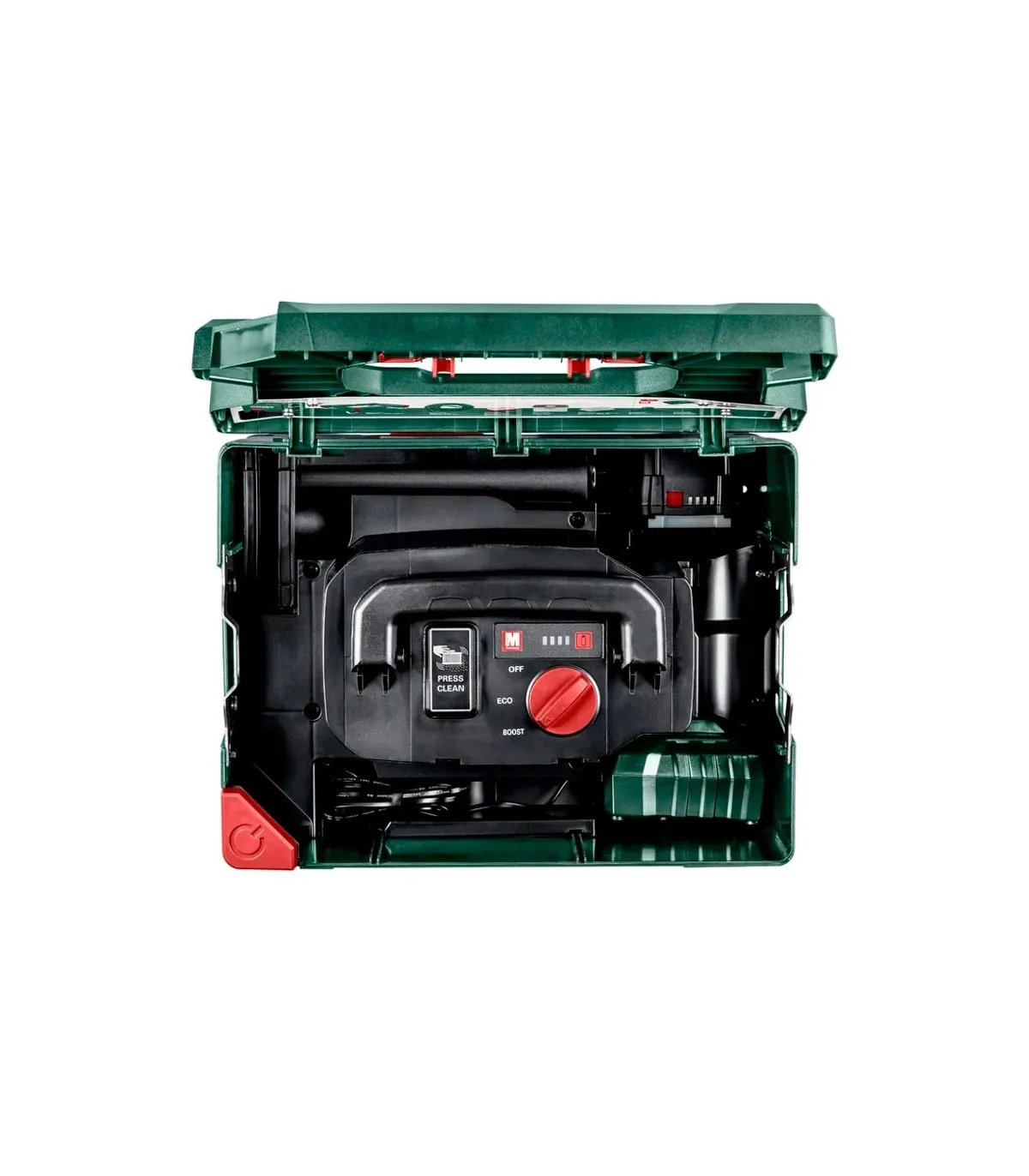 • Prácticos depósitos para una segunda batería, cargador, toberas y manguera