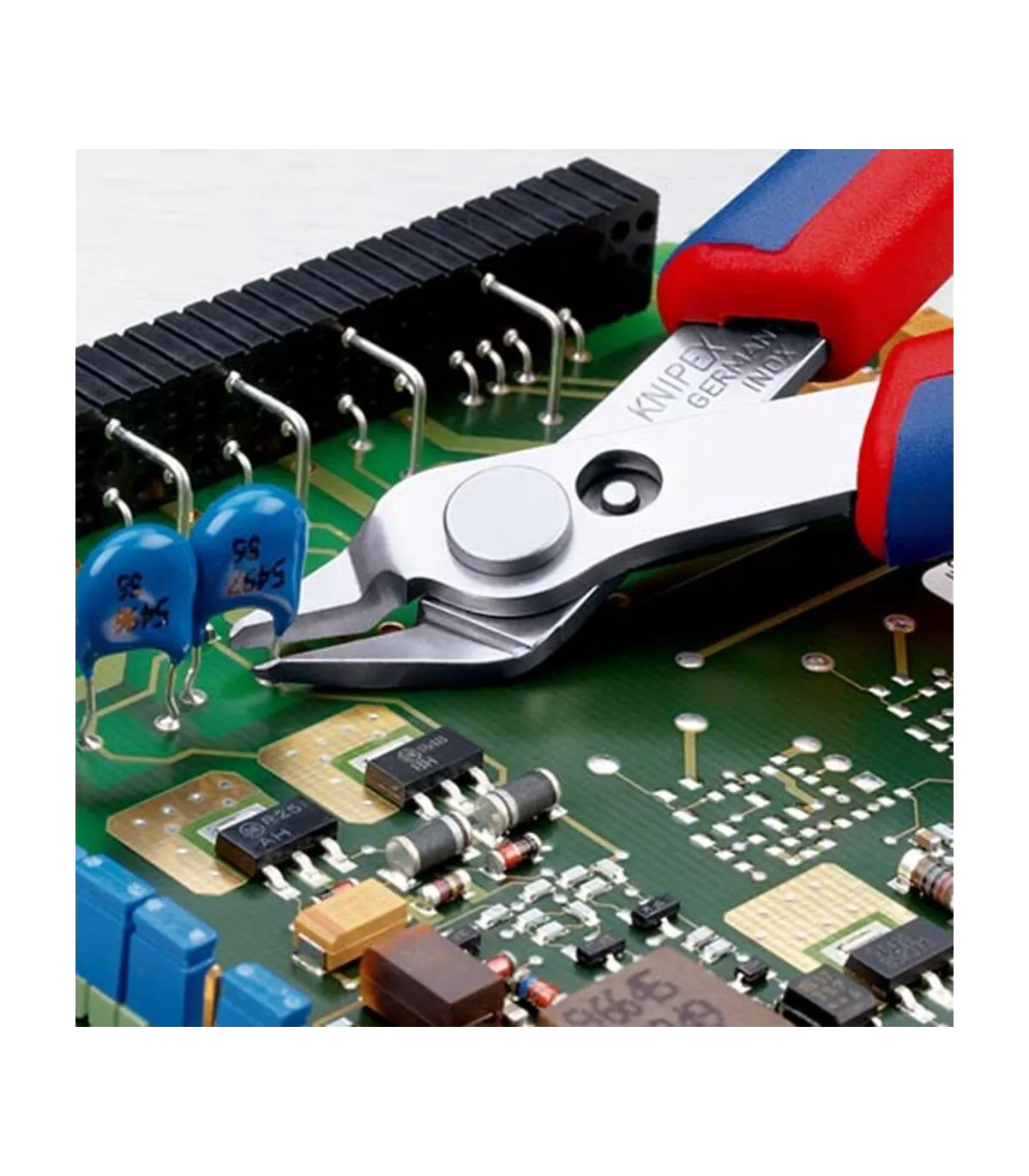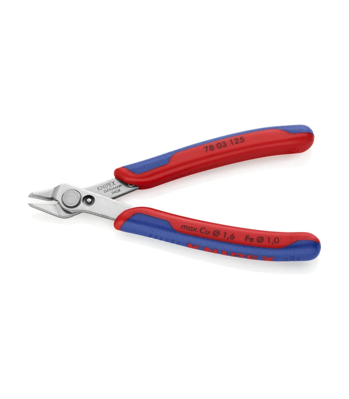 Alicates de precisión para los trabajos de corte más delicados p. ej. en electrónica y mecánica de precisión. Filos rectificados muy afilados sin bisel. Las puntas de configuración precisa cortan también alambres colindantes a partir de Ø 0,2. Corte de cizalla con micro desplazamiento controlado del canto de corte para un corte ultrapreciso incluso de hilos finísimos y una larga vida útil. Articulación con remache de acero afinado. Movimiento extremadamente suave que evita la fatiga del operario. Con muelle y limitador de apertura. Dureza aprox. de los filos de corte 54 HRC. acero INOX para herramientas.