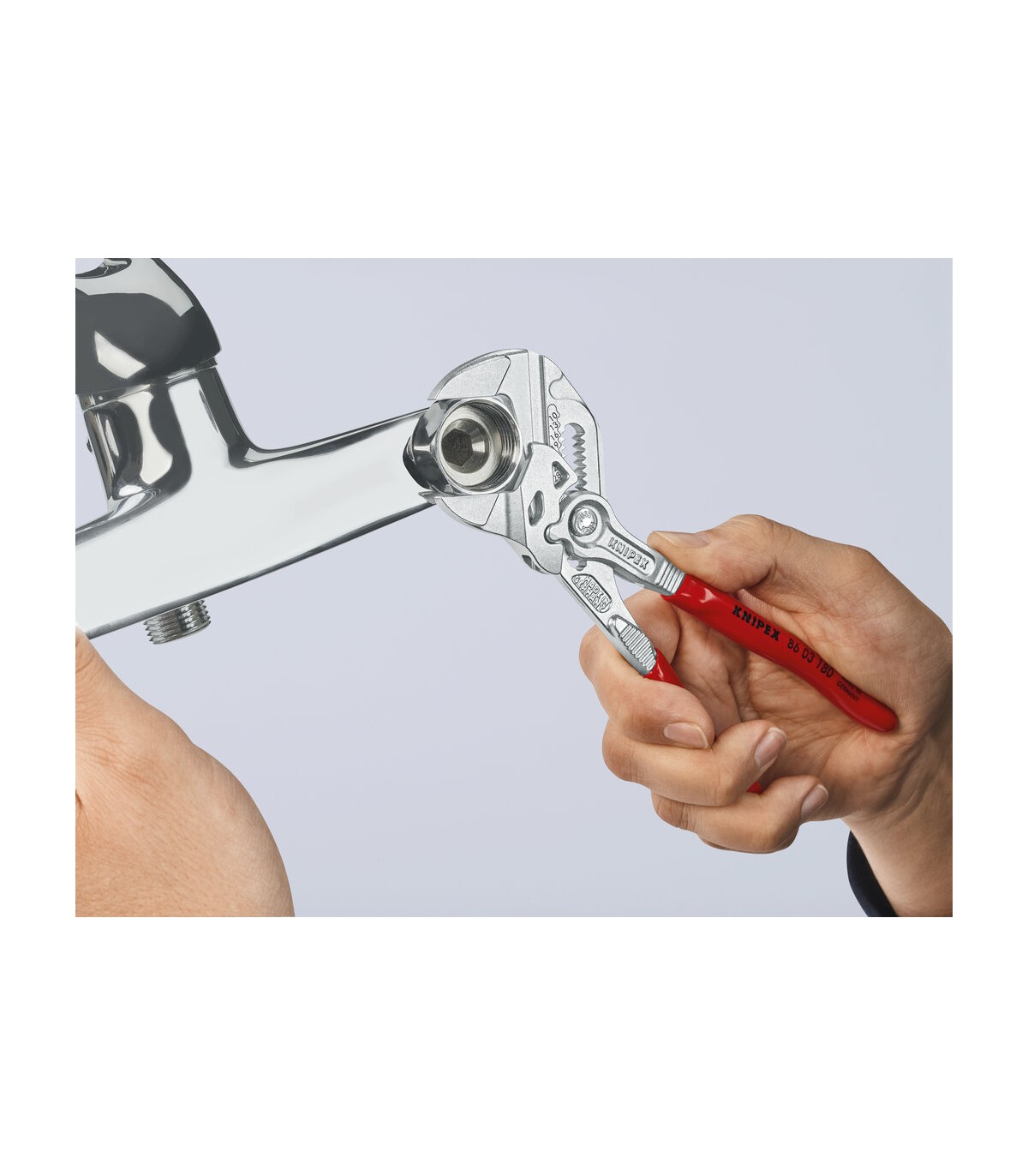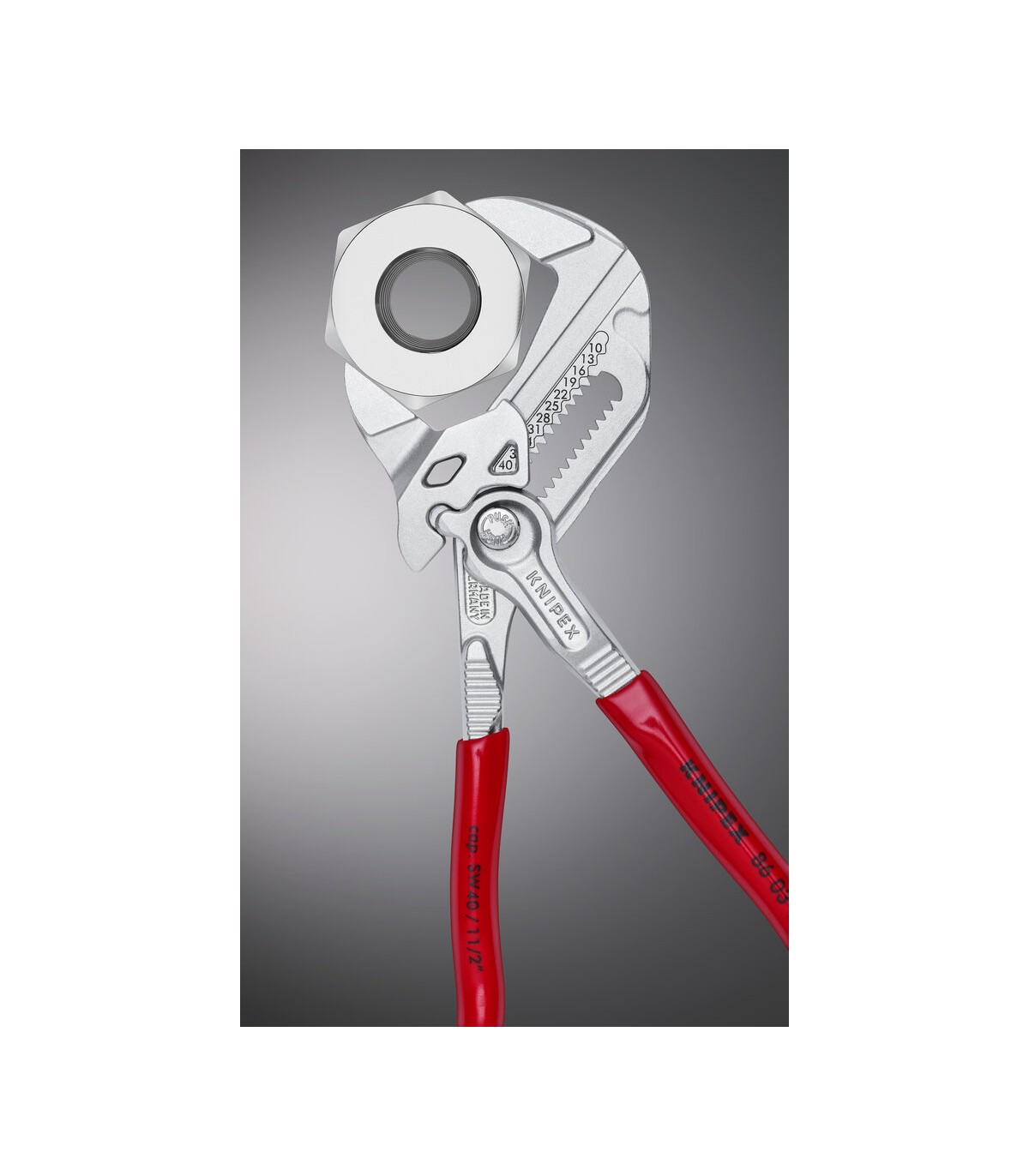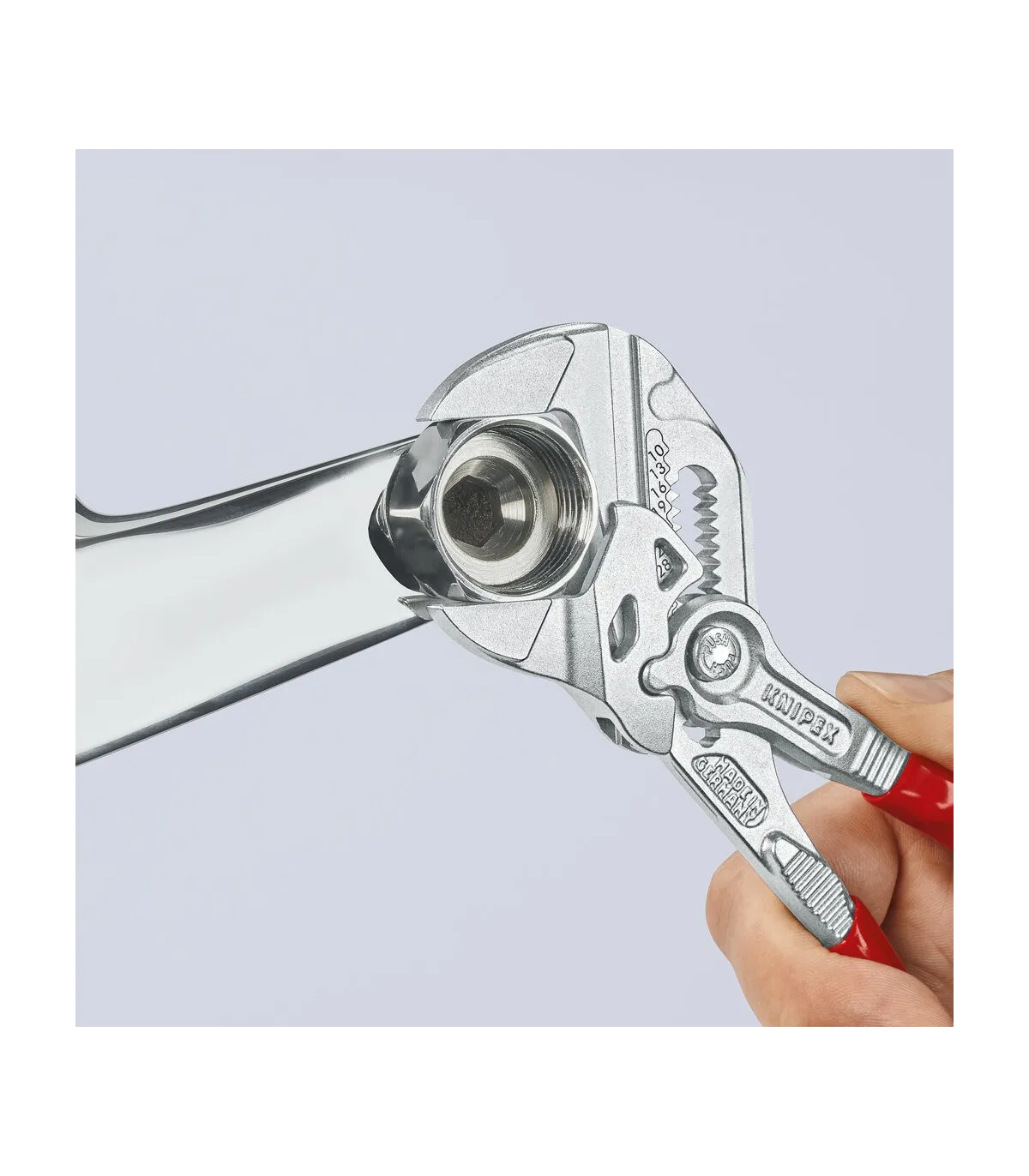 Sustituye a un juego completo de llaves de tuercas, tanto en métrica como en pulgadas. Mordazas planas para el cuidadoso montaje de grifos con tratamiento superficial - ¡para trabajar directamente sobre cromo!. Muy adecuada también para agarrar, sujetar, prensar y doblar piezas a mecanizar. Ajuste perfecto a las caras de las tuercas evitando que estas se redondeen. Ajuste rápido mediante botón directamente en la pieza de trabajo. Articulación antideslizante con mordazas de agarre de ajuste perfecto. Agarre perfecto gracias a las mordazas paralelas; su diseño permite adaptarla a todos los anchos de boca hasta el máximo especificado. El accionamiento entre las mordazas posibilita el ajuste y la liberación rápida de uniones roscadas gracias al efecto carraca. La fuerza ejercida en los mangos se multiplica por 10 en las mordazas, gran capacidad de sujeción. Con mordazas de agarre esbeltas – para situaciones de atornillado que requieren una herramienta esbelta.