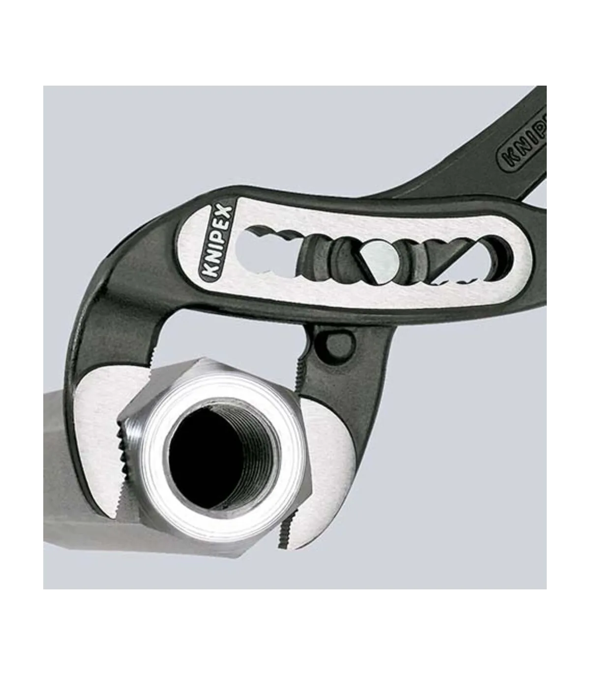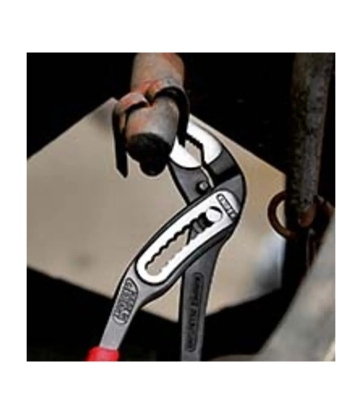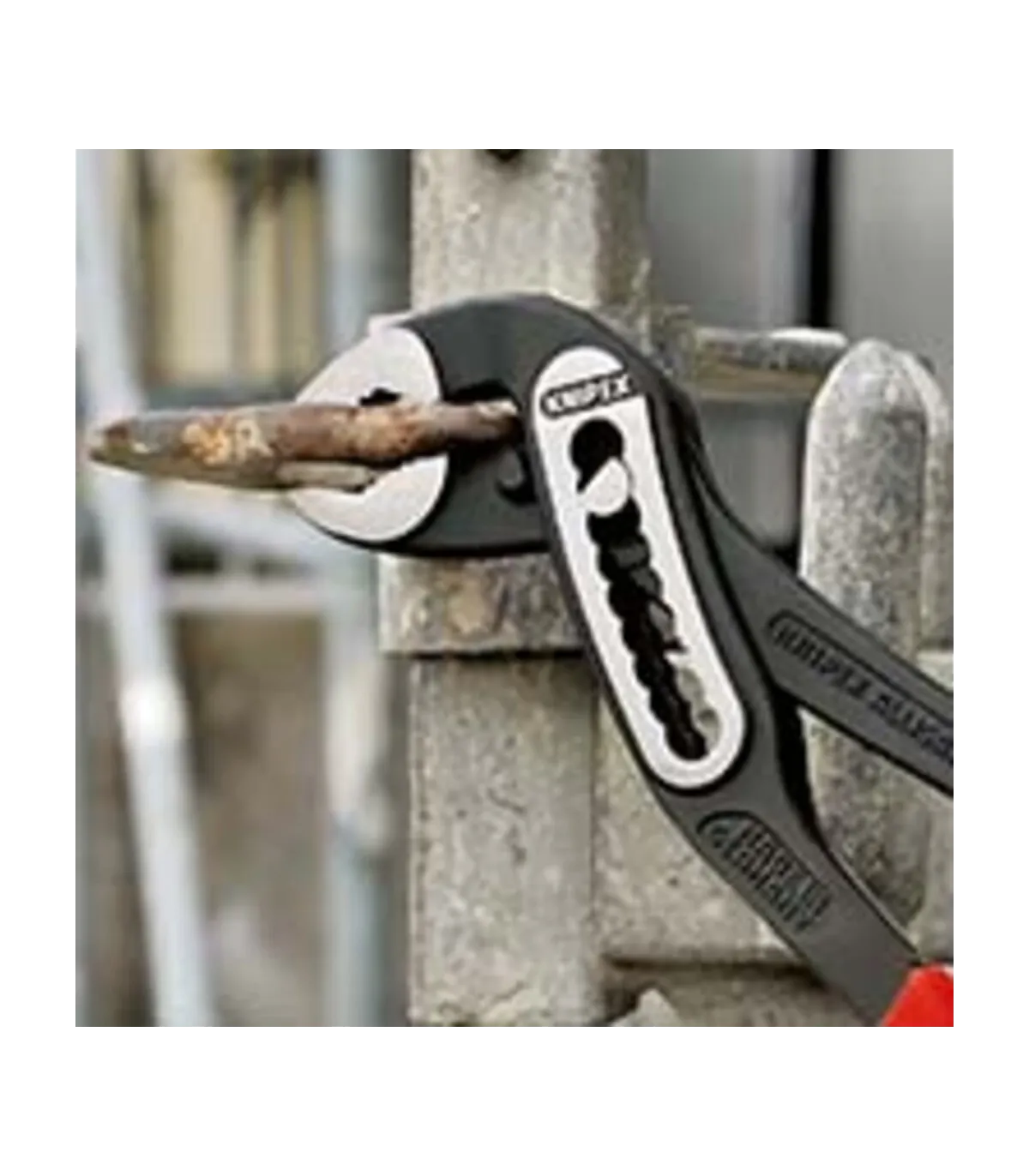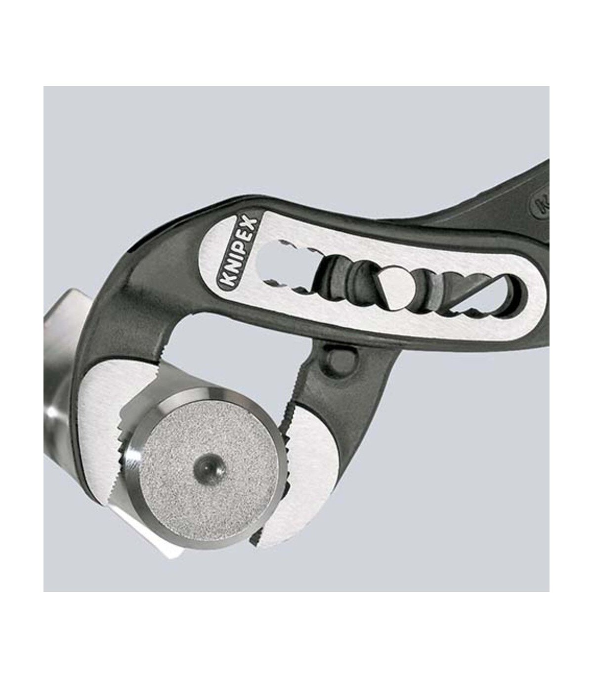 Fácil acceso a la pieza gracias al diseño esbelto en la zona de la cabeza y la articulación. Mayor rendimiento y confort en comparación con tenazas convencionales para bombas de agua de la misma longitud: 9 posiciones de ajuste para un 30 % más de capacidad de agarre. Auto-retención en tuberías y tuercas, agarre perfecto a la pieza con el mínimo esfuerzo. Mordazas con dientes adicionalmente templados, dureza aprox. de los dientes 61 HRC: poco desgaste y gran seguridad en el agarre. Articulación machihembrada: gran estabilidad por la doble guía. Diseño robusto, resistente a la suciedad, indicada especialmente para trabajos en el exterior. Un retén protector evita lesiones por pellizcos.