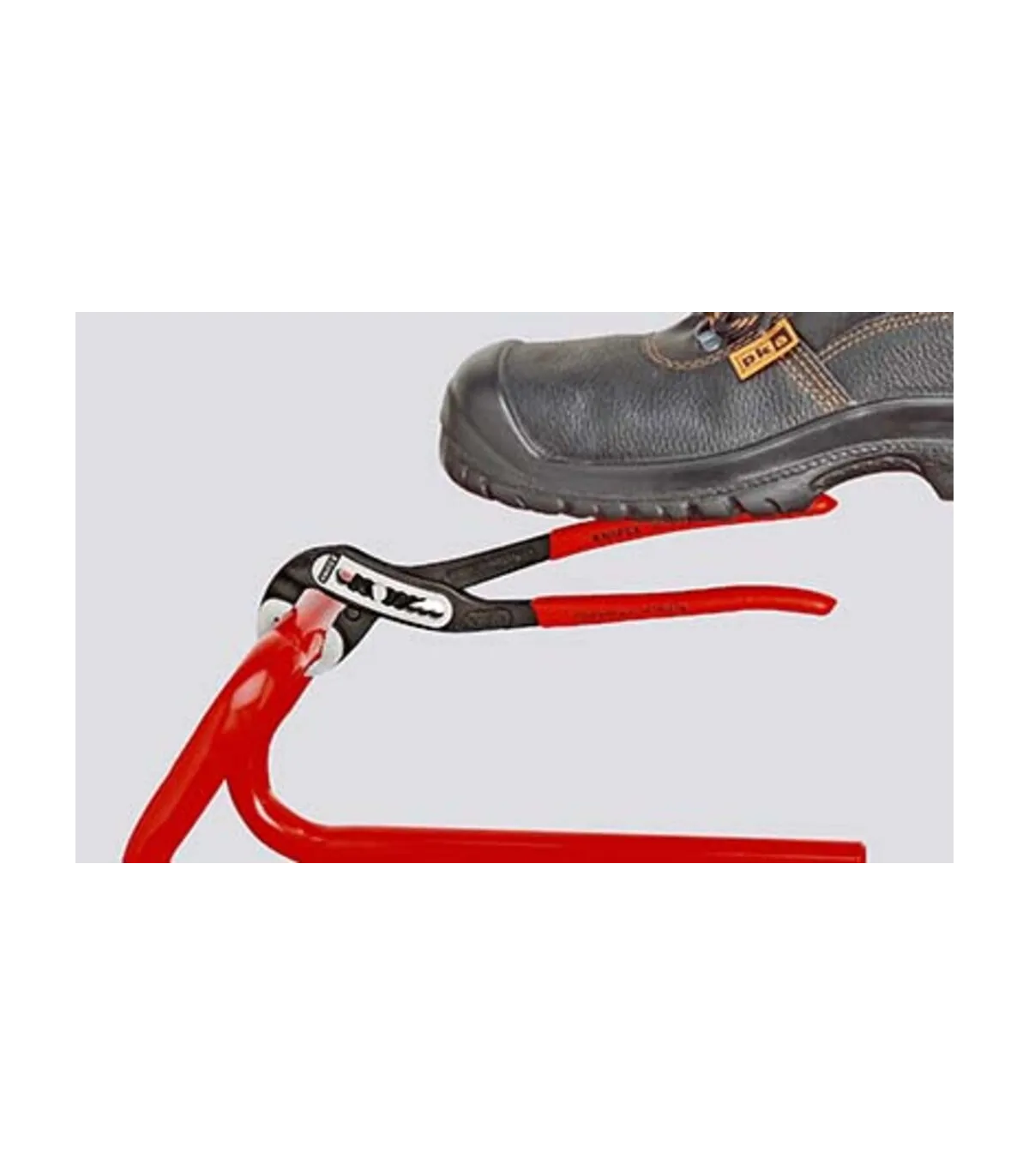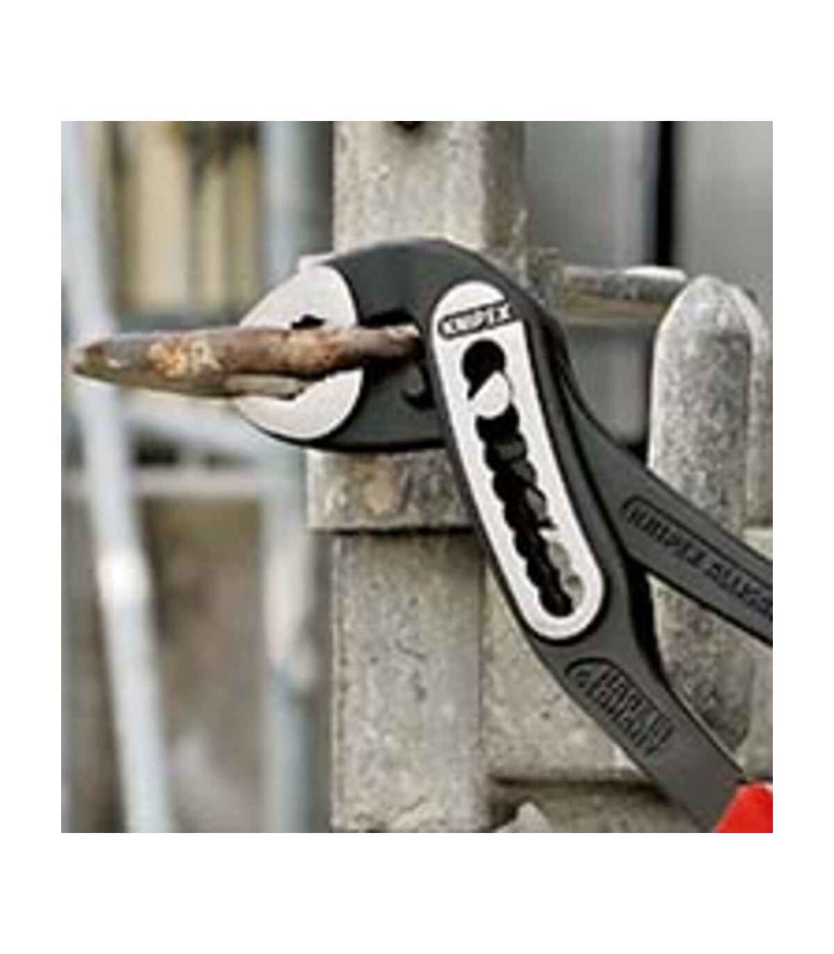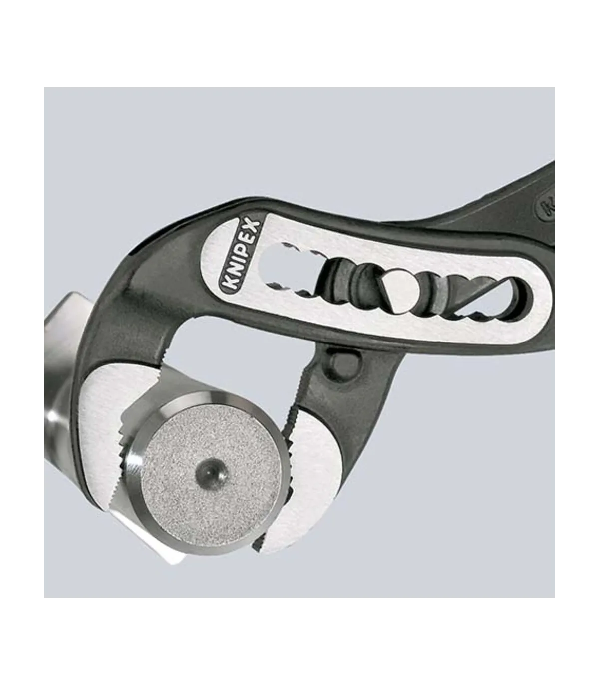 Fácil acceso a la pieza gracias al diseño esbelto en la zona de la cabeza y la articulación. Mayor rendimiento y confort en comparación con tenazas convencionales para bombas de agua de la misma longitud: 9 posiciones de ajuste para un 30 % más de capacidad de agarre. Auto-retención en tuberías y tuercas, agarre perfecto a la pieza con el mínimo esfuerzo. Mordazas con dientes adicionalmente templados, dureza aprox. de los dientes 61 HRC: poco desgaste y gran seguridad en el agarre. Articulación machihembrada: gran estabilidad por la doble guía. Diseño robusto, resistente a la suciedad, indicada especialmente para trabajos en el exterior. Un retén protector evita lesiones por pellizcos.