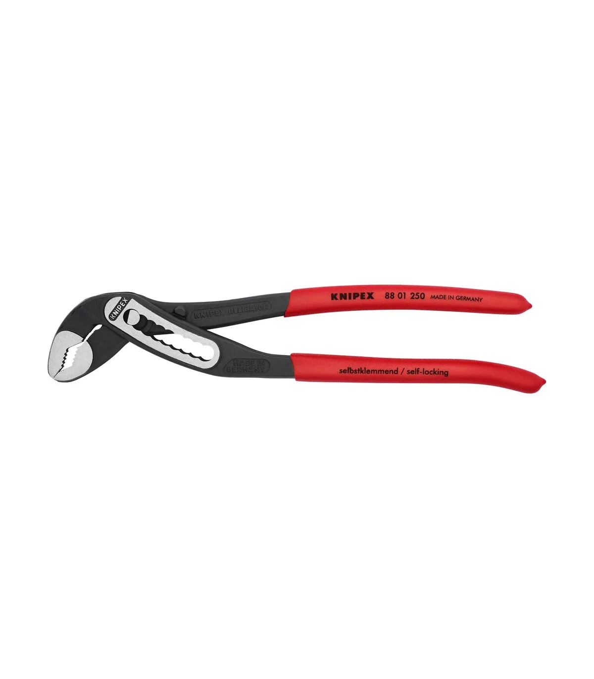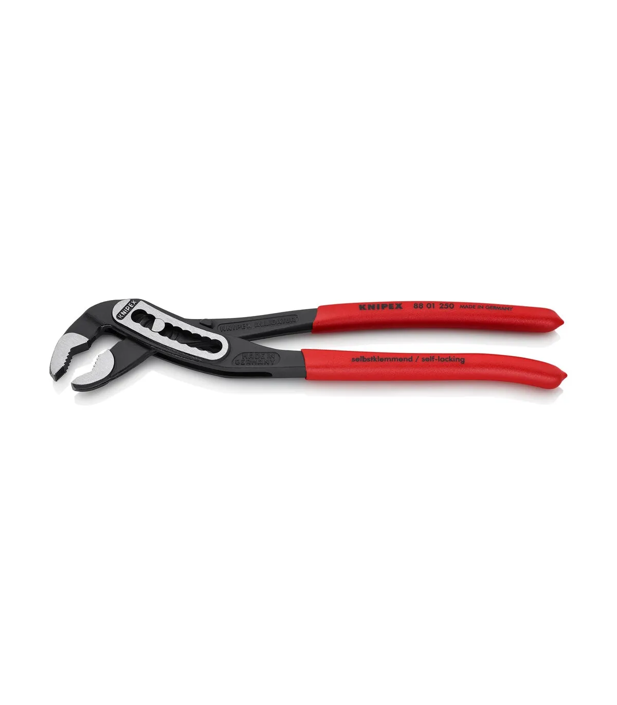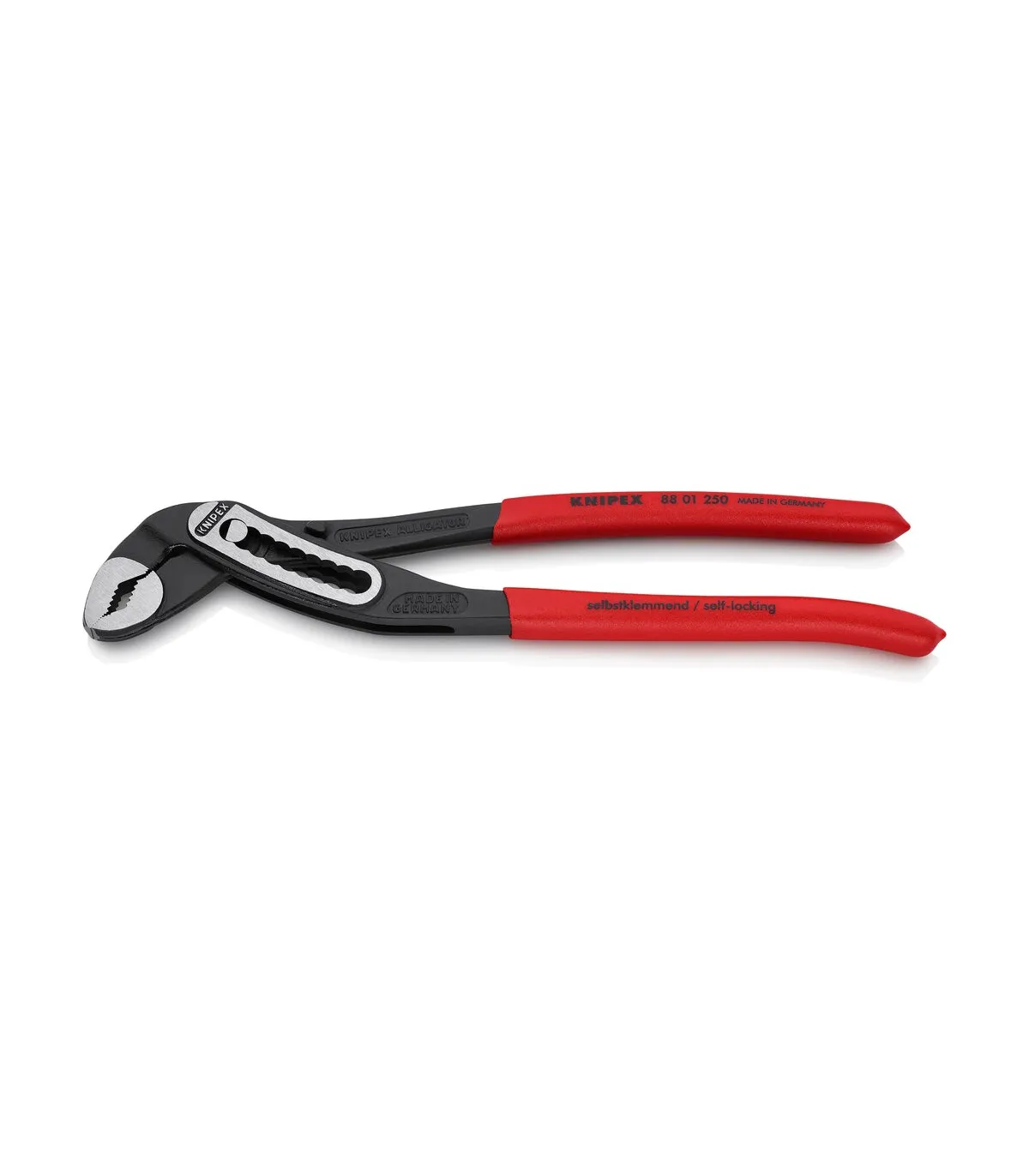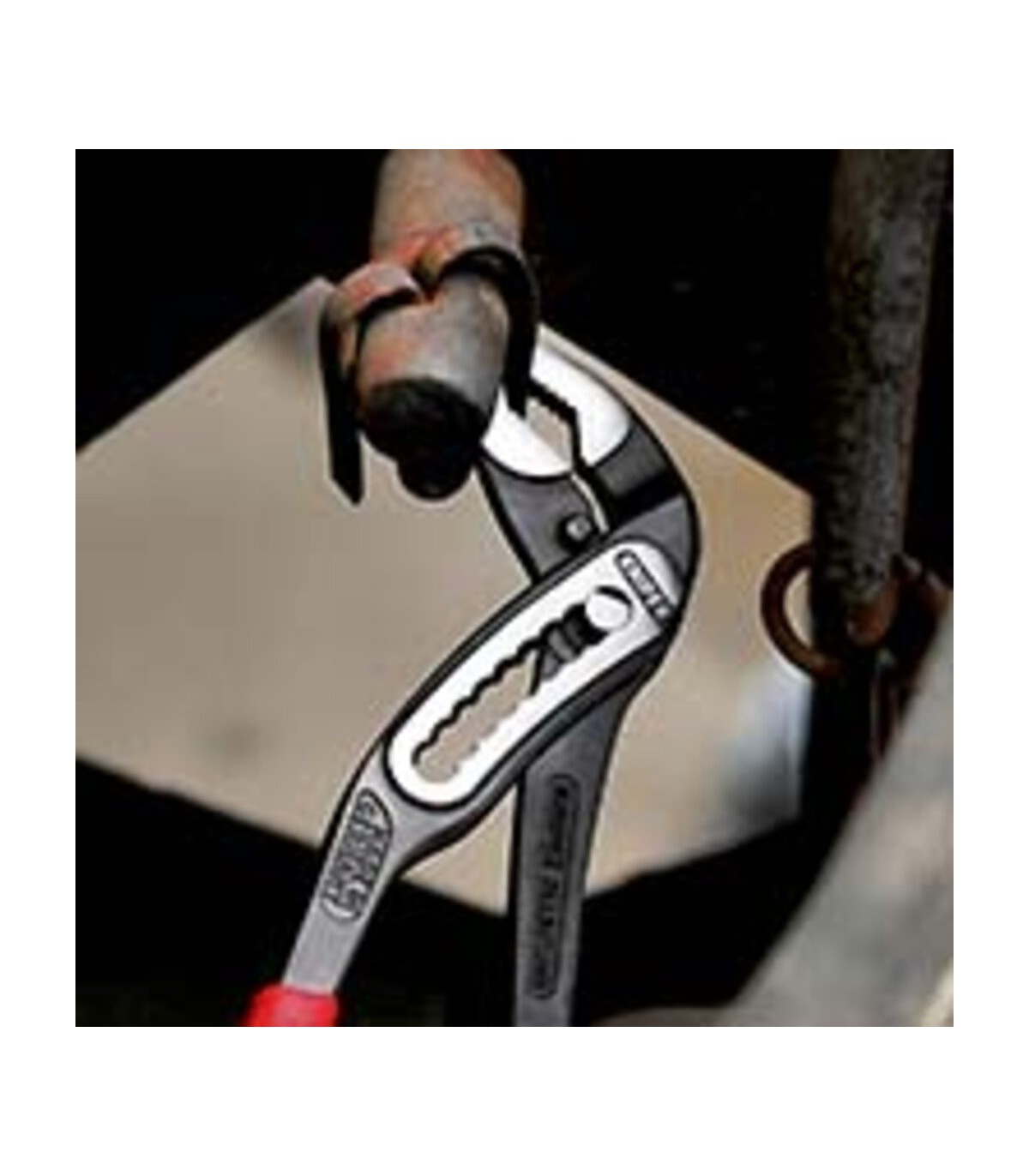 Fácil acceso a la pieza gracias al diseño esbelto en la zona de la cabeza y la articulación. Mayor rendimiento y confort en comparación con tenazas convencionales para bombas de agua de la misma longitud: 9 posiciones de ajuste para un 30 % más de capacidad de agarre. Auto-retención en tuberías y tuercas, agarre perfecto a la pieza con el mínimo esfuerzo. Mordazas con dientes adicionalmente templados, dureza aprox. de los dientes 61 HRC: poco desgaste y gran seguridad en el agarre. Articulación machihembrada: gran estabilidad por la doble guía. Diseño robusto, resistente a la suciedad, indicada especialmente para trabajos en el exterior. Un retén protector evita lesiones por pellizcos.