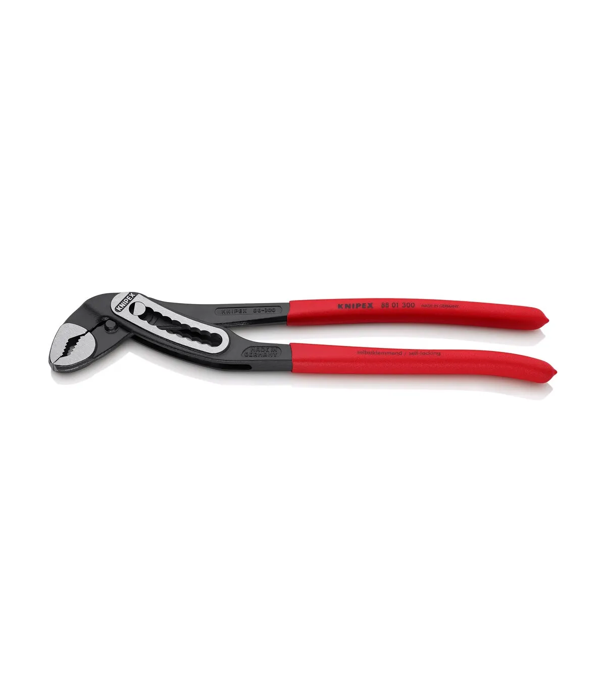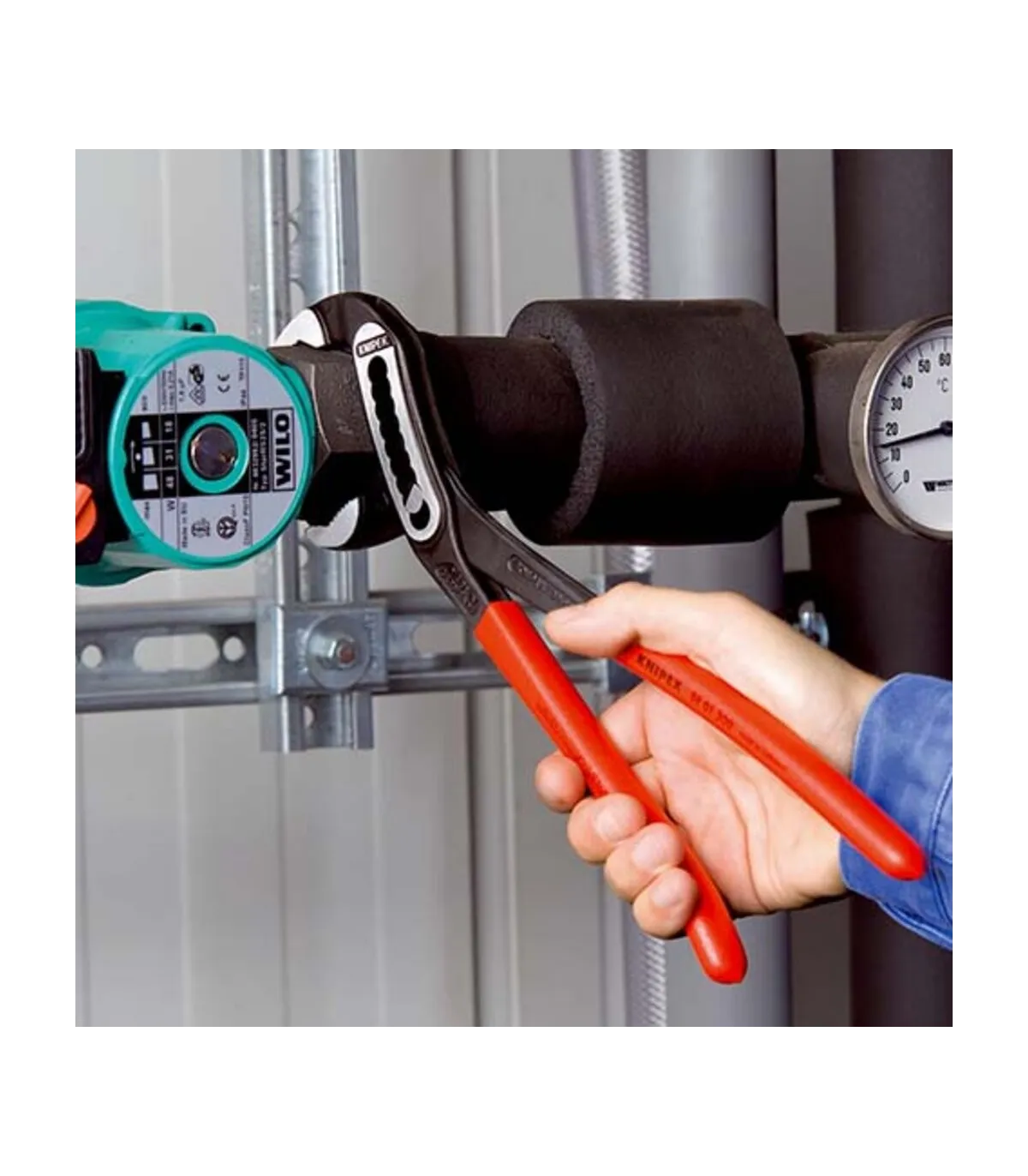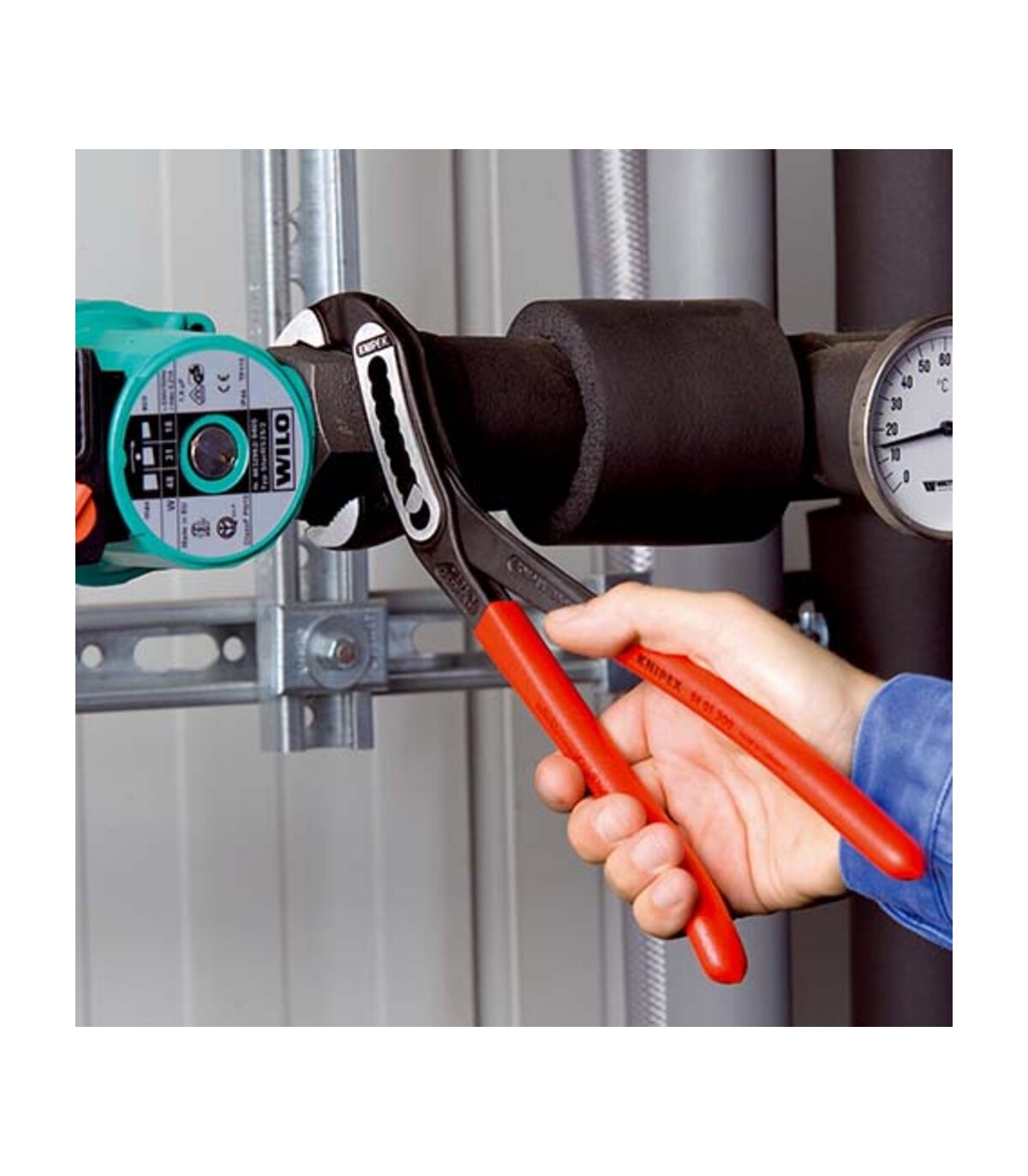 Fácil acceso a la pieza gracias al diseño esbelto en la zona de la cabeza y la articulación. Mayor rendimiento y confort en comparación con tenazas convencionales para bombas de agua de la misma longitud: 9 posiciones de ajuste para un 30 % más de capacidad de agarre. Auto-retención en tuberías y tuercas, agarre perfecto a la pieza con el mínimo esfuerzo. Mordazas con dientes adicionalmente templados, dureza aprox. de los dientes 61 HRC: poco desgaste y gran seguridad en el agarre. Articulación machihembrada: gran estabilidad por la doble guía. Diseño robusto, resistente a la suciedad, indicada especialmente para trabajos en el exterior. Un retén protector evita lesiones por pellizcos.