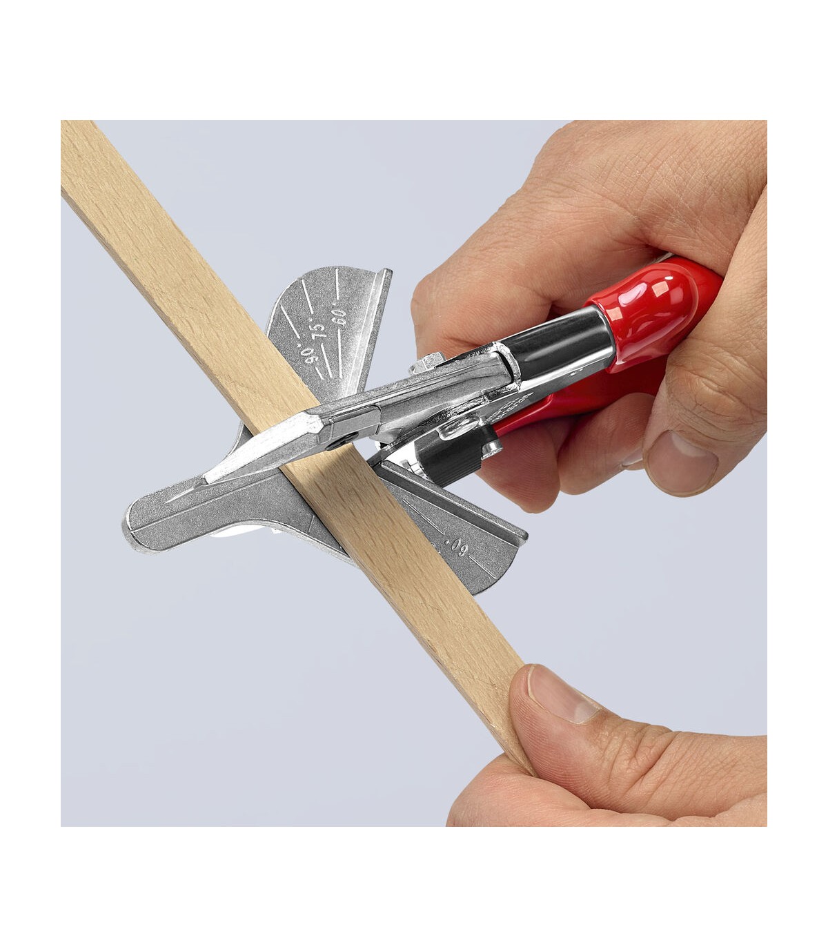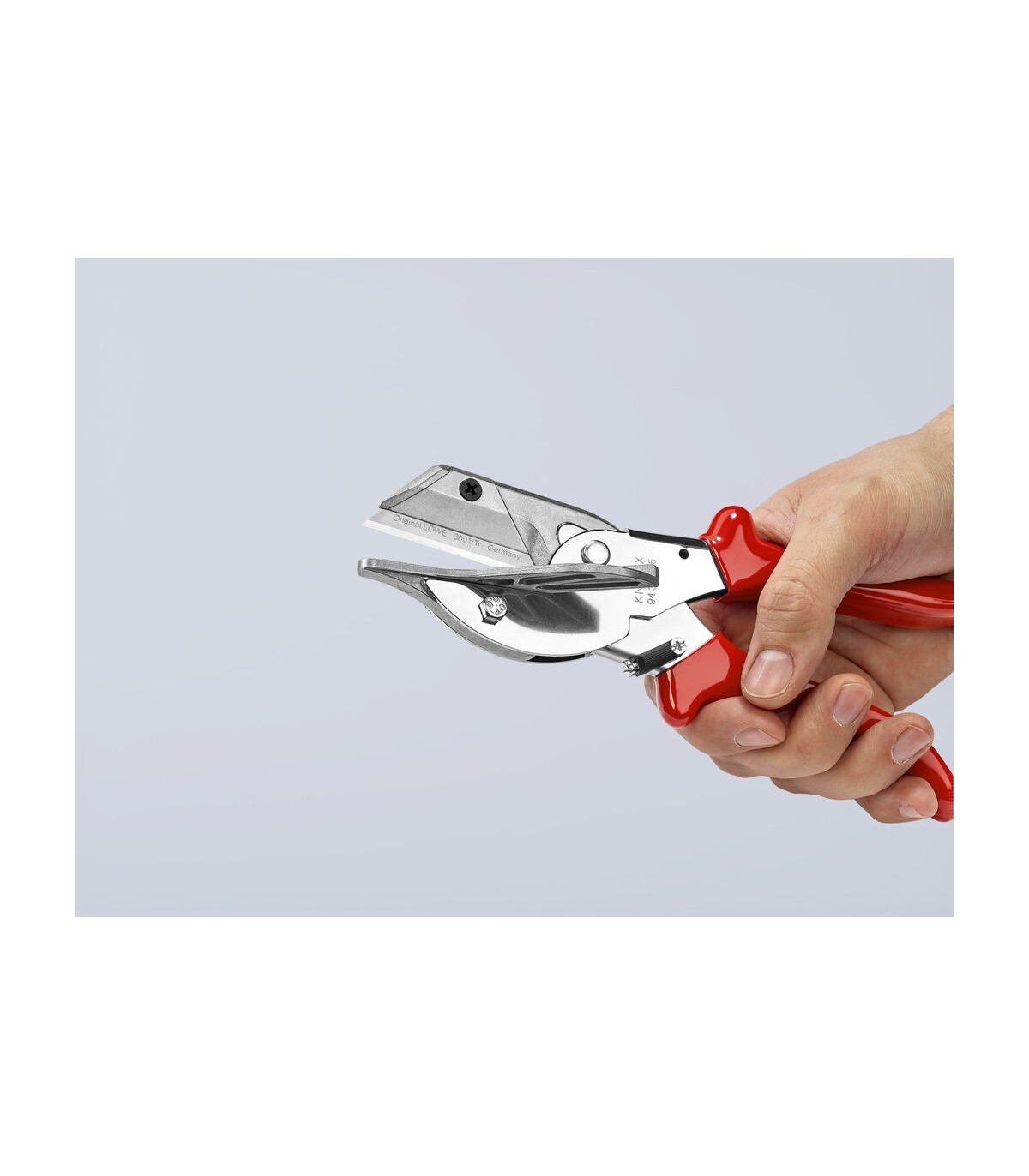 Para cortar plástico, goma y cinta de cable hasta 56 de ancho. Apoyo de corte intercambiable con tope para cortar en ángulo de 45 /60/75/90º. Con muelle de apertura y palanca de cierre.