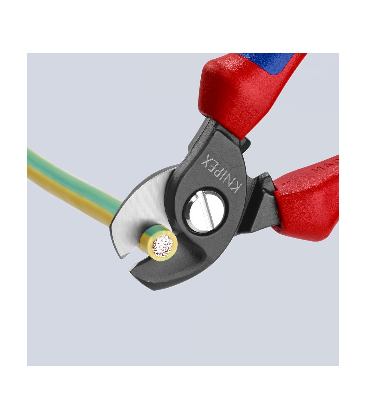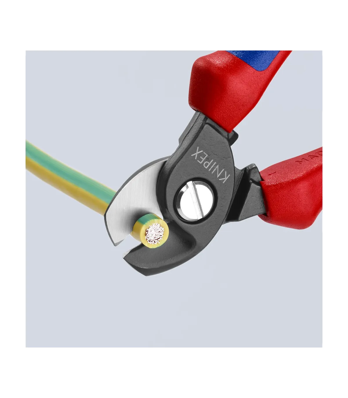 Para cables de cobre y aluminio, simples y múltiples. Corte limpio sin deformaciones ni aplastamientos. No apto para cortar cable de acero o conductores de cobre trenzado. Cuchillas de corte templadas y afiladas con gran precisión. Corte muy fácil con una sola mano. Con retén protector contra pellizcos. Articulación con tornillo ajustable.