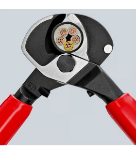 Para cables de cobre y aluminio, simples y múltiples. No apto para cables de acero, cables trenzados y conductores de hilos finos (muy flexibles). Cuchillas de corte templadas y afiladas con gran precisión. Corte limpio sin deformaciones ni aplastamientos. Fácil y cómodo manejo con una sola mano, gracias a su efecto carraca. Se requiere un menor esfuerzo debido a su óptima multiplicación. Posibilidad de dos velocidades, para un corte más fácil. Fácil manejo por su reducido peso y forma compacta, especial para trabajar en áreas reducidas. Un retén protector evita lesiones por pellizcos. Zona especial de apoyo en el mango para cortes con el alicate apoyado. Adecuado para secciones de 4 x 150² en cable de aluminio. cartulina autoservicio/blíster.