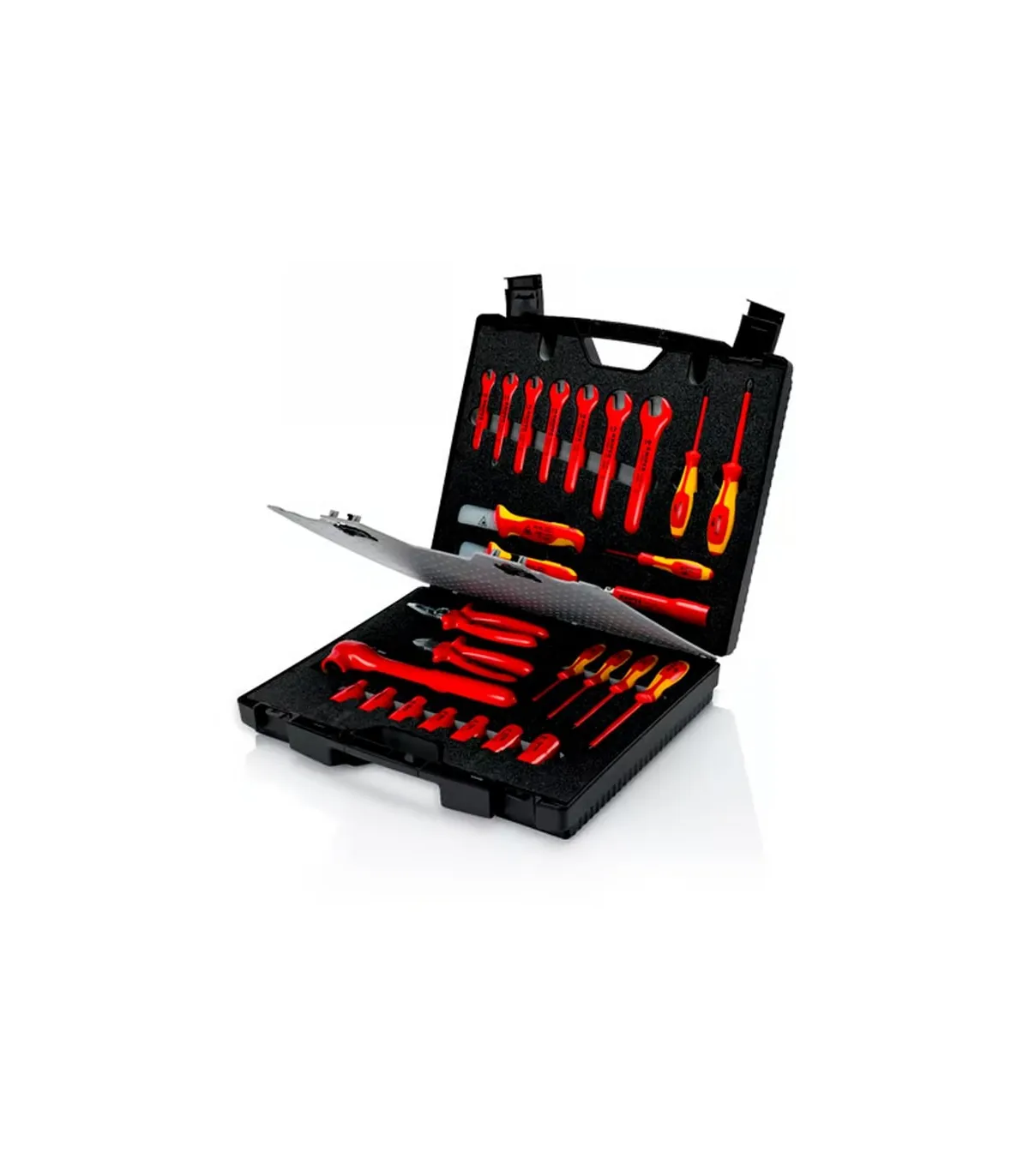 Maleta de plástico resistente a los golpes. Equipado con una gama de herramientas aisladas KNIPEX para trabajar en instalaciones eléctricas. Revestimiento de espuma con huecos para la herramienta. Con separador flexible. Dimensiones exterioers (A x A x P): 440 x 105 x 385.
