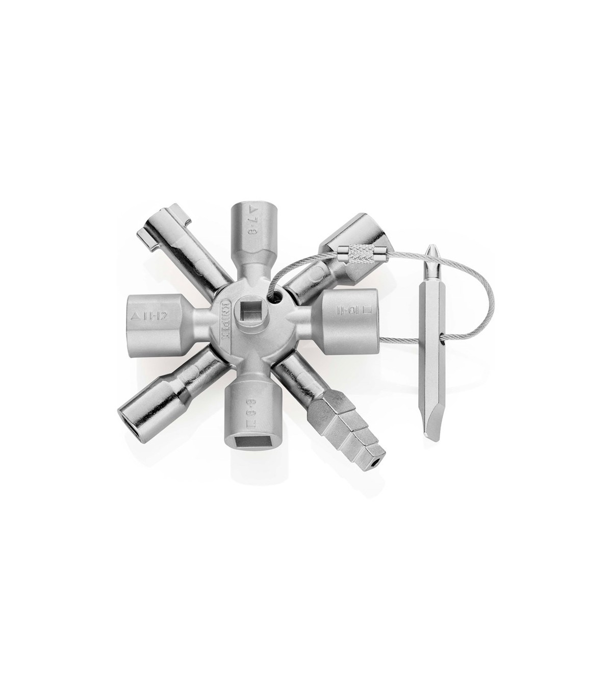 10 perfiles. 2 cruces. 1 llave.. Todos los sistemas de cierre convencionales. Llave multifuncional para sistemas de paso en la ingeniería de construcción (calefacción y fontanería, técnica de climatización y ventilación, electrotecnia), suministro de gas y agua y sistemas de bloqueo. Versión de 8 caras: 2 llaves cruciformes unidas mediante imán para ahorrar espacio. Punta bit reversible: ranura de 1,0 x 7 y cruciforme PH2. Llave y bit reversible unidos por un resistente cable inoxidable. Diseño de fundición de zinc con peso optimizado.