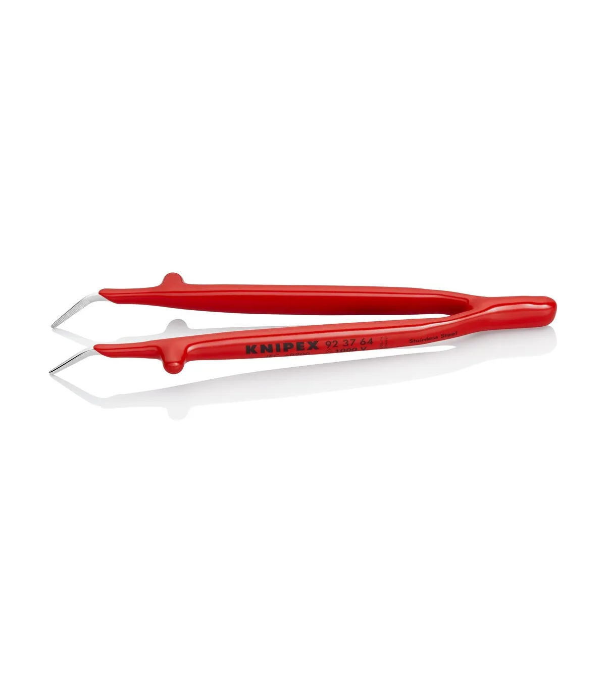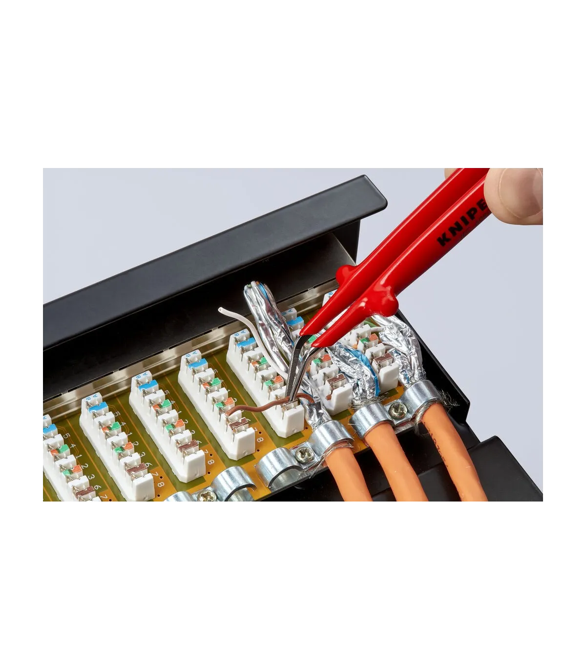 Protección probada contra voltaje eléctrico: gracias al aislamiento del mango probado a 1000 V, estas pinzas no conducen corriente cuando las puntas sujetan componentes activos. Protección probada contra voltaje eléctrico: gracias al aislamiento del mango probado a 1000 V, estas pinzas no conducen corriente cuando las puntas sujetan componentes activos. Para profesionales de la electricidad y la electrónica..