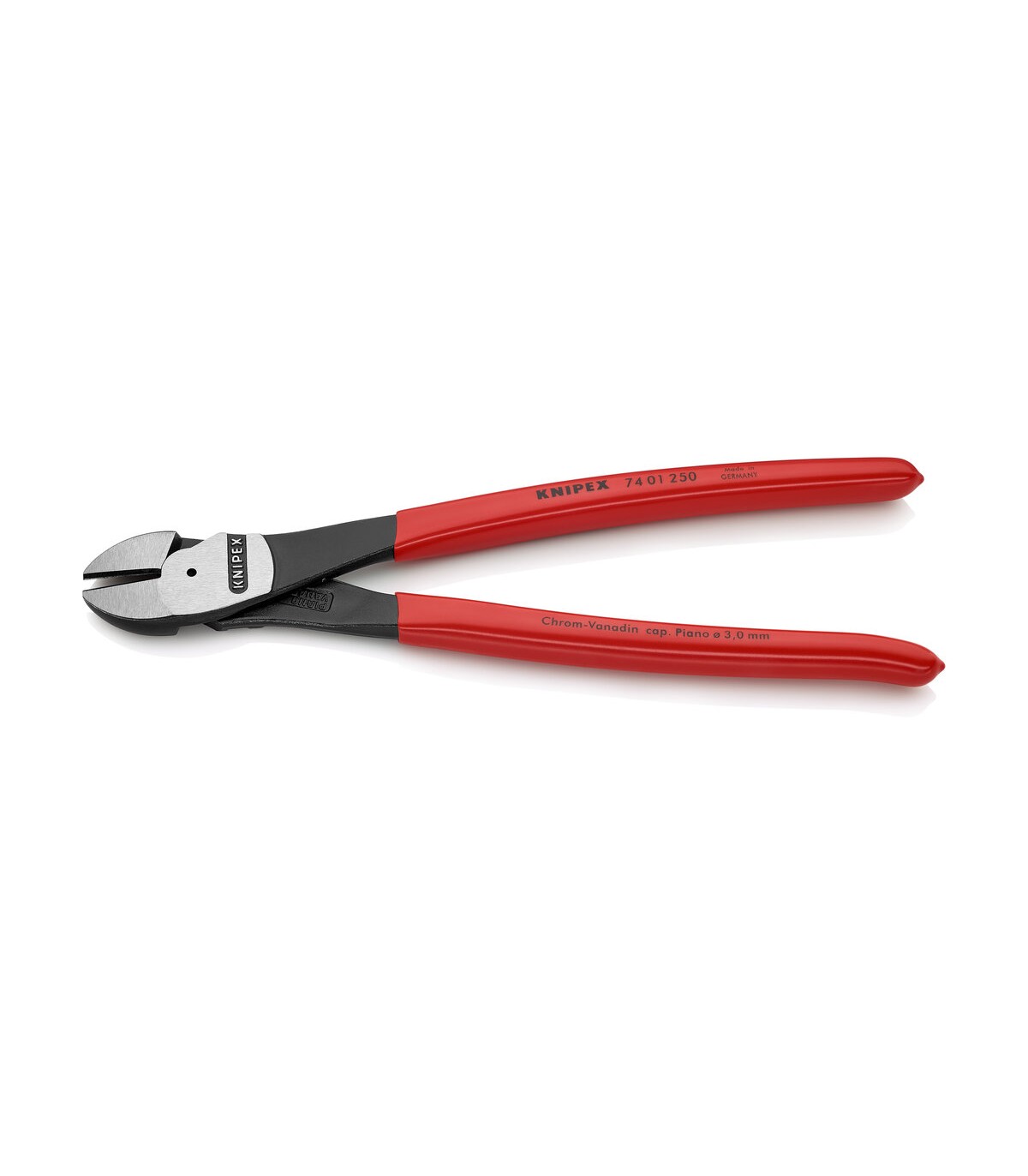 Para un uso duro continuo. Se requiere poco esfuerzo en el corte gracias a la perfecta coordinación del ángulo de corte y la proporción de las palancas. Filos de corte de precisión templados adicionalmente por inducción (aprox. 64 HRC de dureza del filo) para todos los tipos de alambres, incluyendo cuerda de piano. Los alicates de 250 de largo son los adecuados para cortar cables de cobre de hasta 16² y cables de aluminio de hasta 35².