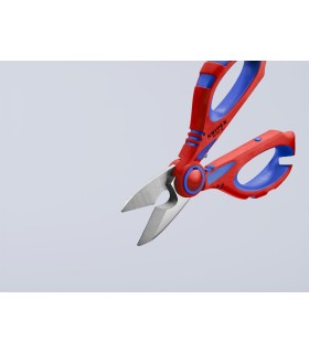 Filos de corte de precisión y afilados con dentado fino para un corte limpio y sin deslizamiento. Filo de corte con cortacables. Con portaherramientas de plástico. Mangos con fundas multicomponentes, reforzadas con fibras de vidrio. Tijeras universales para electricistas. Filos de corte de acero inoxidable, dureza de los filos de corte 56 HRC. cartulina autoservicio/blíster.