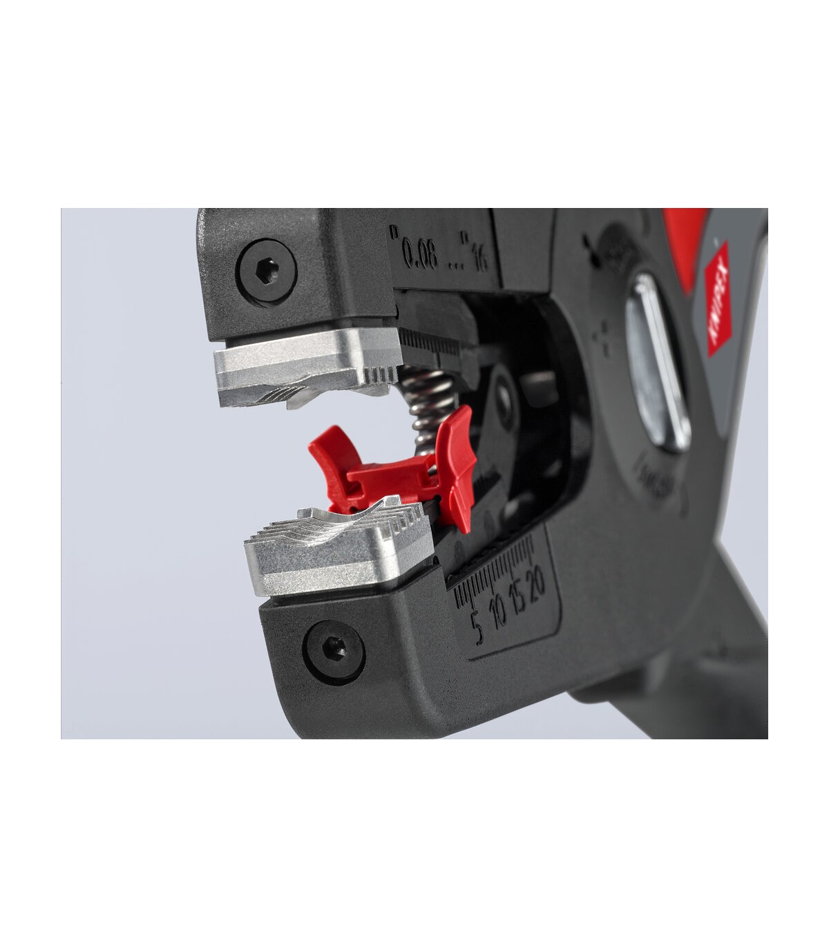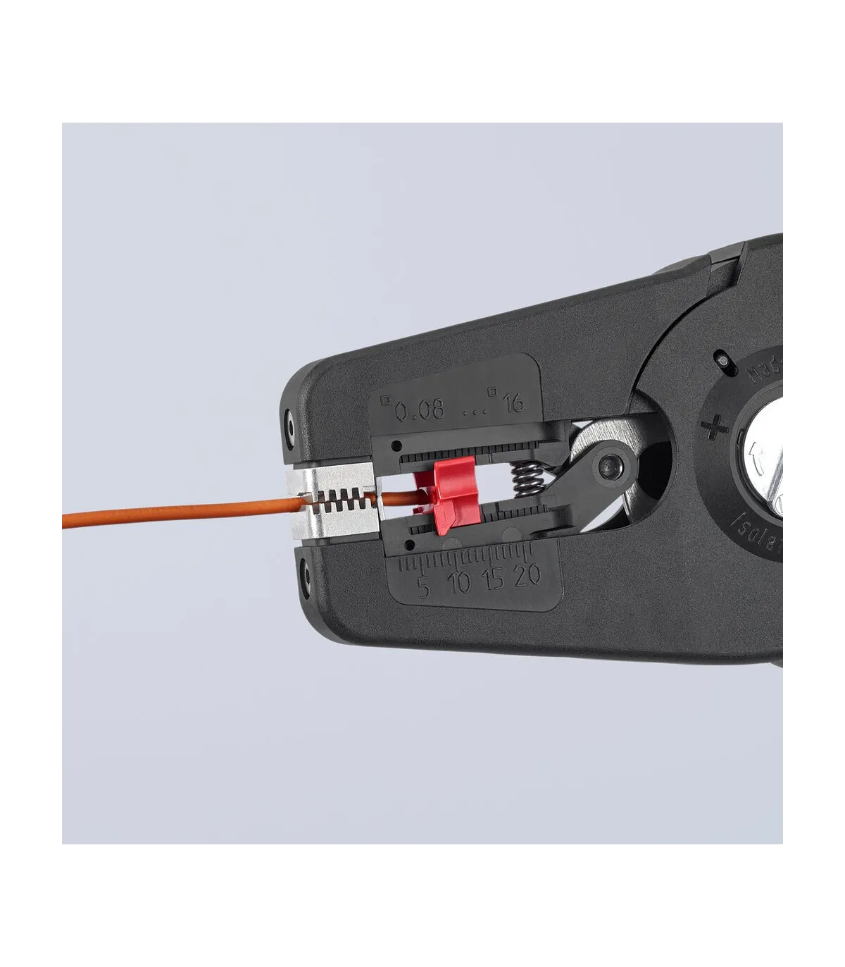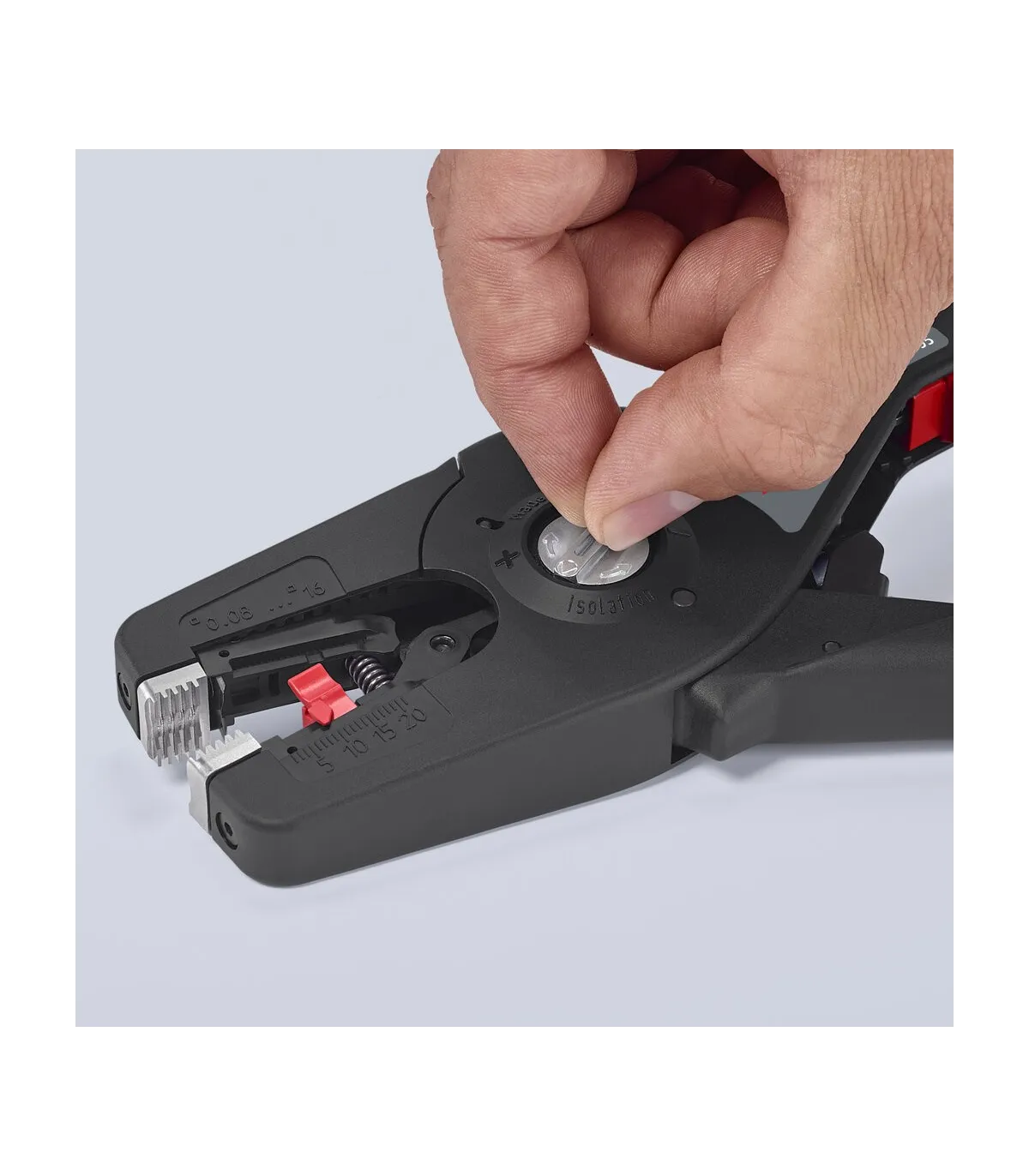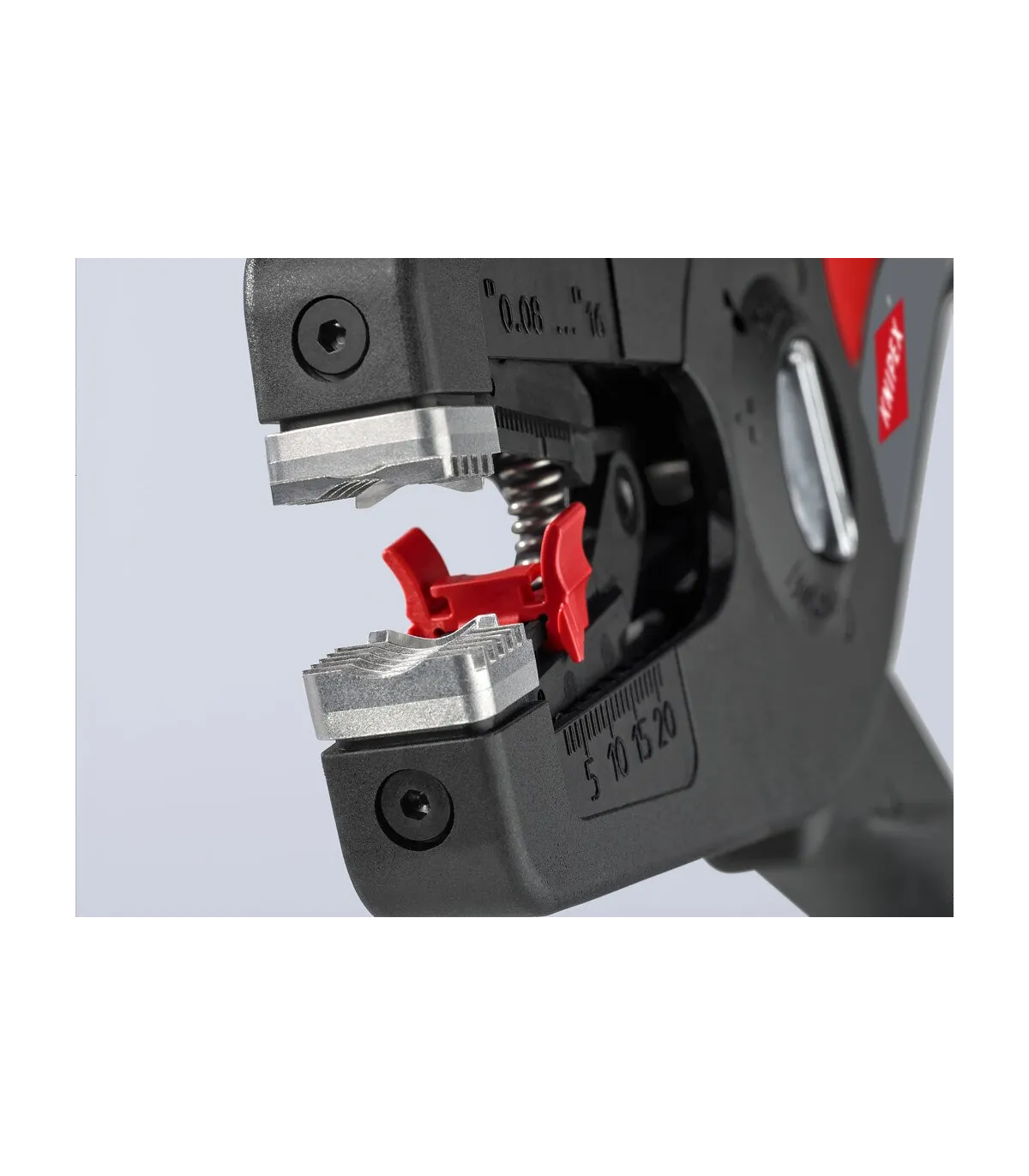 Pelado simple y preciso de cables finos y cables redondos con un rango de capacidad de 0,08 a 16² con un solo alicate. Buen agarre proporcionado gracias a las abrazaderas de sujeción metálicas acanaladas semicirculares; corte exacto mediante la cuchilla de pelado parabólica. Un automatismo patentado regula la profundidad del corte; el punto neutro del automatismo se puede ajustar en pasos precisos en condiciones de funcionamiento especiales (material de aislamiento, temperatura). Con tope longitudinal ajustable para trabajos repetitivos. Área de inscripción para personalización. Cómodo manejo gracias al mango ergonómico de dos componentes. Con anilla de fijación, adecuado para accesorios de KNIPEX Tethered Tools. Casete de cuchillas de sustitución sencilla.