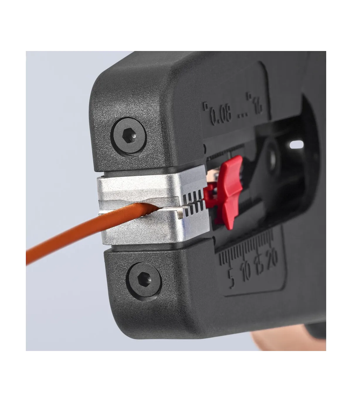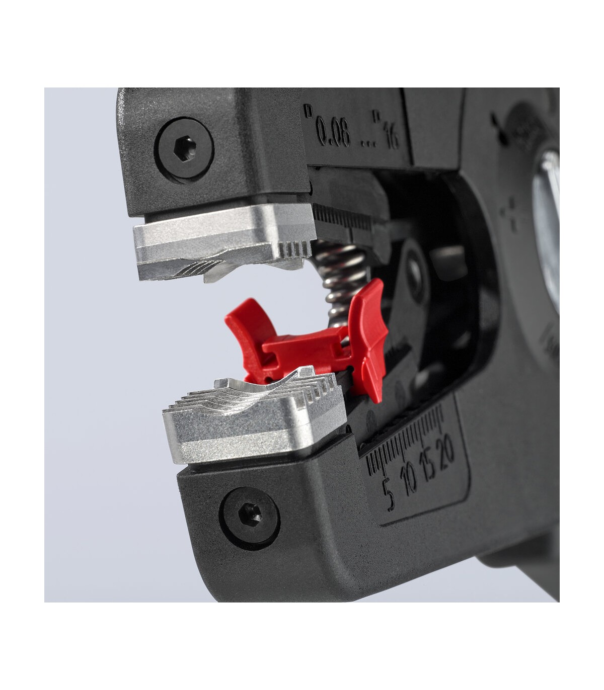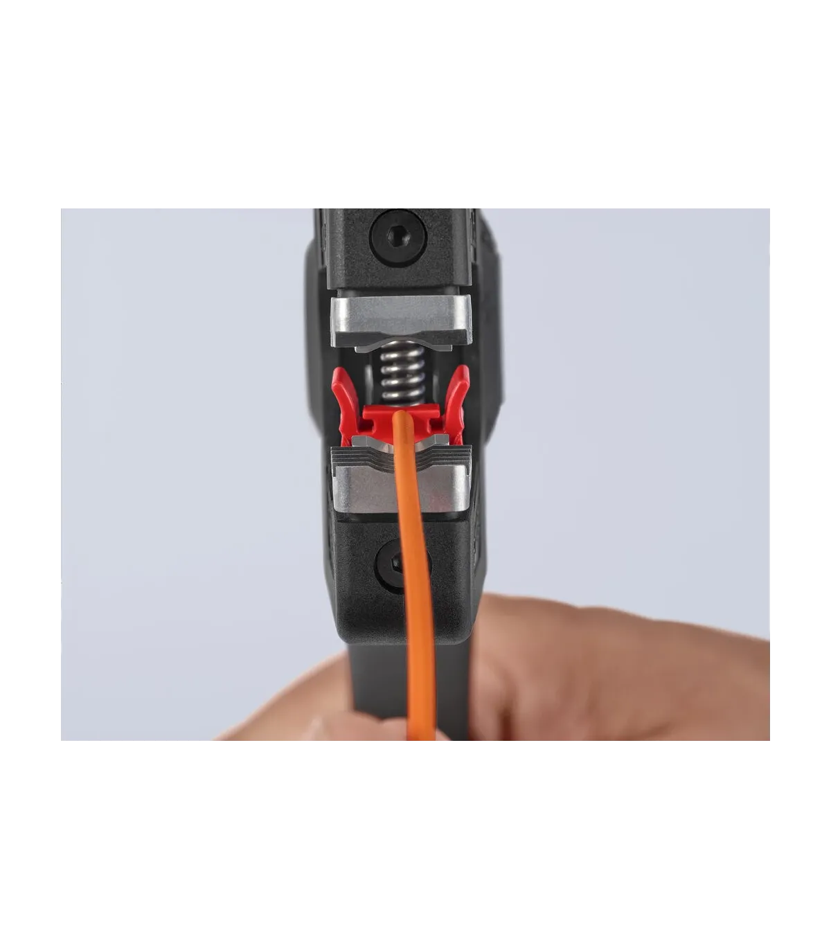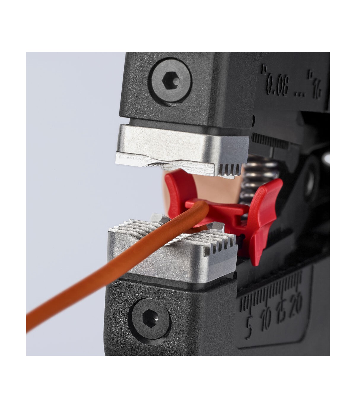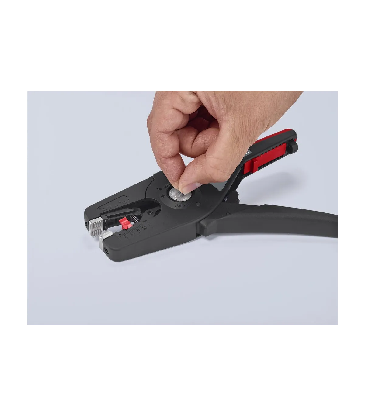 Pelado simple y preciso de cables finos y cables redondos con un rango de capacidad de 0,08 a 16² con un solo alicate. Buen agarre proporcionado gracias a las abrazaderas de sujeción metálicas acanaladas semicirculares; corte exacto mediante la cuchilla de pelado parabólica. Un automatismo patentado regula la profundidad del corte; el punto neutro del automatismo se puede ajustar en pasos precisos en condiciones de funcionamiento especiales (material de aislamiento, temperatura). Con tope longitudinal ajustable para trabajos repetitivos. Área de inscripción para personalización. Cómodo manejo gracias al mango ergonómico de dos componentes. Con anilla de fijación, adecuado para accesorios de KNIPEX Tethered Tools. Casete de cuchillas de sustitución sencilla.