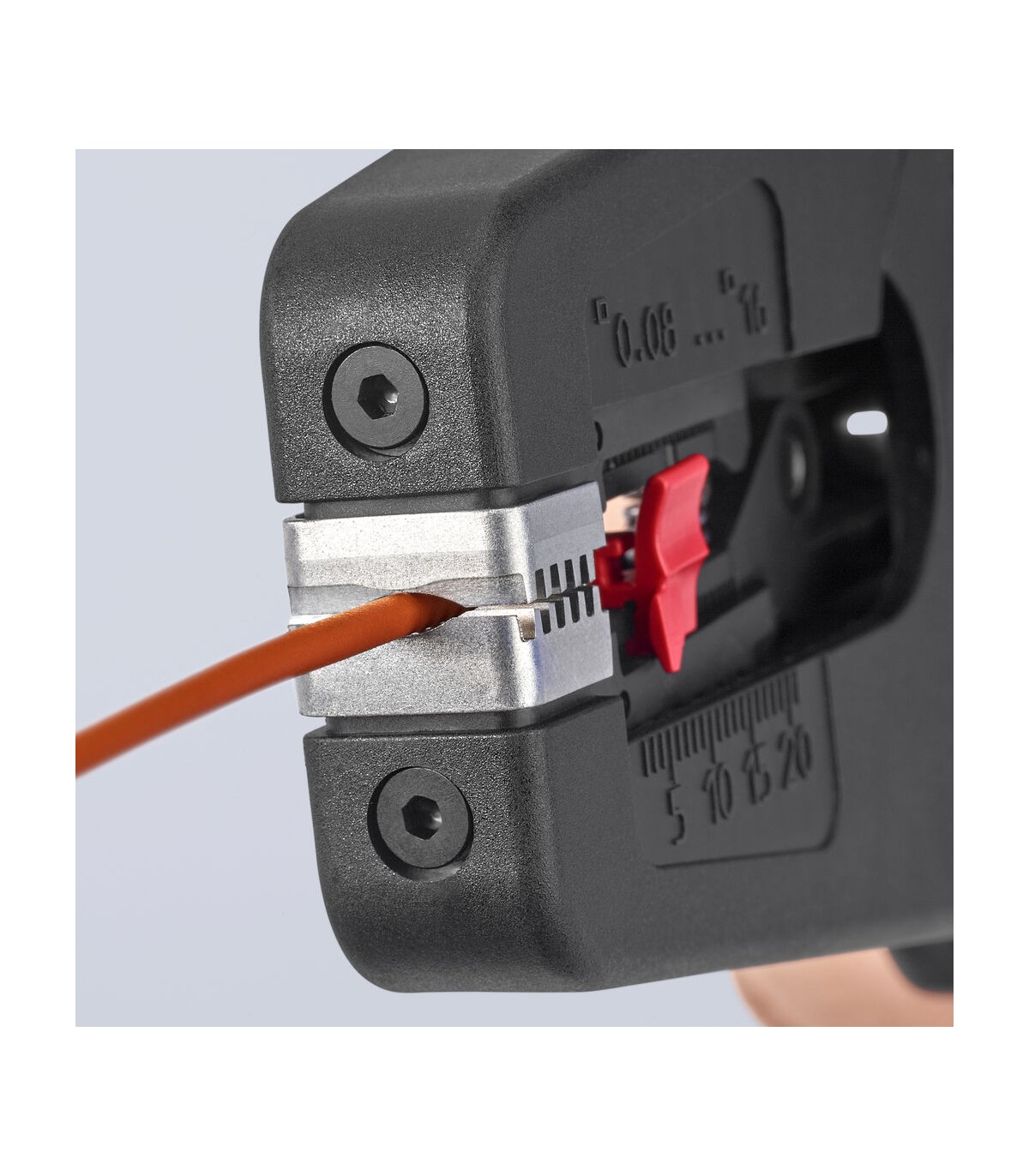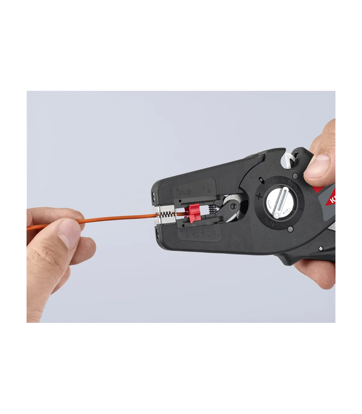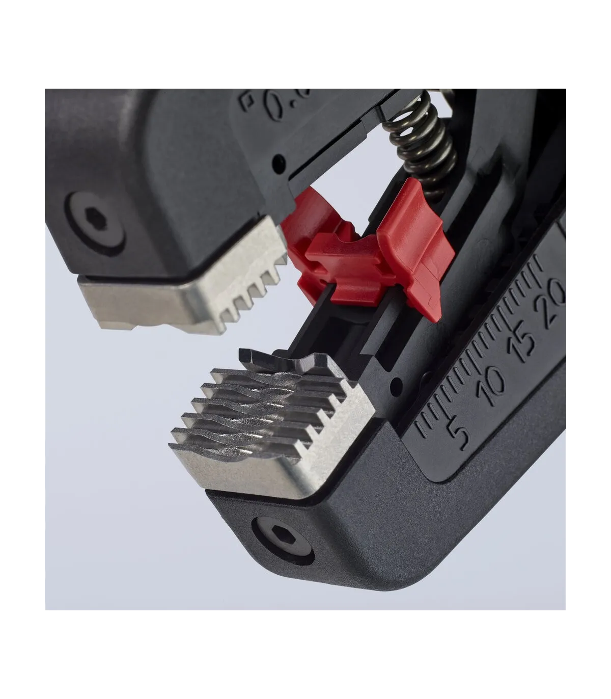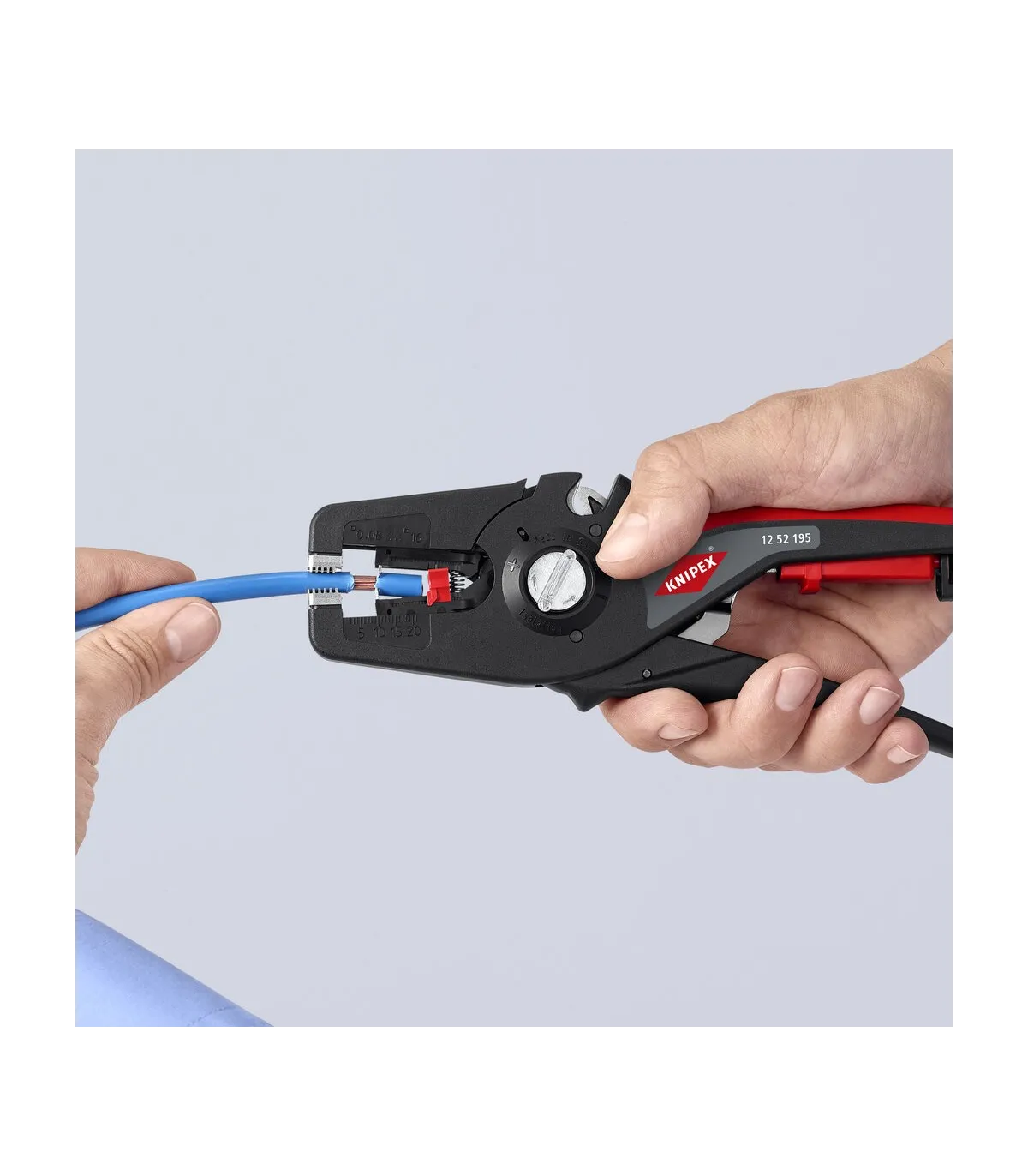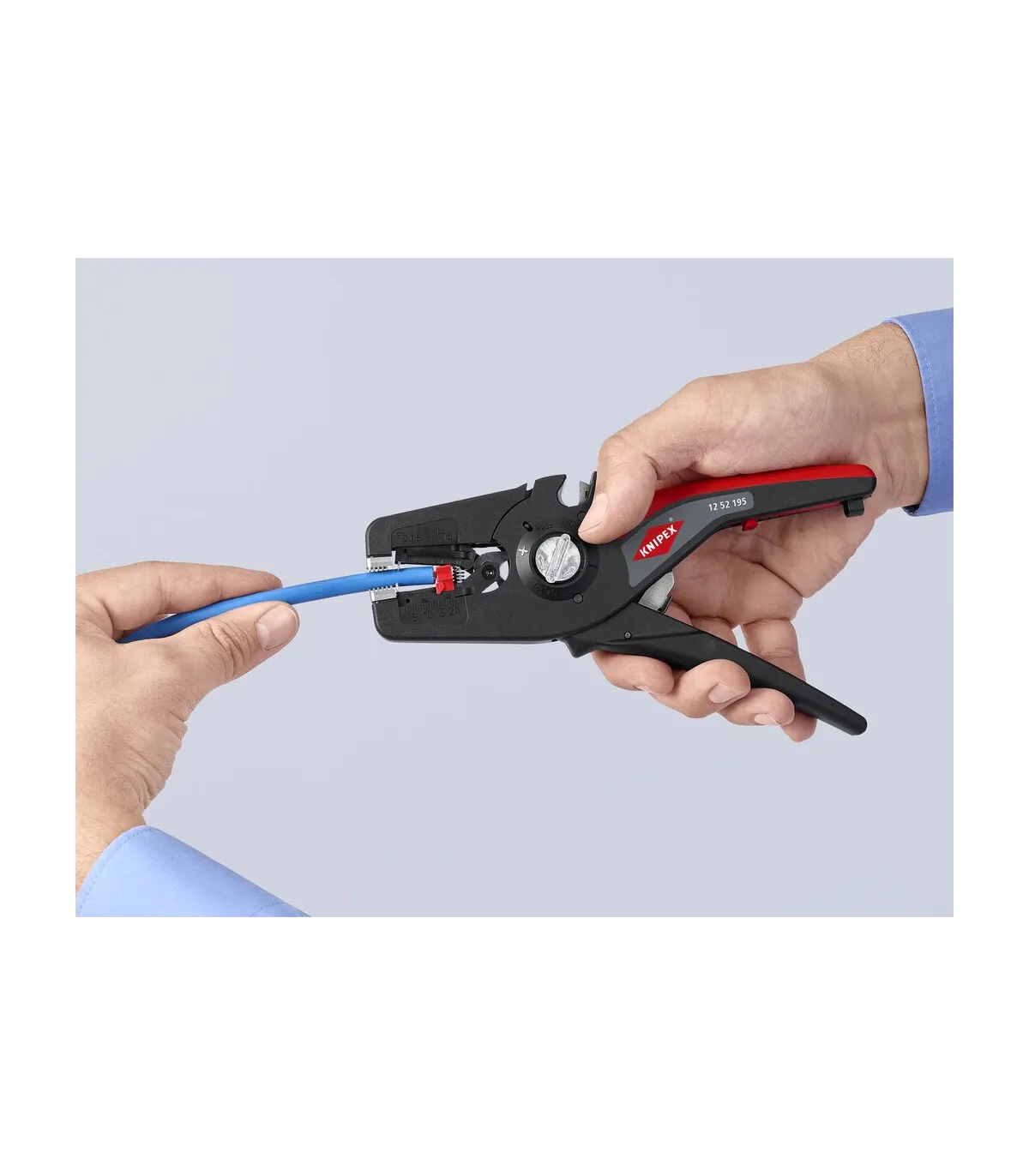Pelado simple y preciso de cables finos y cables redondos con un rango de capacidad de 0,08 a 16² con un solo alicate. Buen agarre proporcionado gracias a las abrazaderas de sujeción metálicas acanaladas semicirculares; corte exacto mediante la cuchilla de pelado parabólica. Un automatismo patentado regula la profundidad del corte; el punto neutro del automatismo se puede ajustar en pasos precisos en condiciones de funcionamiento especiales (material de aislamiento, temperatura). Con tope longitudinal ajustable para trabajos repetitivos. Área de inscripción para personalización. Cómodo manejo gracias al mango ergonómico de dos componentes. Con anilla de fijación, adecuado para accesorios de KNIPEX Tethered Tools. Casete de cuchillas de sustitución sencilla.