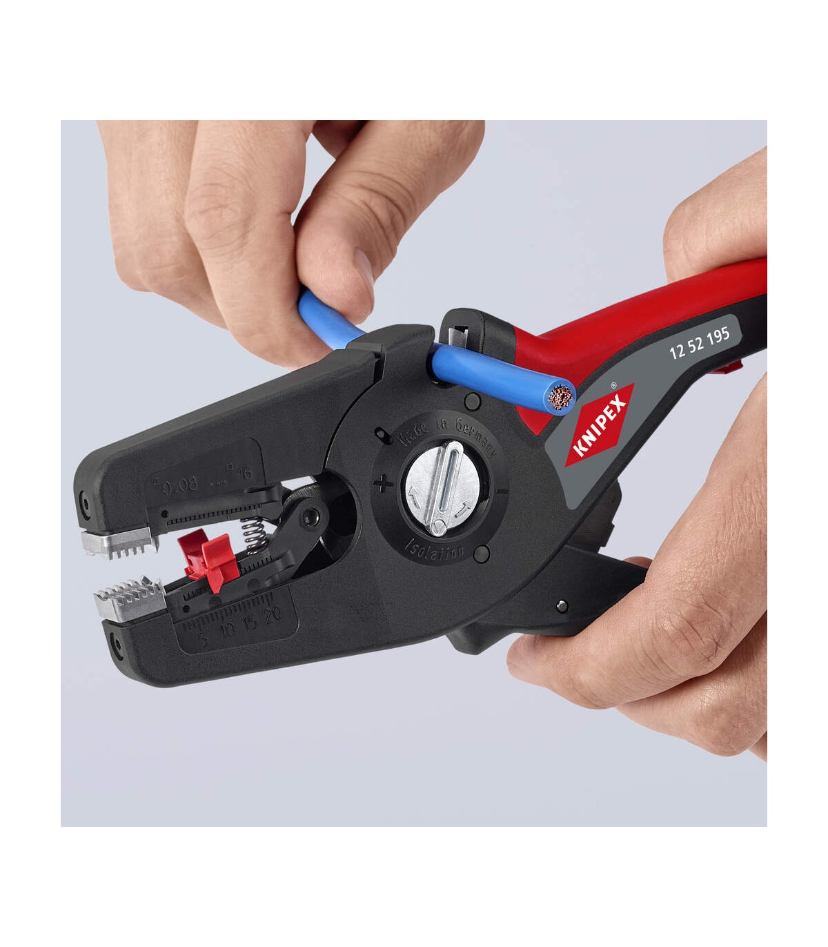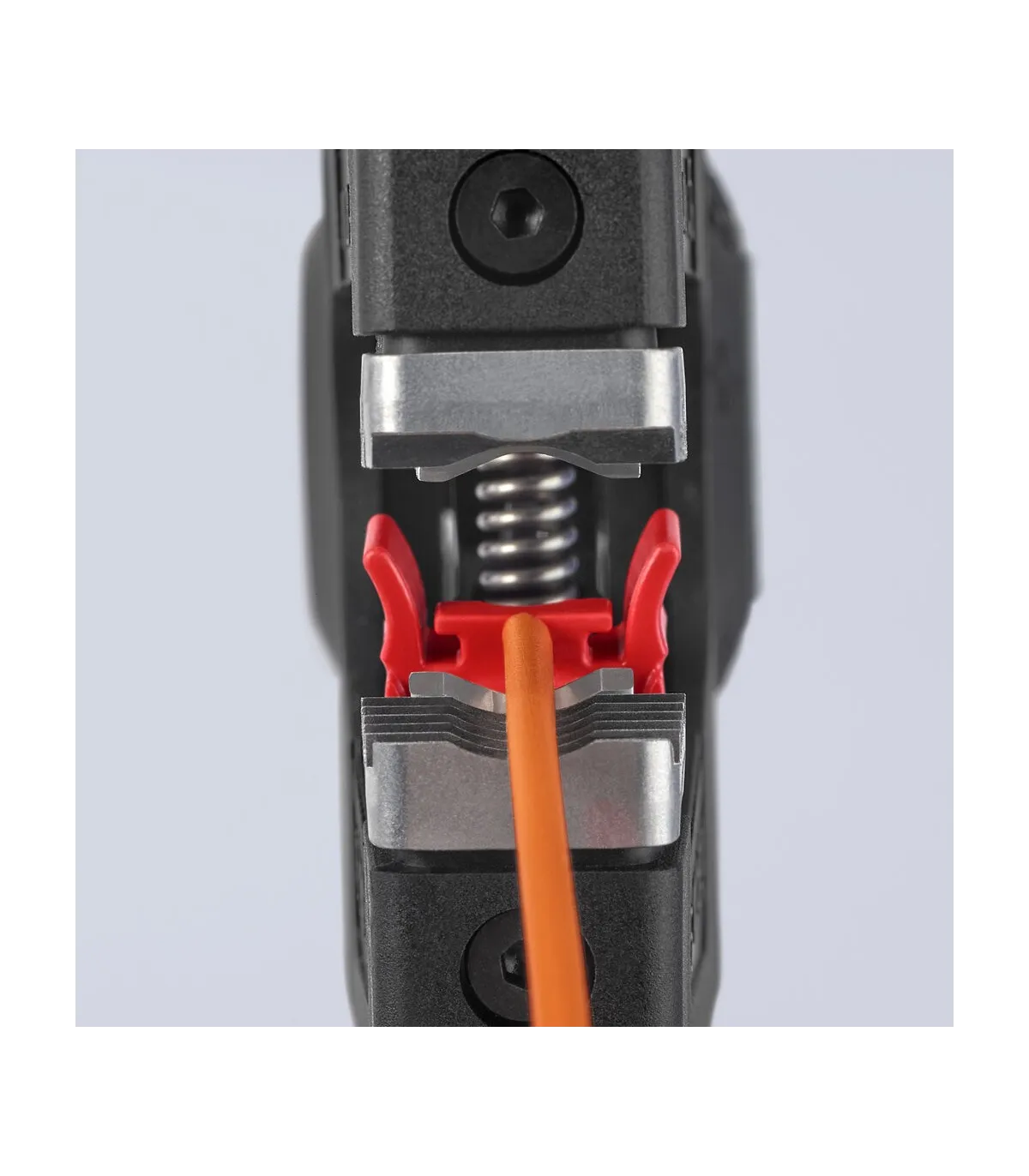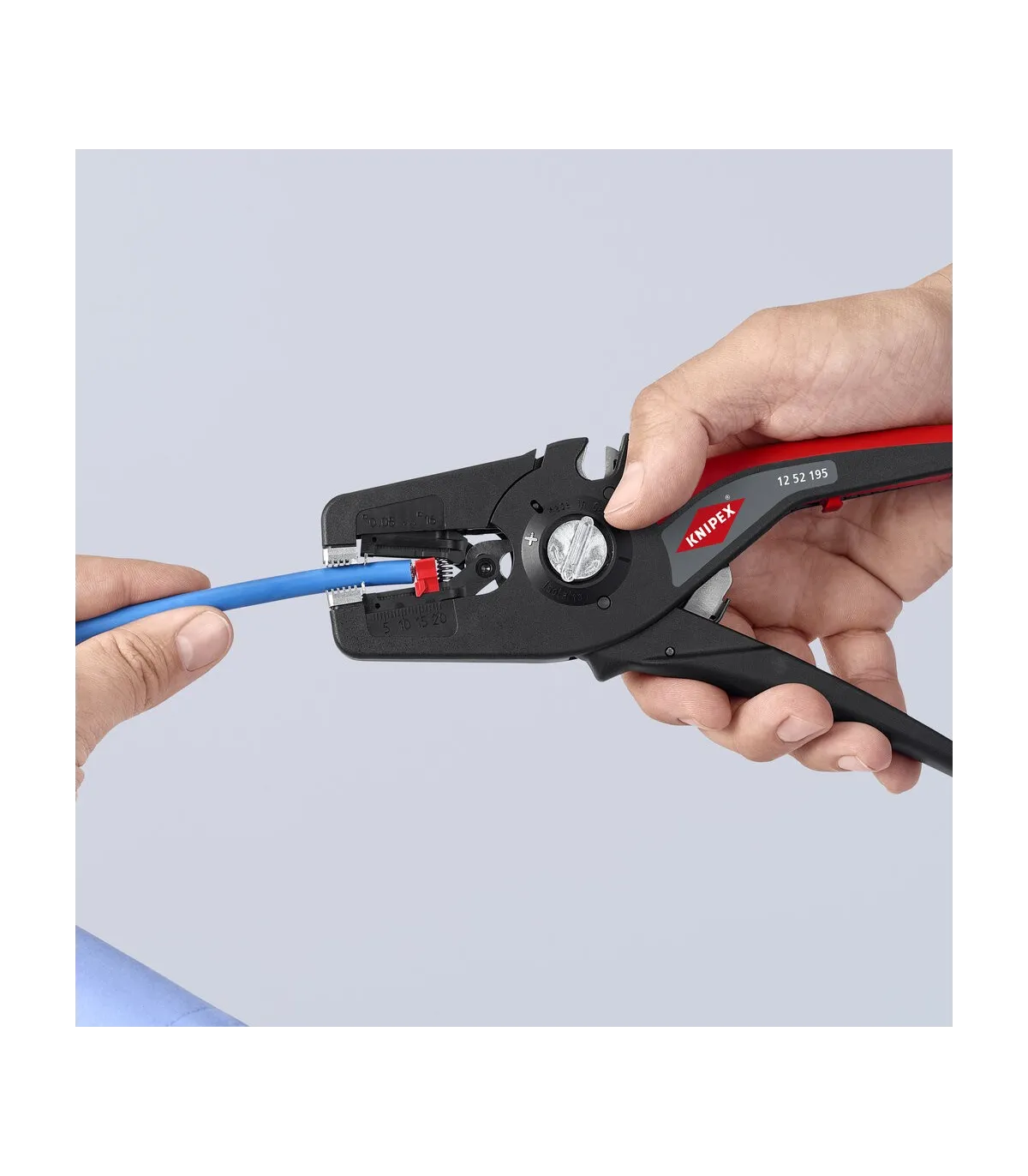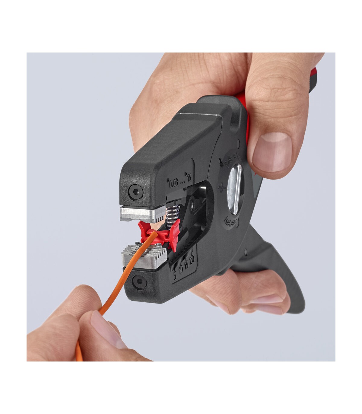 Pelado simple y preciso de cables finos y cables redondos con un rango de capacidad de 0,08 a 16² con un solo alicate. Buen agarre proporcionado gracias a las abrazaderas de sujeción metálicas acanaladas semicirculares; corte exacto mediante la cuchilla de pelado parabólica. Un automatismo patentado regula la profundidad del corte; el punto neutro del automatismo se puede ajustar en pasos precisos en condiciones de funcionamiento especiales (material de aislamiento, temperatura). Con tope longitudinal ajustable para trabajos repetitivos. Área de inscripción para personalización. Cómodo manejo gracias al mango ergonómico de dos componentes. Con anilla de fijación, adecuado para accesorios de KNIPEX Tethered Tools. Casete de cuchillas de sustitución sencilla.