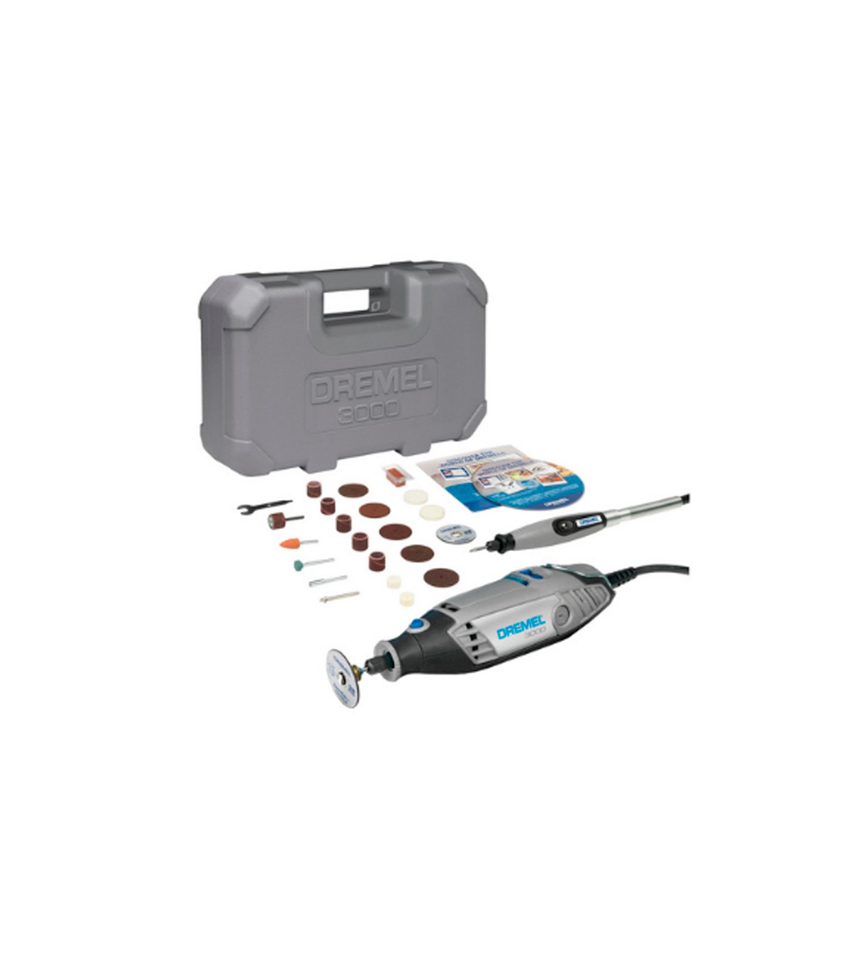 En este kit se incluye la multiherramienta Dremel 3000, el eje flexible Dremel de alta calidad y 25 accesorios Dremel originales incluido EZ SpeedClic.